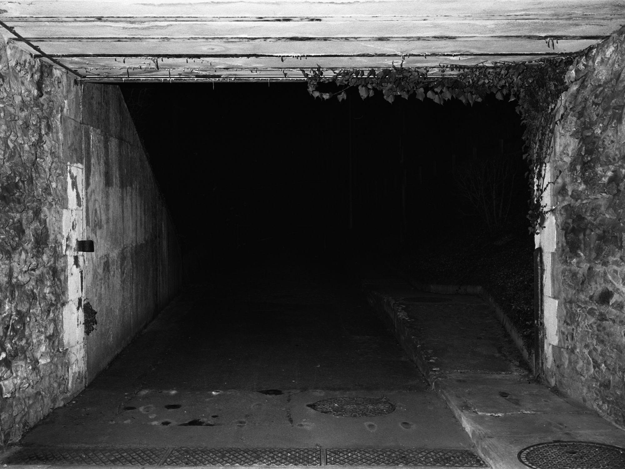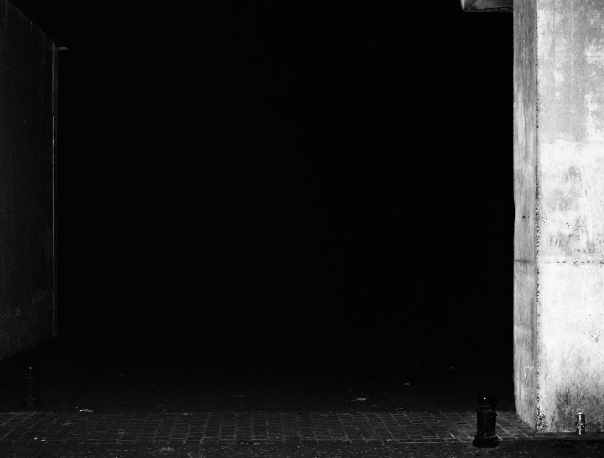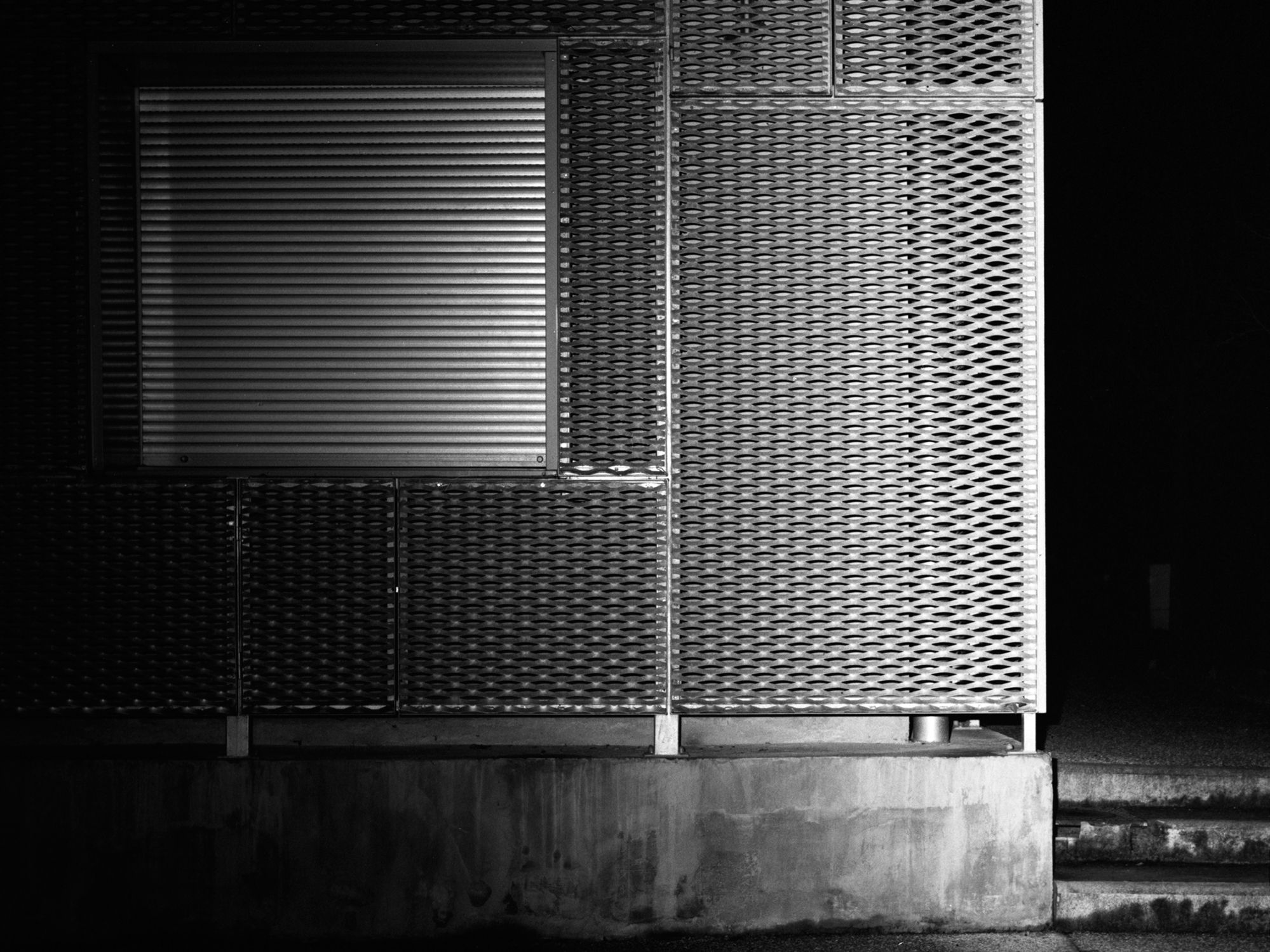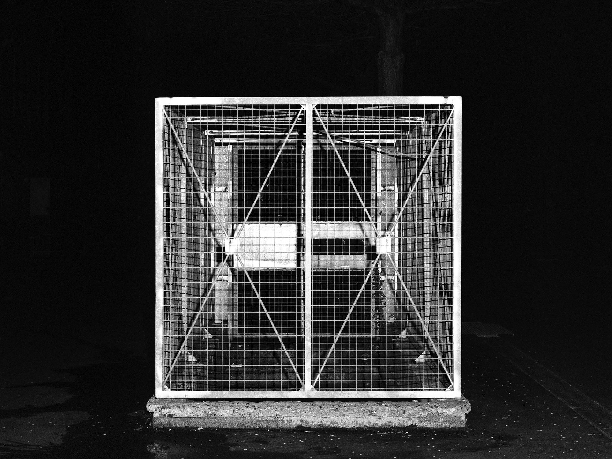 Le projet de Karim Kal suit la ligne D du RER, de Grigny à Corbeil. Les photographies, prises de nuit au flash à courte portée, sont à la fois inquiétantes et familières. Car, au-delà de l'étrangeté de l'image qui se présente, nous connaissons intimement ces formes et ces matériaux, ces passages, ces abris, ces raccourcis qui mènent plus vite à la sortie ou au prochain train. Dans le contraste cru du noir et blanc apparaît également la tension entre l'espace collectif et l'espace privé, entre la planification et l'utilisation, entre l'autorité et la transgression.