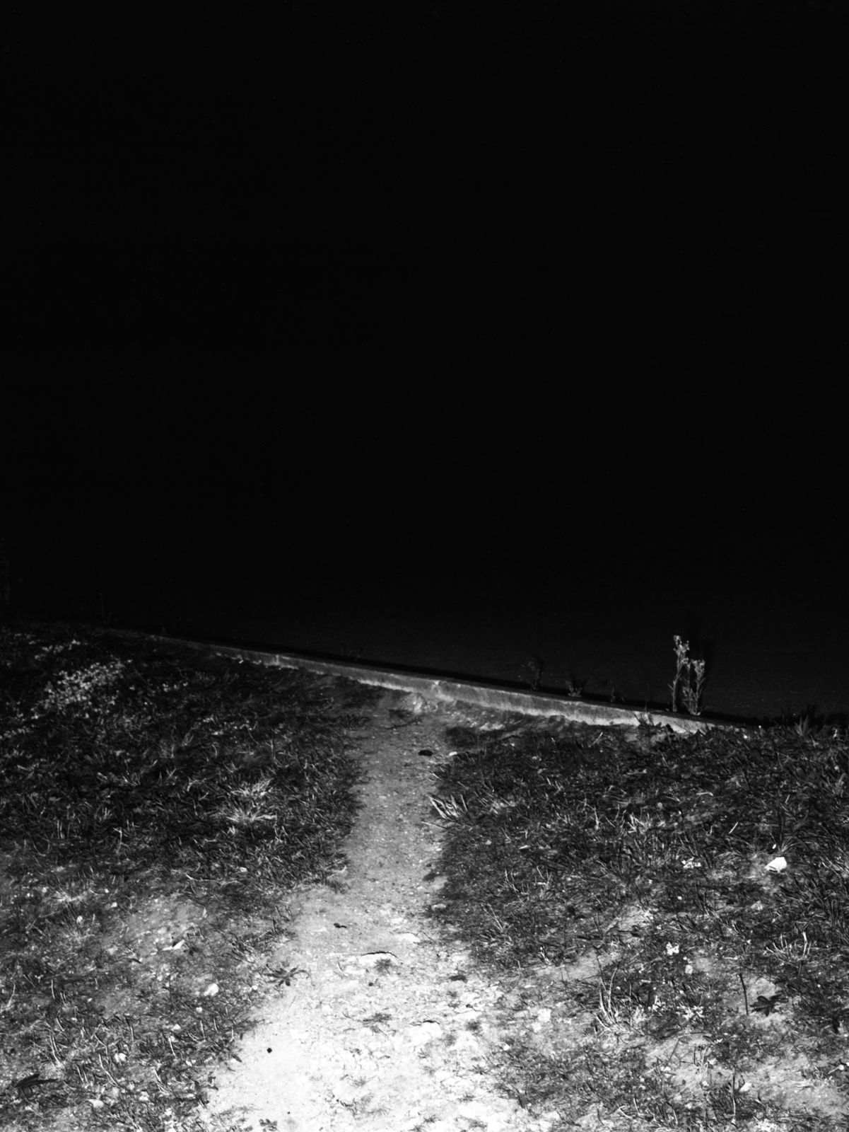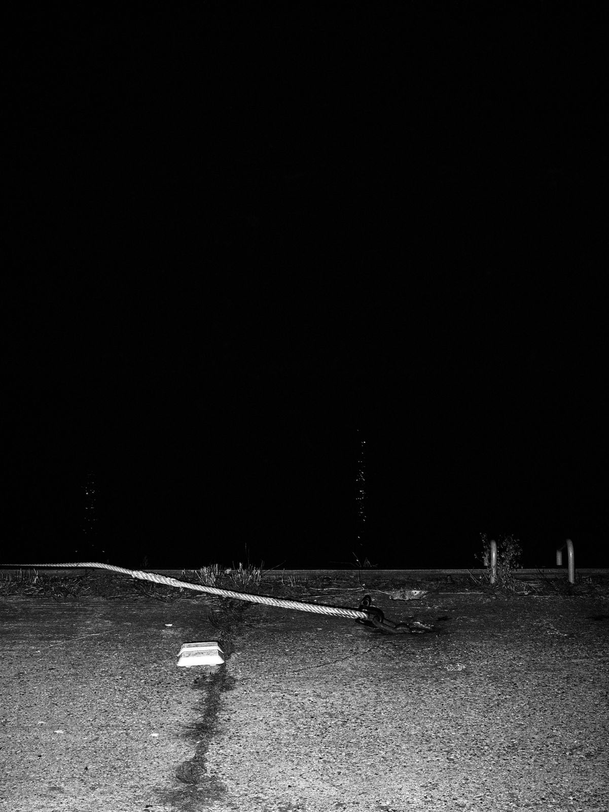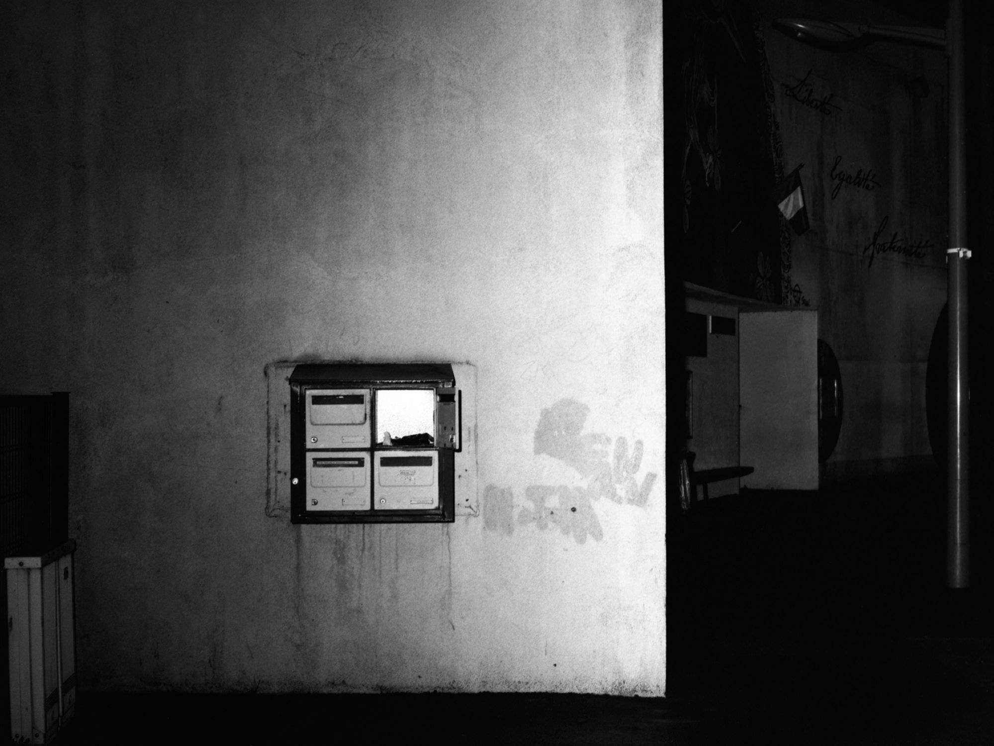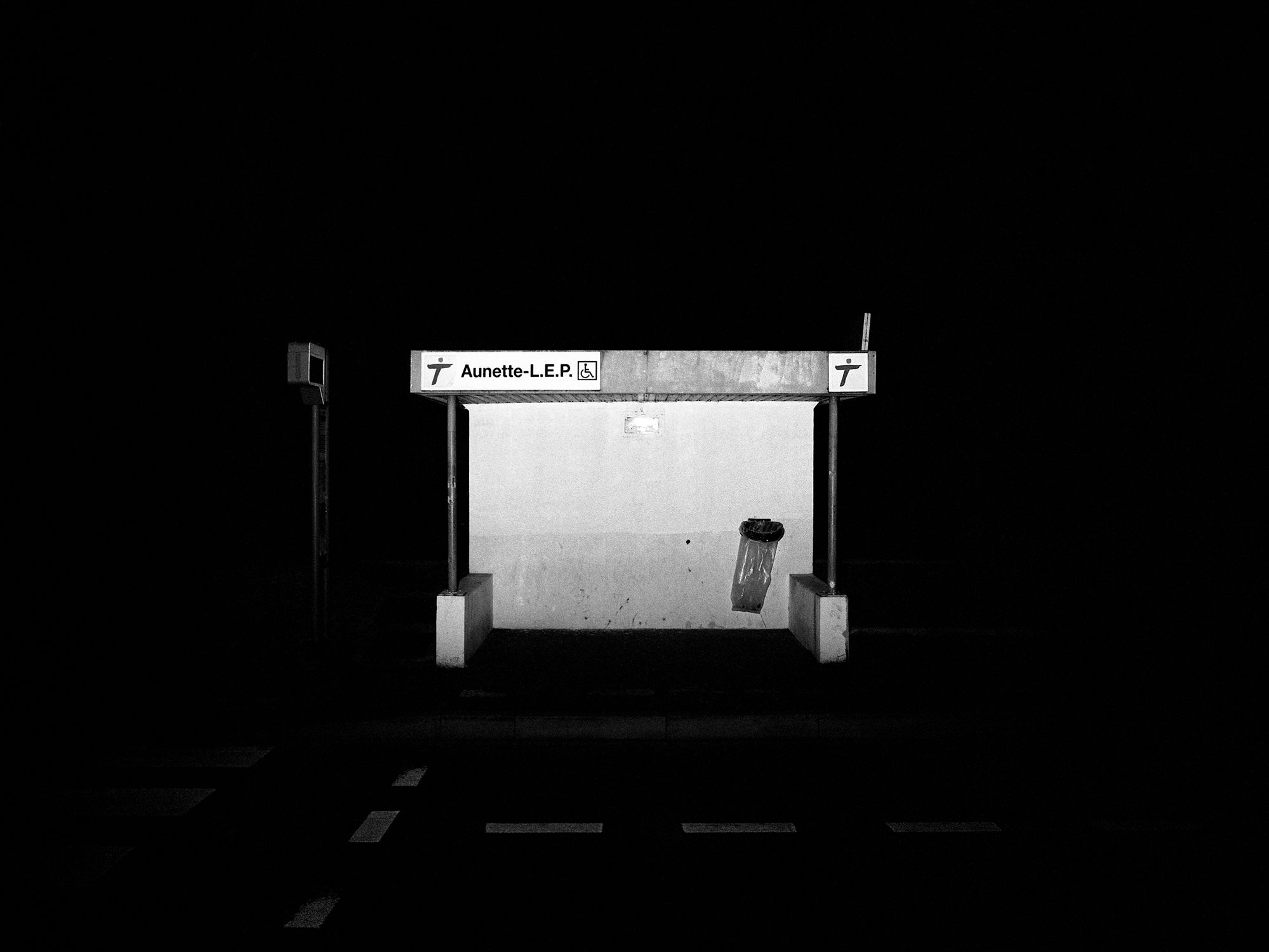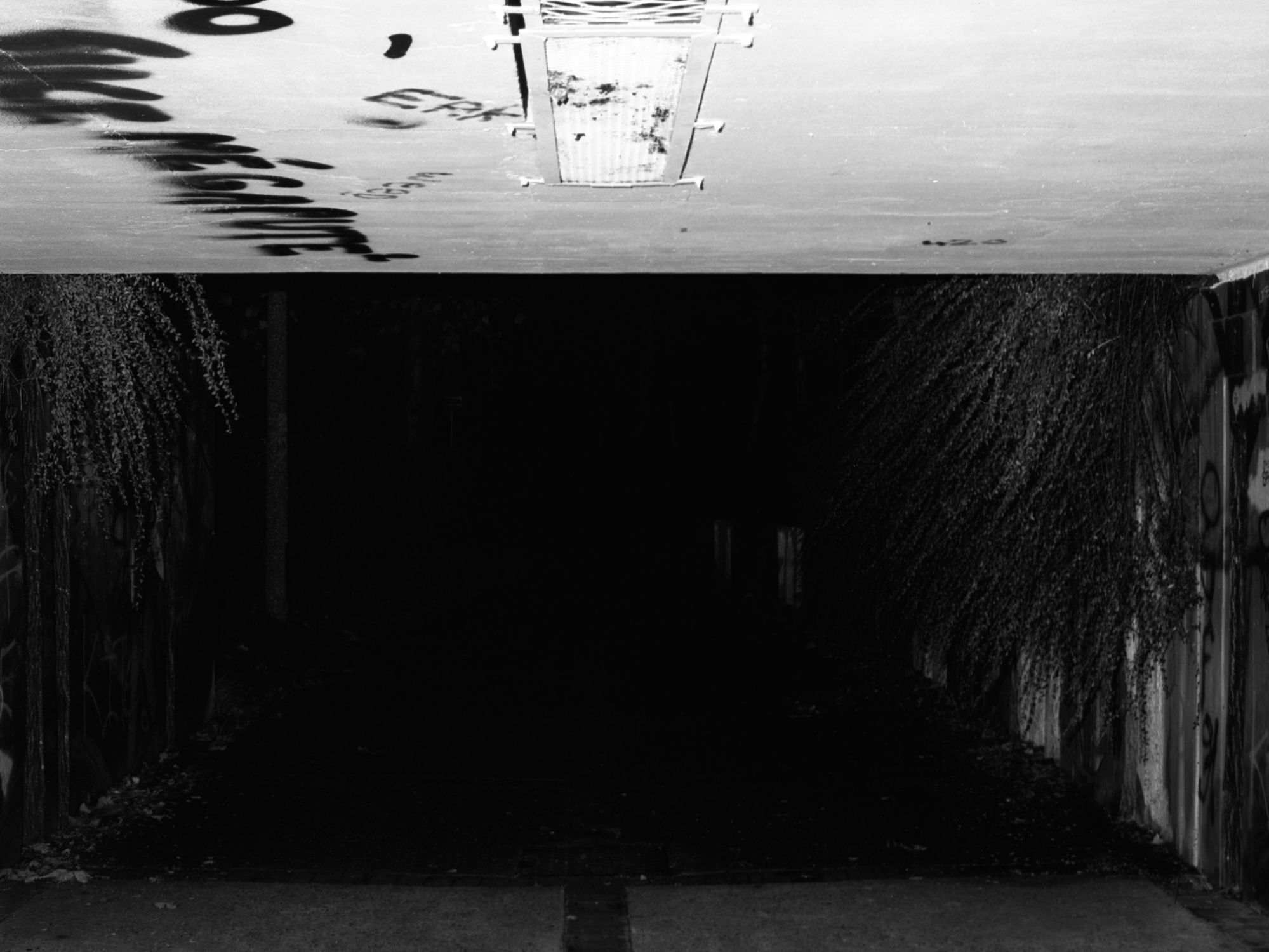 Le projet de Karim Kal suit la ligne D du RER, de Grigny à Corbeil. Les photographies, prises de nuit au flash à courte portée, sont à la fois inquiétantes et familières. Car, au-delà de l'étrangeté de l'image qui se présente, nous connaissons intimement ces formes et ces matériaux, ces passages, ces abris, ces raccourcis qui mènent plus vite à la sortie ou au prochain train. Dans le contraste cru du noir et blanc apparaît également la tension entre l'espace collectif et l'espace privé, entre la planification et l'utilisation, entre l'autorité et la transgression.