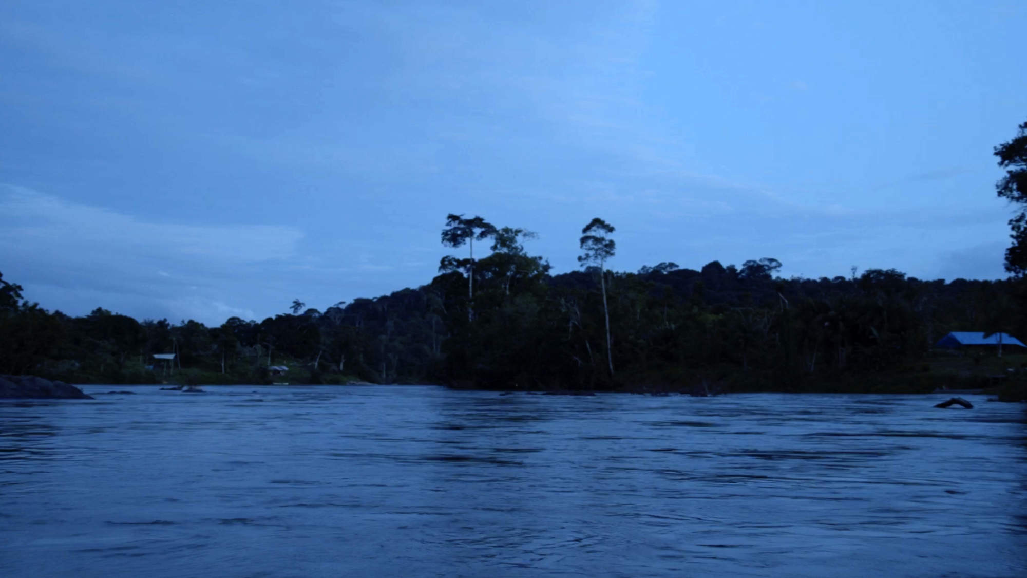 Le tournage du clip d’Olivier à la Crique Diamant est terminé. La nuit tombe et la fête continue doucement. Il n’y a plus d’essence, alors on accroche les deux pirogues ensemble et le petit groupe se laisse dériver, moteur à l’arrêt, sur le fleuve.