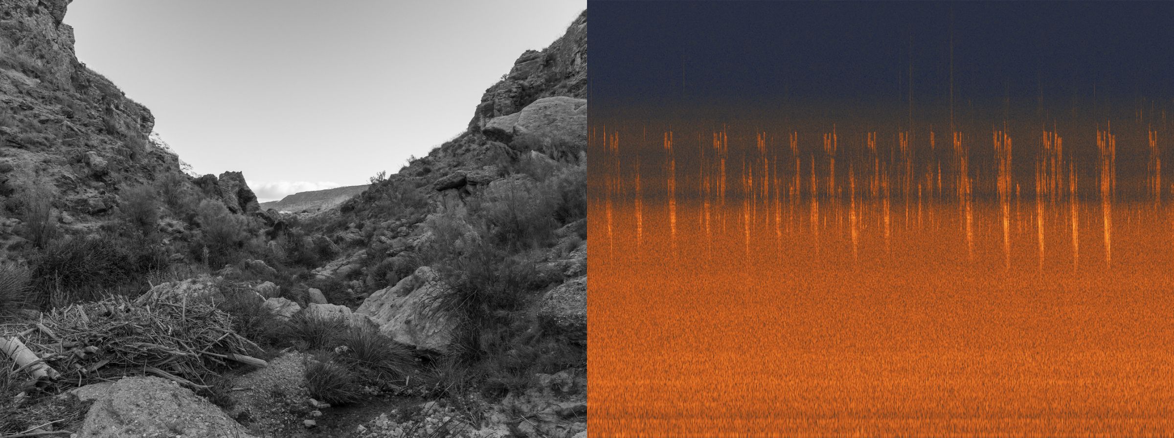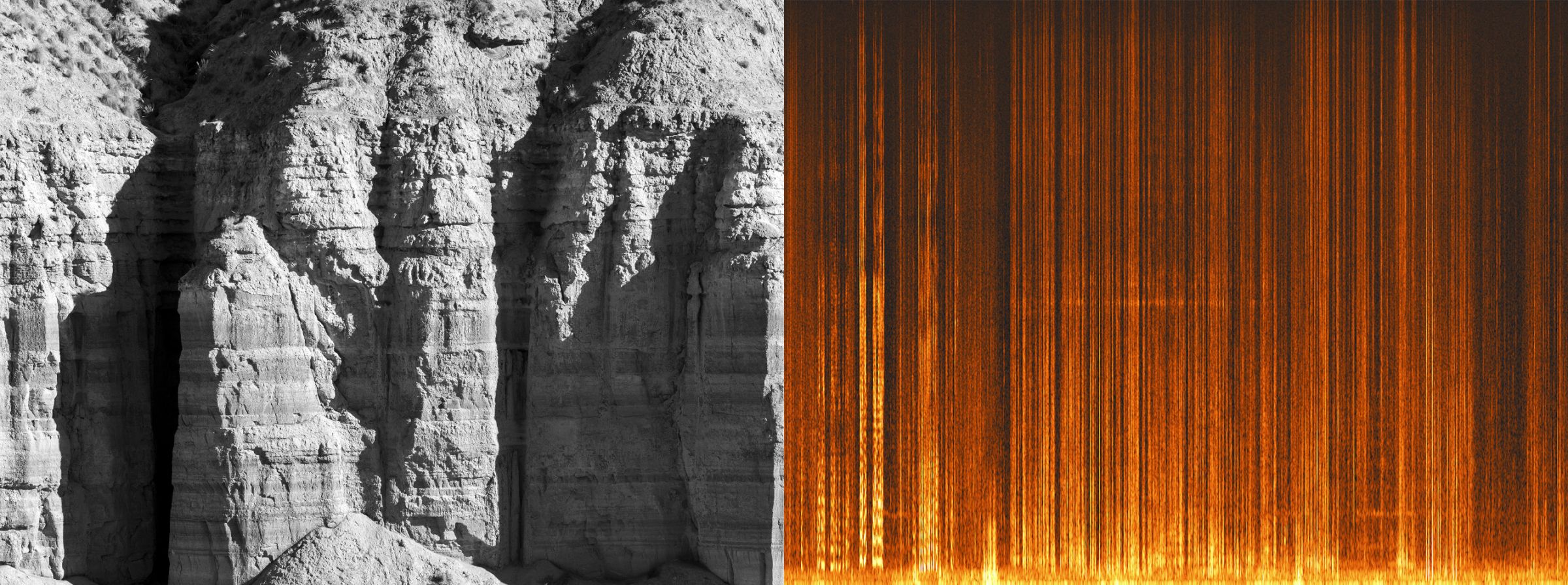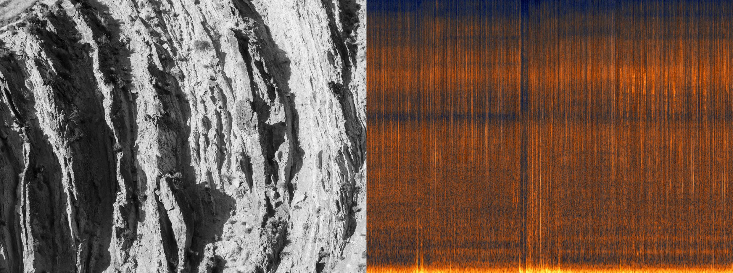 Le spectre audio se construit de la même manière que le paysage photographié : par couches de sédiments. La partie inférieure de l’image renvoie aux basses fréquences et autres vibrations inaudibles, représentant en quelque sorte le sol et la roche dure de ce paysage sonore. En revanche, les ponctuations répétitives et régulières au centre de l’image représentent des événements tels que les chants d’oiseaux et les mouvements d’air. Ainsi, les deux images, côte à côte, révèlent non seulement une histoire géologique du paysage étudié, mais témoignent aussi d’un geste éphémère : mon passage dans ce désert.