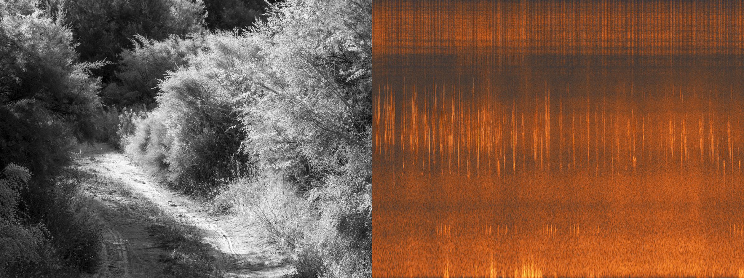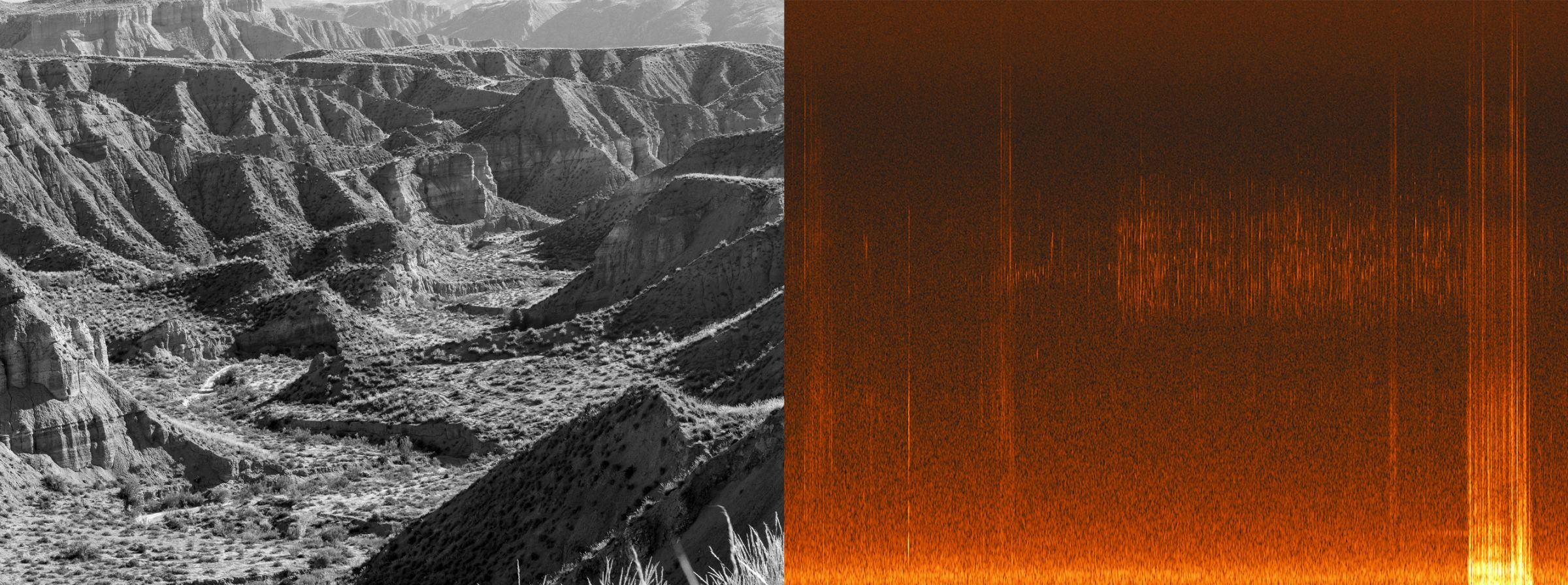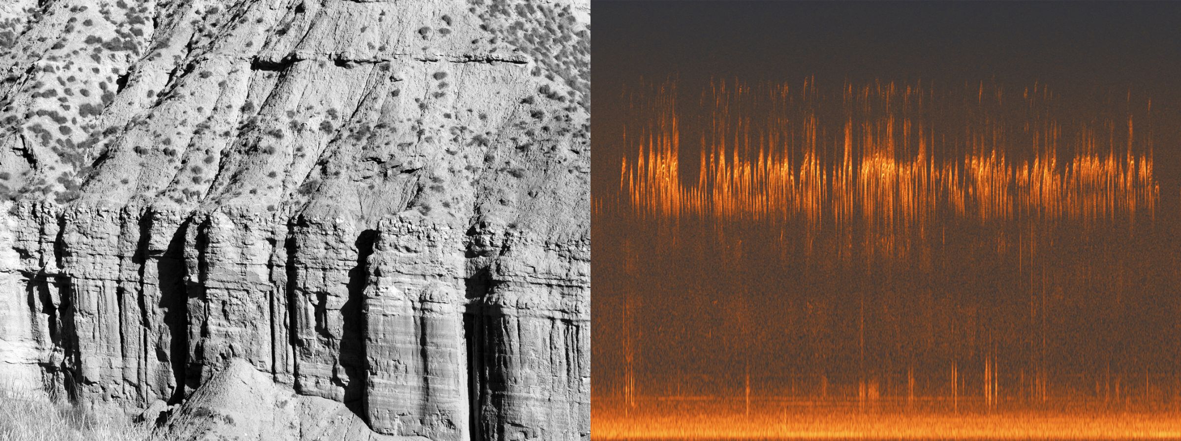 Le spectre audio se construit de la même manière que le paysage photographié : par couches de sédiments. La partie inférieure de l’image renvoie aux basses fréquences et autres vibrations inaudibles, représentant en quelque sorte le sol et la roche dure de ce paysage sonore. En revanche, les ponctuations répétitives et régulières au centre de l’image représentent des événements tels que les chants d’oiseaux et les mouvements d’air. Ainsi, les deux images, côte à côte, révèlent non seulement une histoire géologique du paysage étudié, mais témoignent aussi d’un geste éphémère : mon passage dans ce désert.