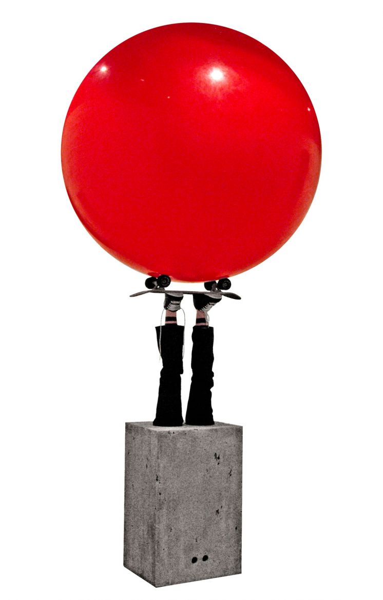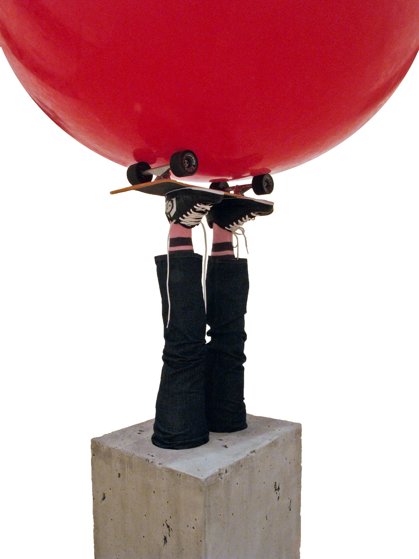 Sculpture, polystyrène extrudé, peinture, bois, vêtements, skateboard, ballon géant, 360 x 180 x 180 cm