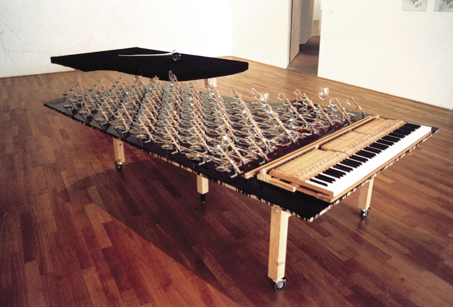 Installation, bois, quincaillerie, fils, laque, velours, élastiques, verre, clavier, lames de rasoir, cor en verre soufflé, vidéo ; chaque piano : 290 x 150 x 80 cm ; cor : 130 cm