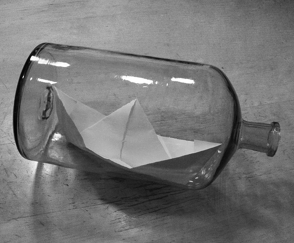 Un simple bateau en papier plié, de ceux dont on fait parfois des chapeaux de fortune, est coincé dans une bouteille de verre.