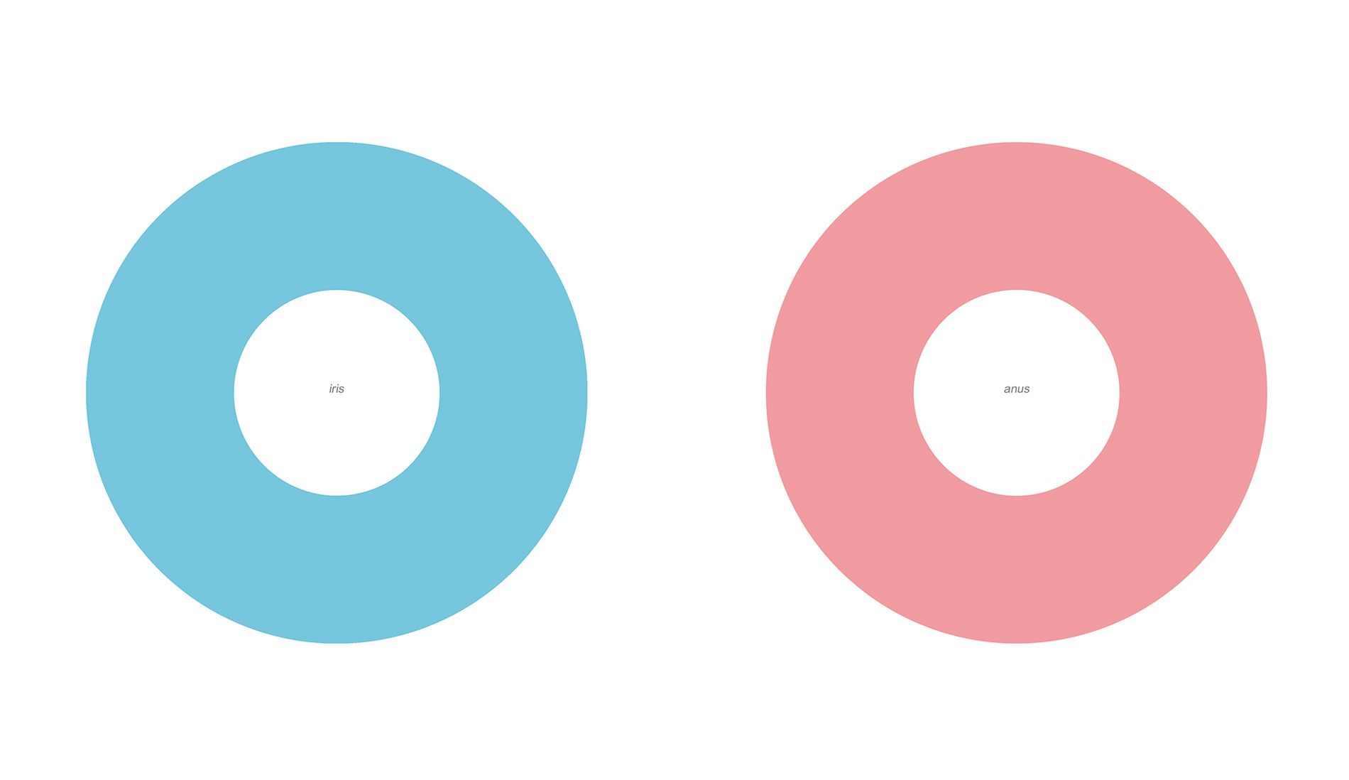 En s'en approchant, on distingue deux inscriptions en leur centre : iris et anus.