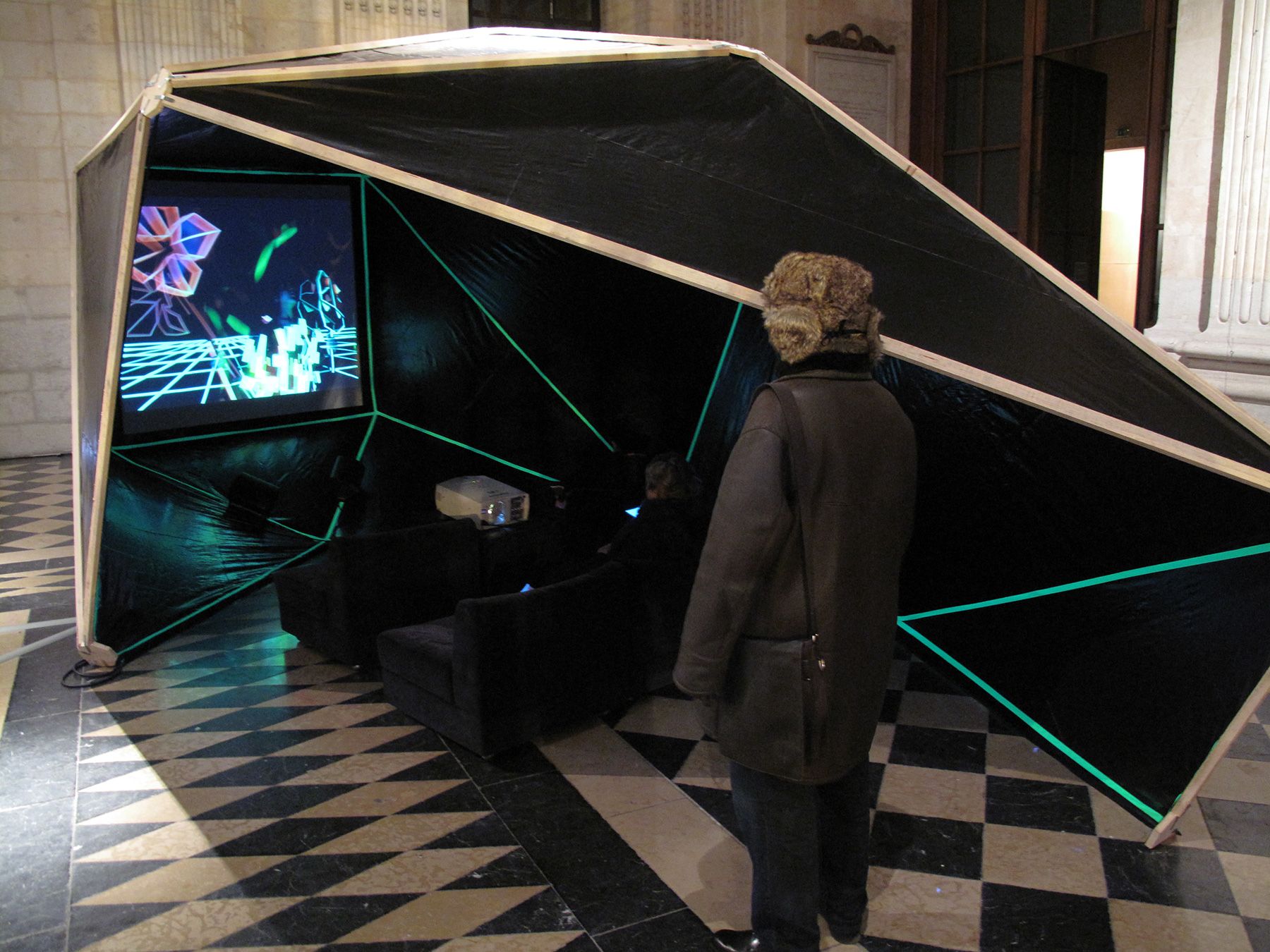 Bois, bâche agricole noire, toile écran, lumière noire, adhésif fluorescent, projecteur vidéo, amplificateur, enceintes, 650 x 300 x 250 cm