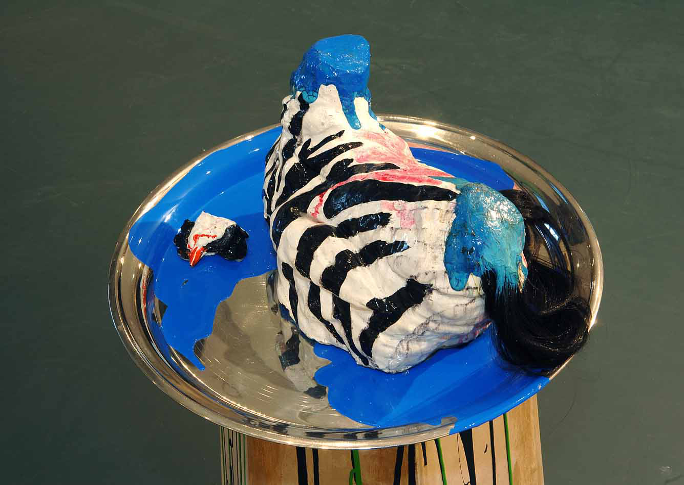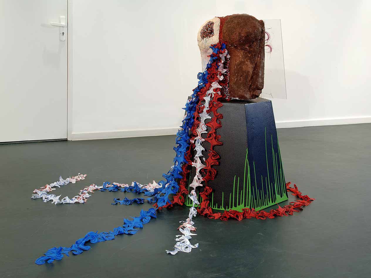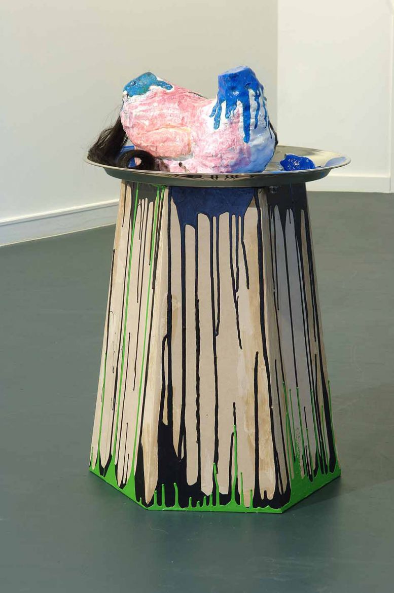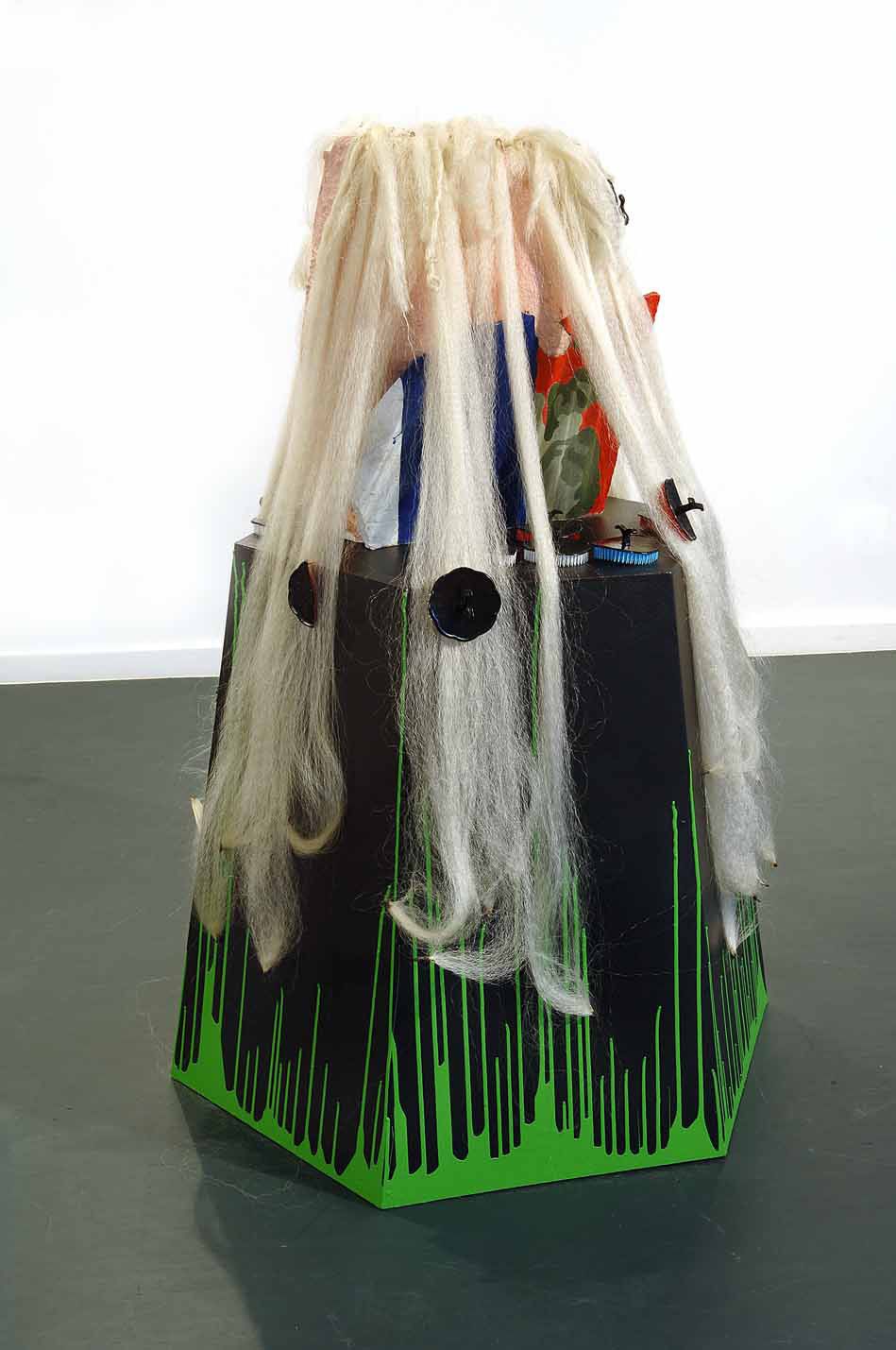 Plâtre, peinture acrylique, résine, cheveux synthétiques, brosses en plastique, peinture glycéro, bois, 150 x 50 x 45 cm