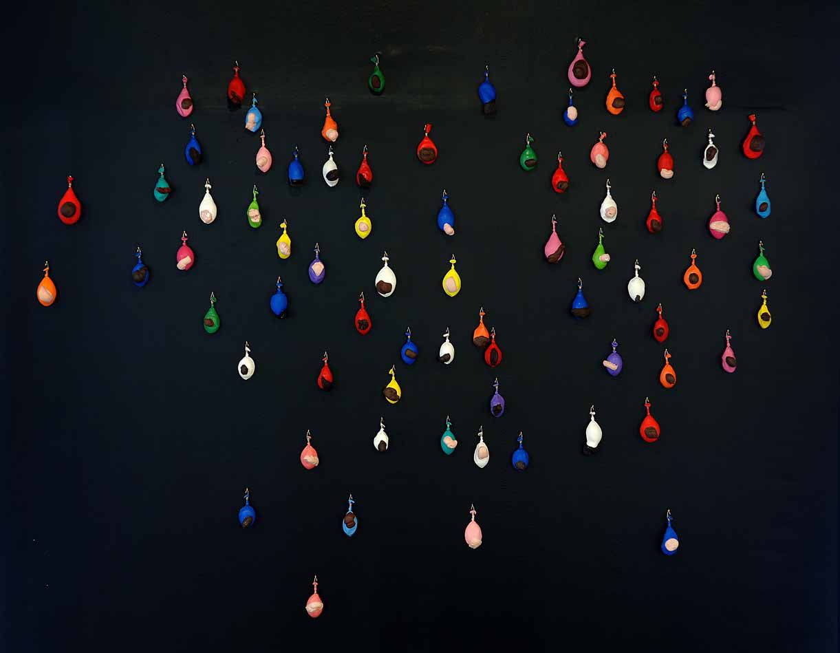 Blanc de Meudon sur vitres, 76 ballons de baudruche, plâtre, peinture acrylique, crochets sandow