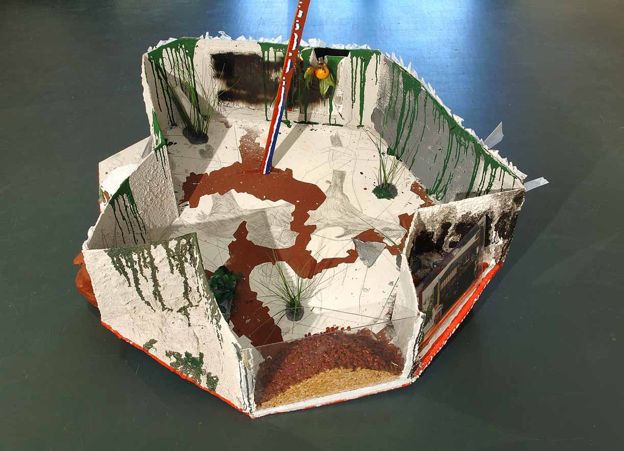 Techniques mixtes, arachides, peinture, carton, plexiglas, plâtre, roulettes, dimensions variables