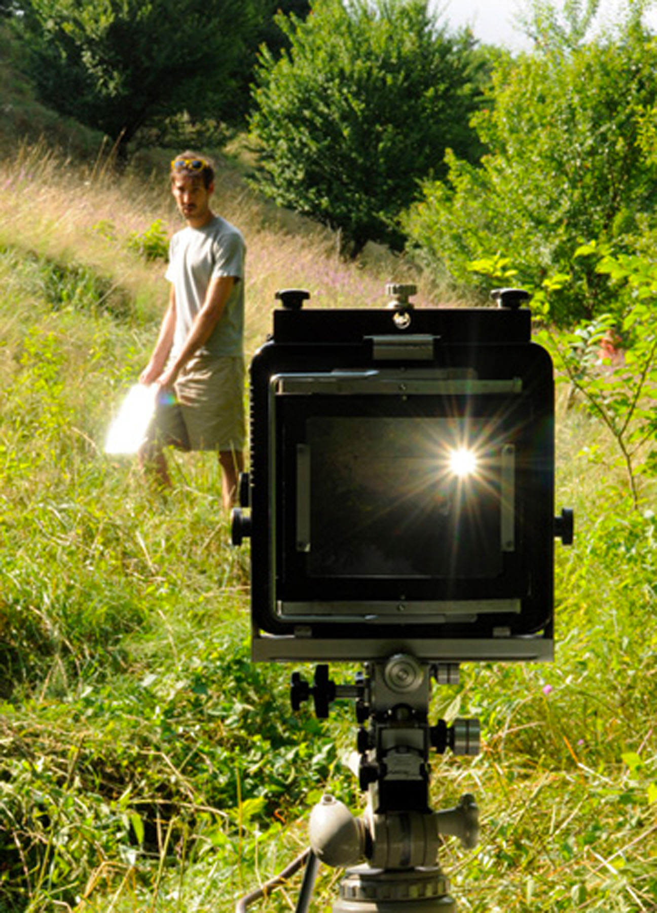 Après avoir choisi un point de vue auquel elle restera fidèle et selon des marques préalablement établies sur le moniteur de l'appareil, l’artiste guide l'équipe complice de porteur·euses de miroirs. Une fois en place, ils chercheront le bon angle pour permettre aux rayons du soleil de réfléchir en direction de l’objectif.