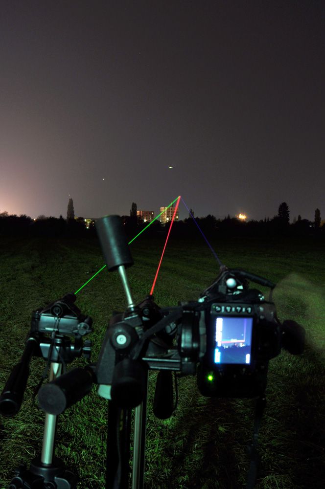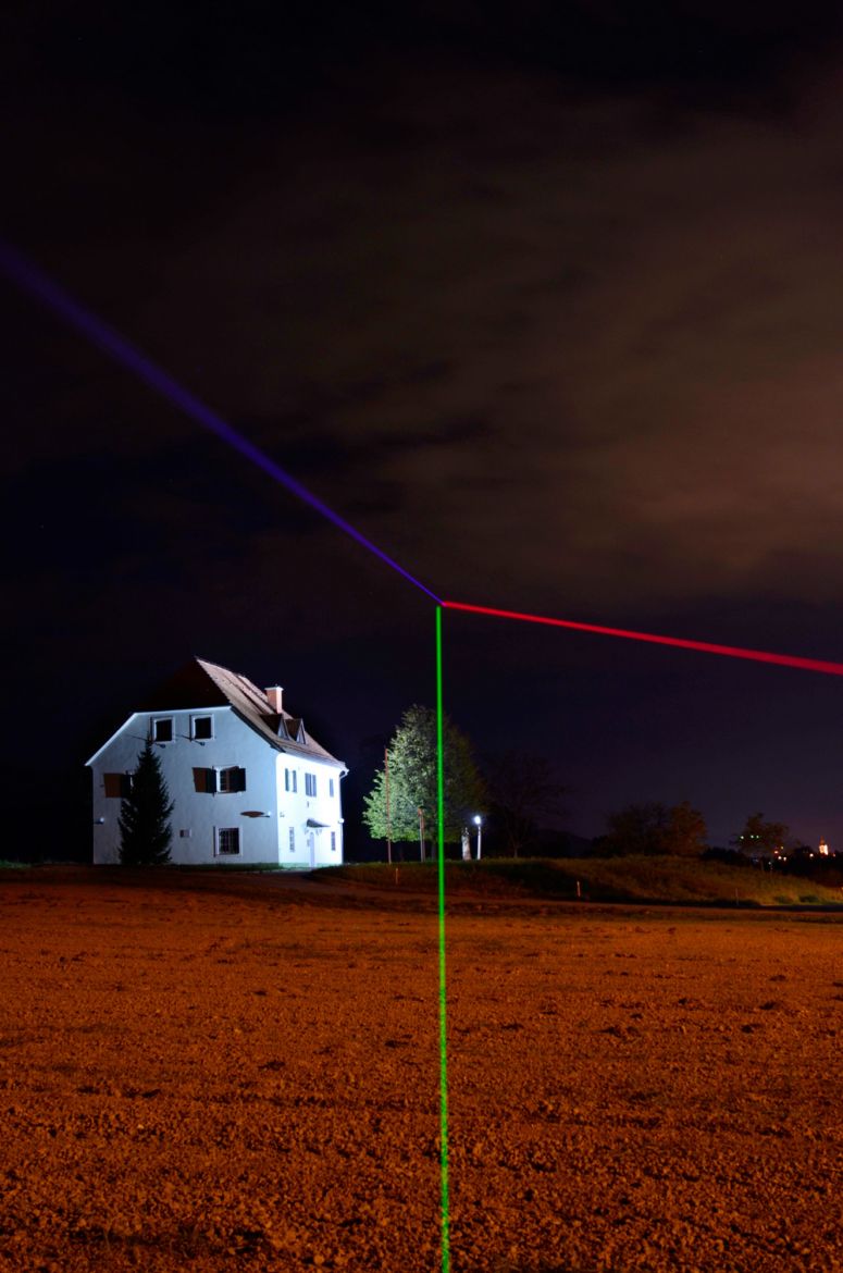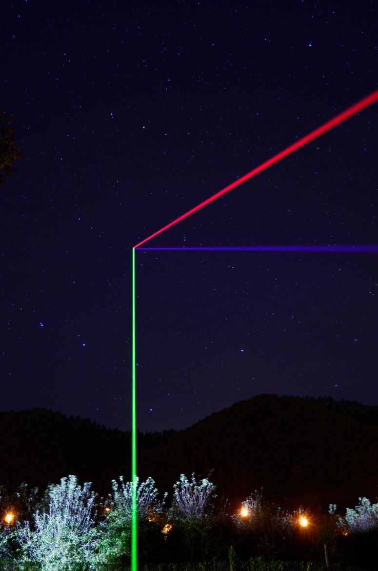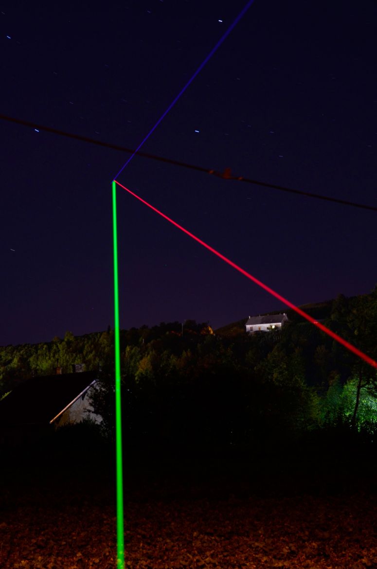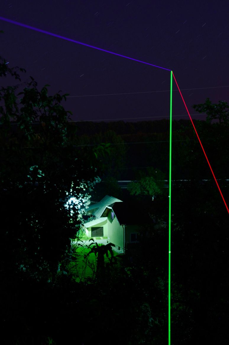 Par l’installation de pointeurs vert, rouge et bleu, l’artiste superpose au paysage existant une spatialité aux coordonnées alors propres au procédé photographique. Cette réalité ajoutée est soumise aux propriétés physiques de l’appareil : le parcours de la lumière laser, uniquement visible depuis sa source et pointée vers l’horizon, est capturé par le réseau de miroirs et de lentilles déformantes. La machine offre ainsi ses repères propres et marginaux, par une annotation lumineuse au paysage.