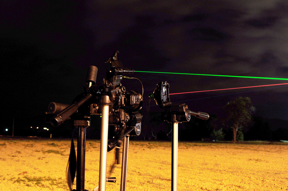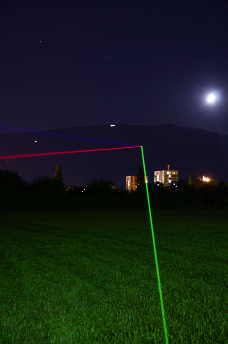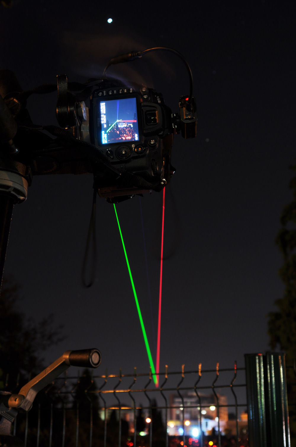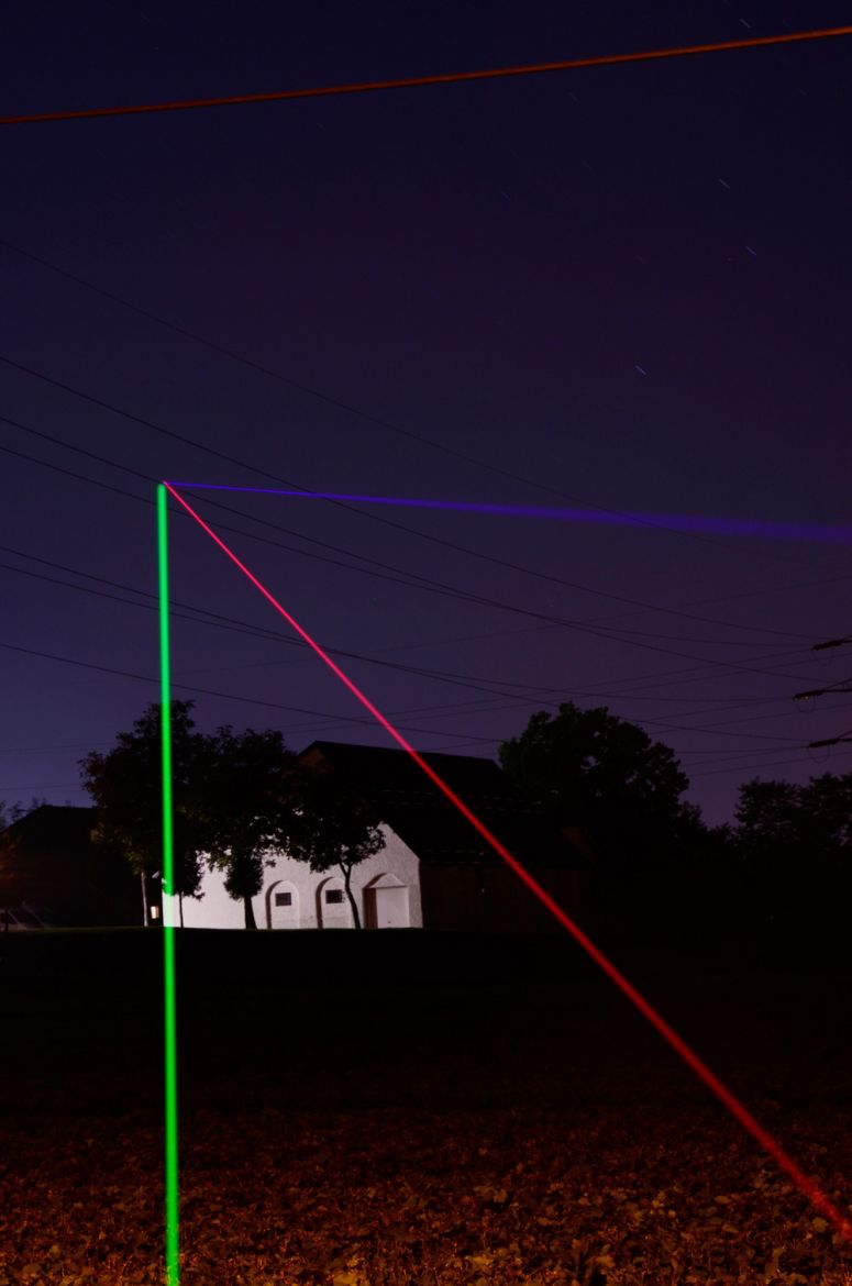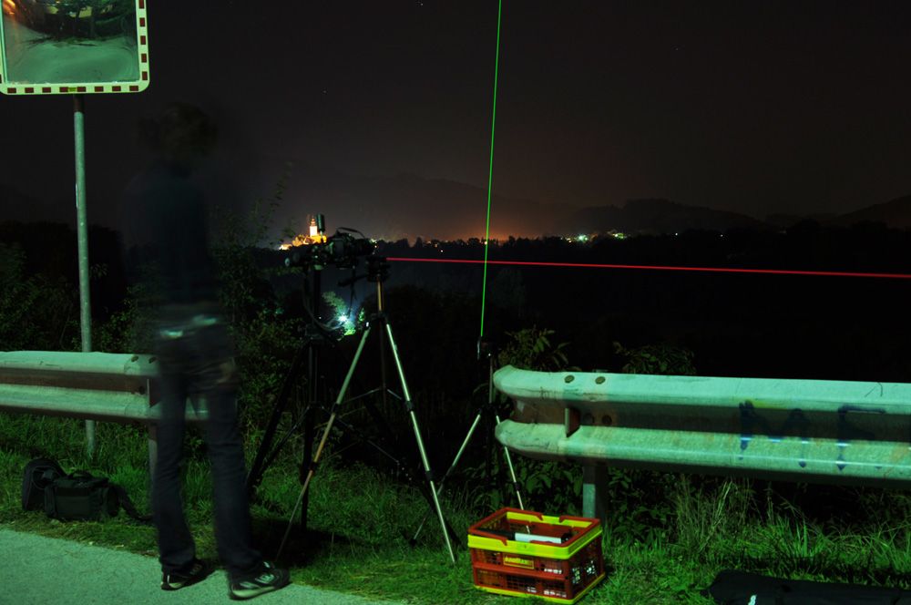 Par l’installation de pointeurs vert, rouge et bleu, l’artiste superpose au paysage existant une spatialité aux coordonnées alors propres au procédé photographique. Cette réalité ajoutée est soumise aux propriétés physiques de l’appareil : le parcours de la lumière laser, uniquement visible depuis sa source et pointée vers l’horizon, est capturé par le réseau de miroirs et de lentilles déformantes. La machine offre ainsi ses repères propres et marginaux, par une annotation lumineuse au paysage.