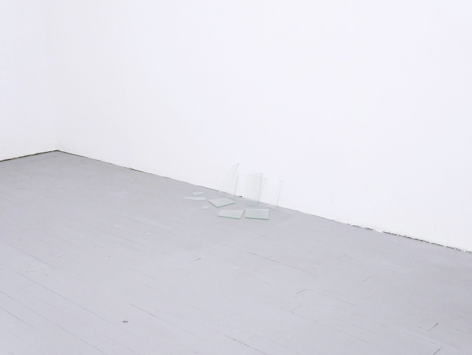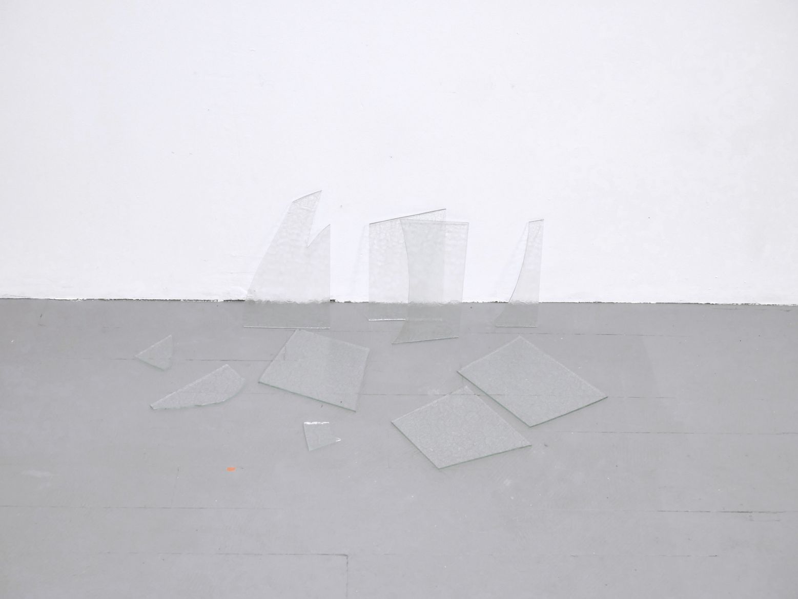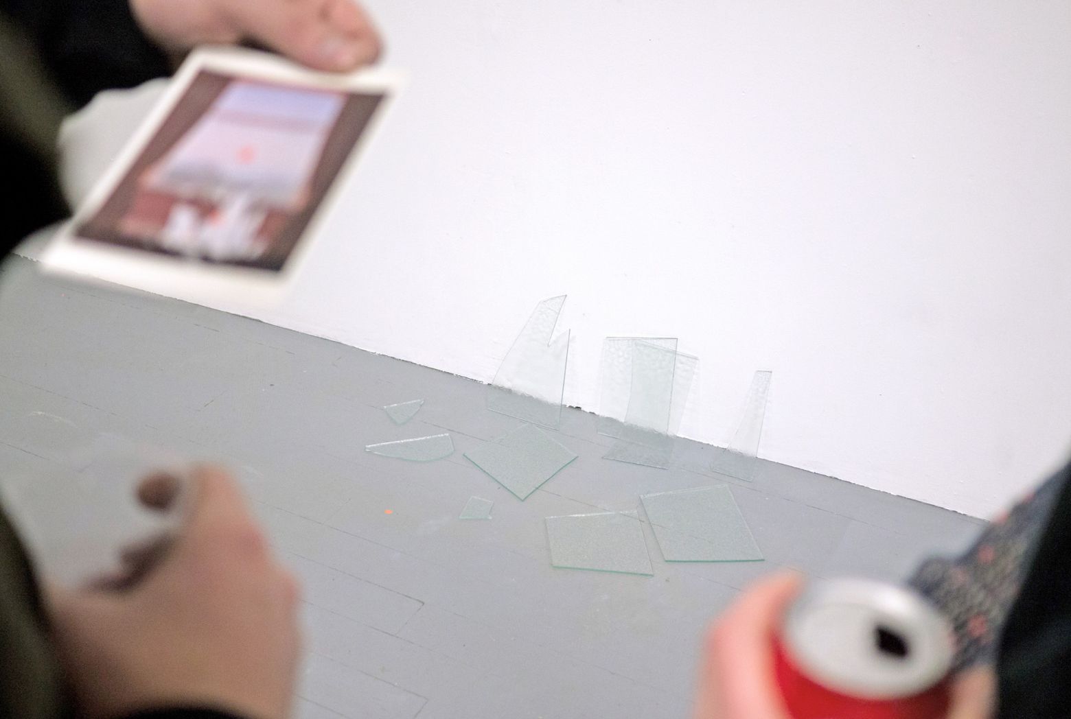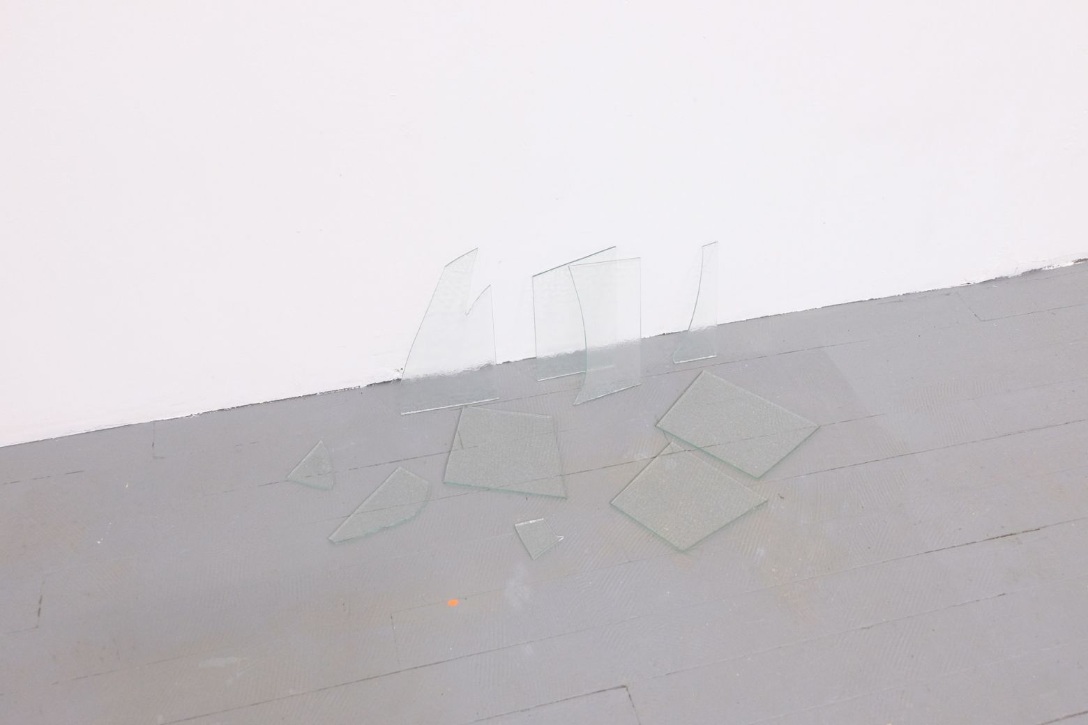 Ensemble de 10 morceaux de verre découpés sur mesure et pointe de gouache orangée, en écho à la verrière brisée du lieu et au tableau Le soir qui tombe de René Magritte dont la reproduction sur carte postale a circulé de main en main le soir du vernissage.