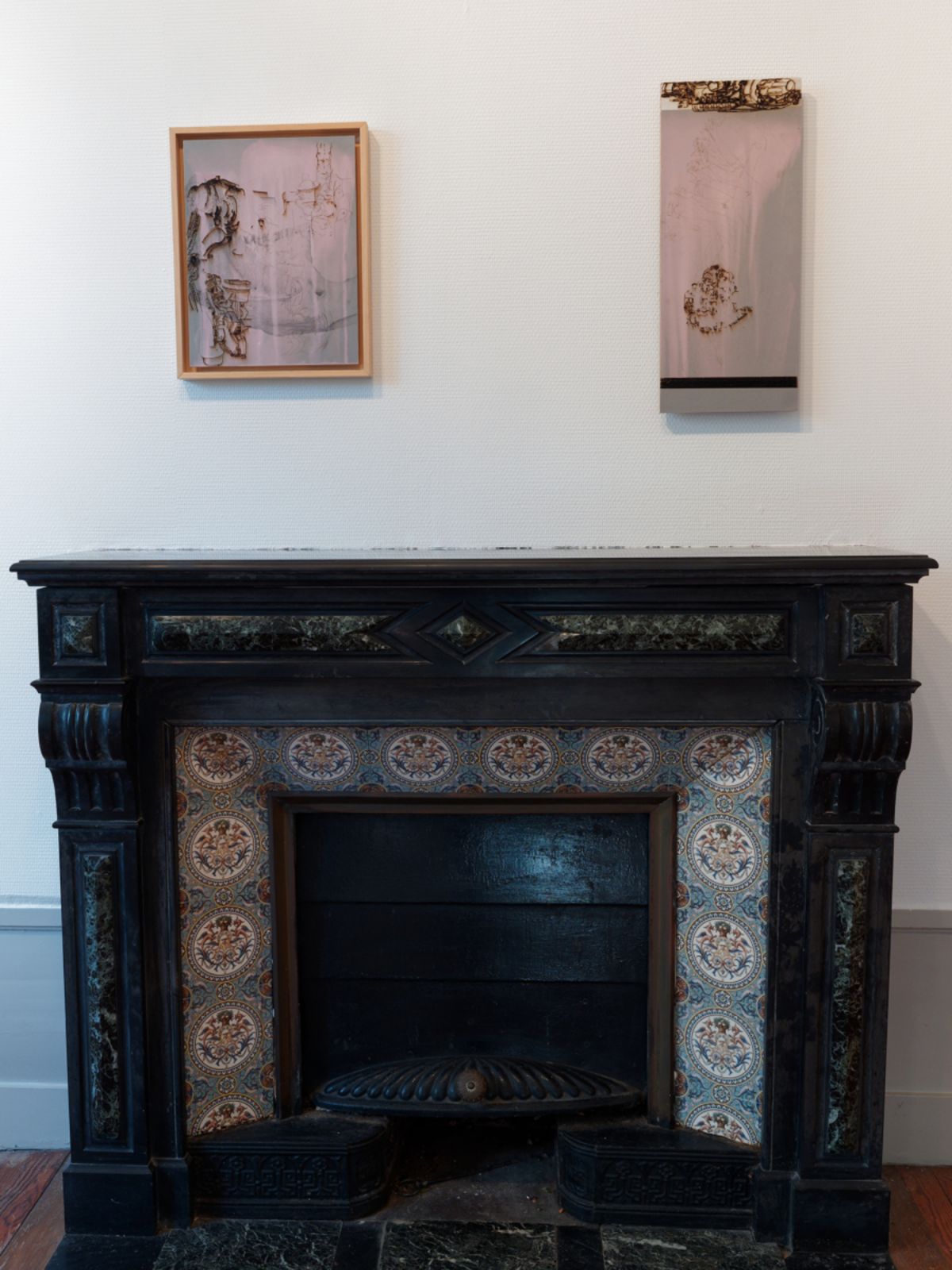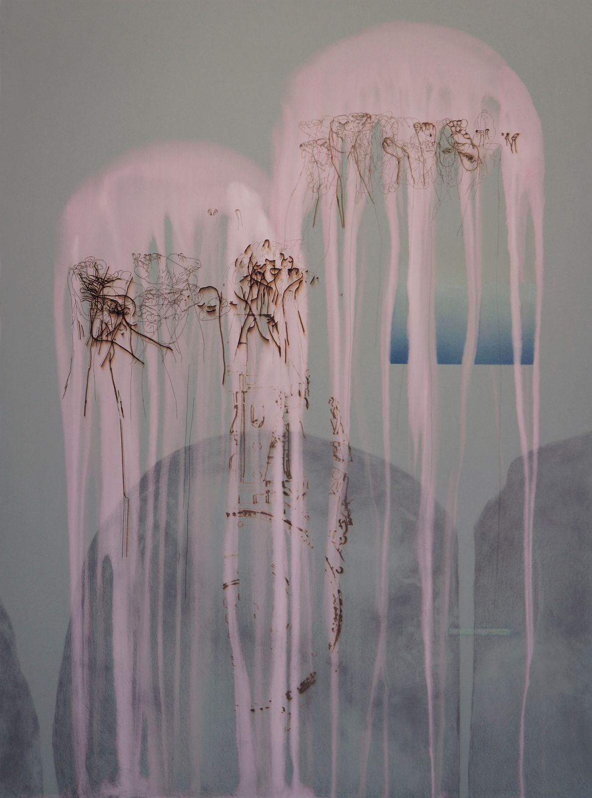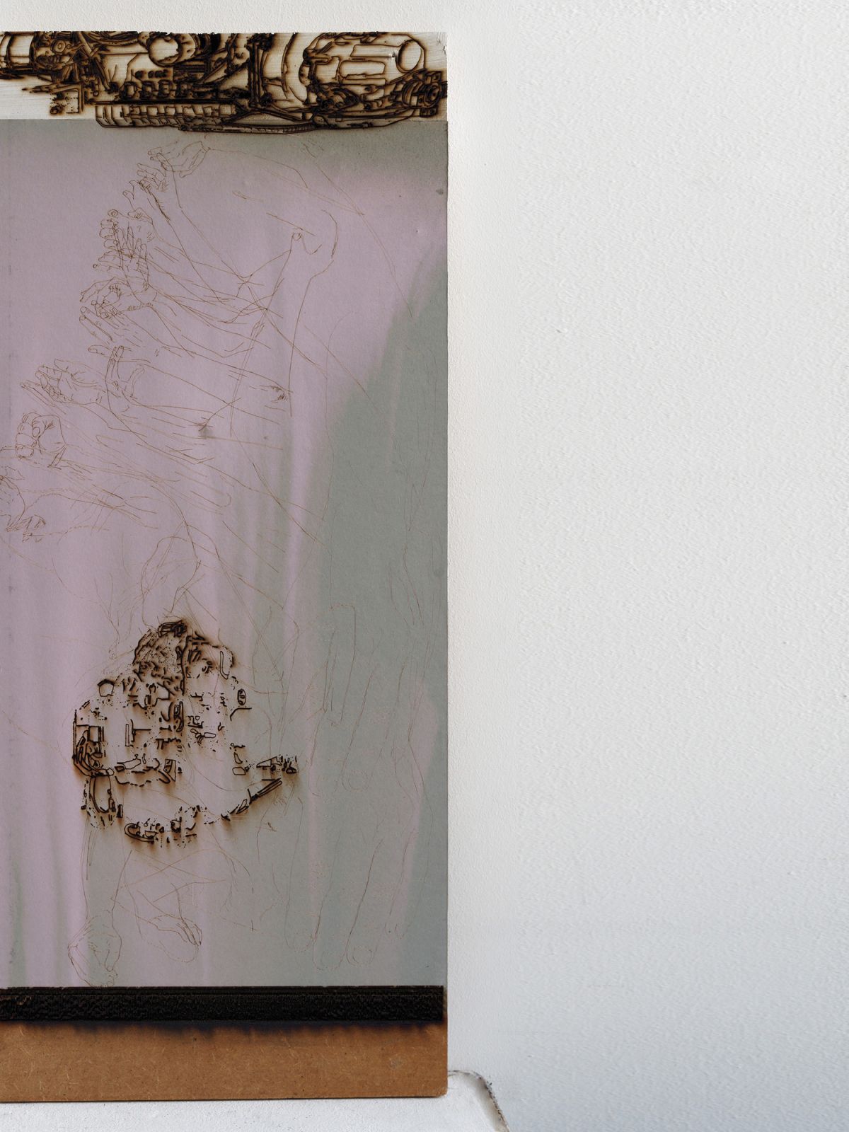 Javel, crayon et graphite sur papier vert de gris marouflé sur bois, mains en faïence émaillée