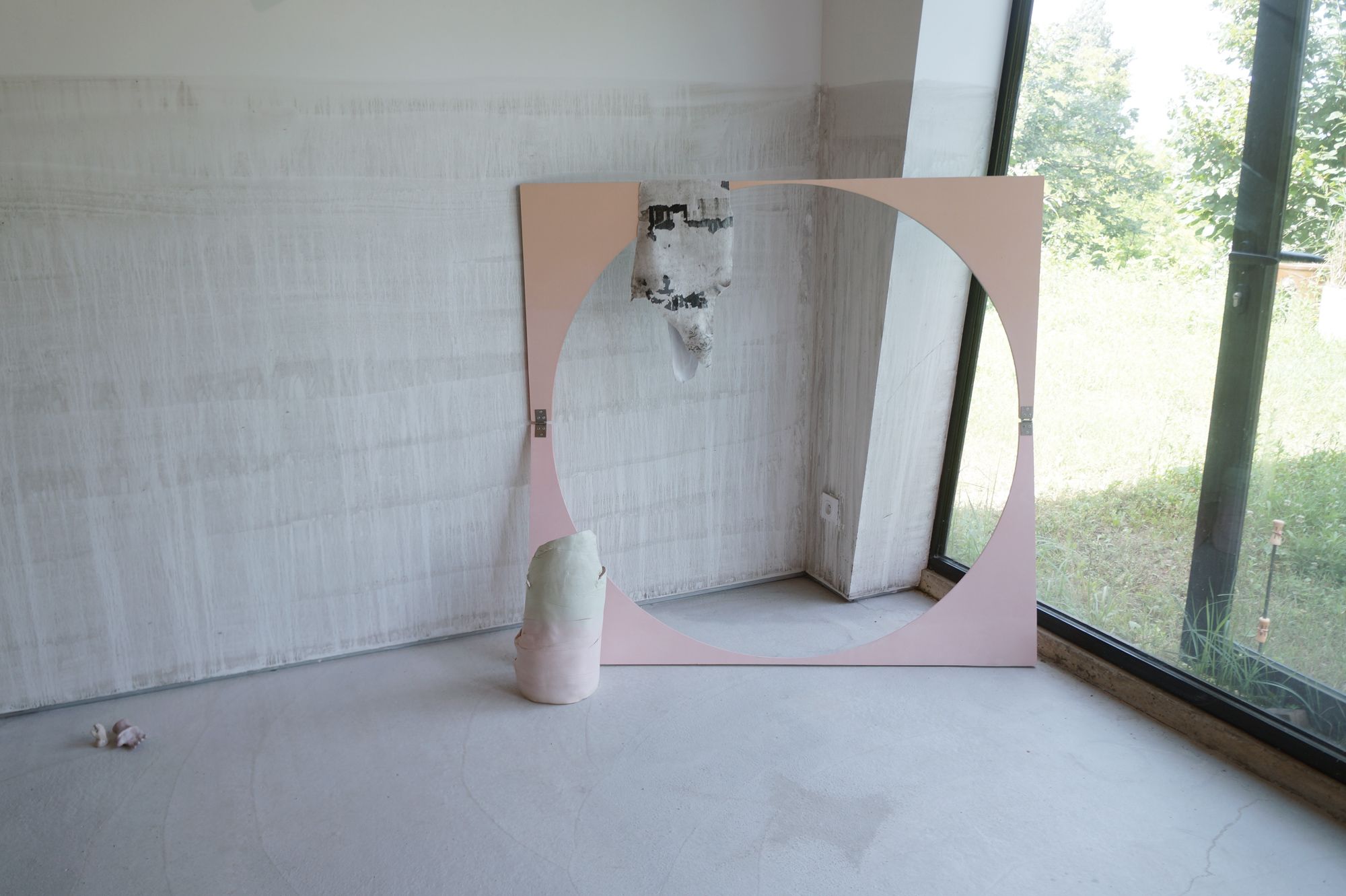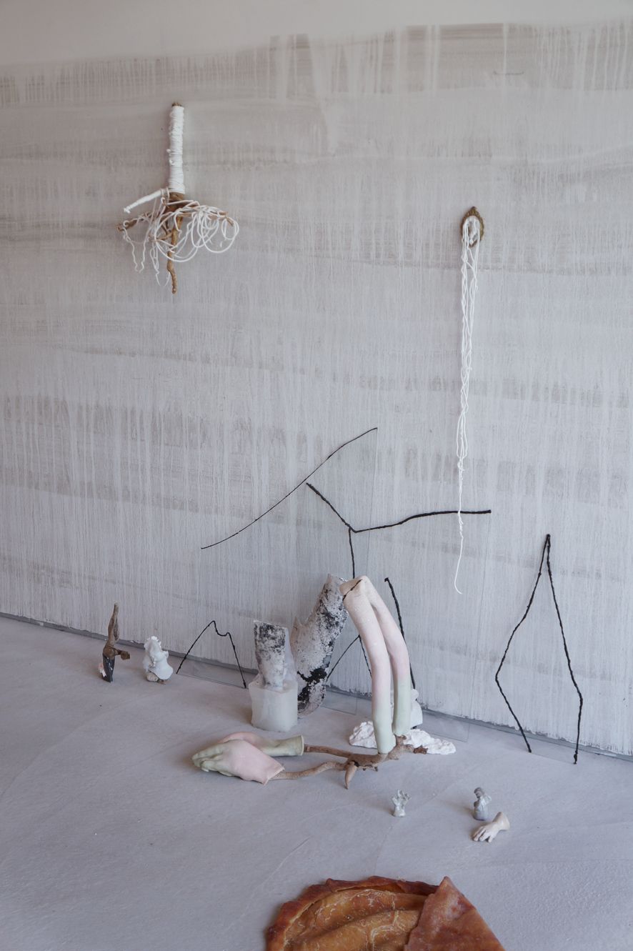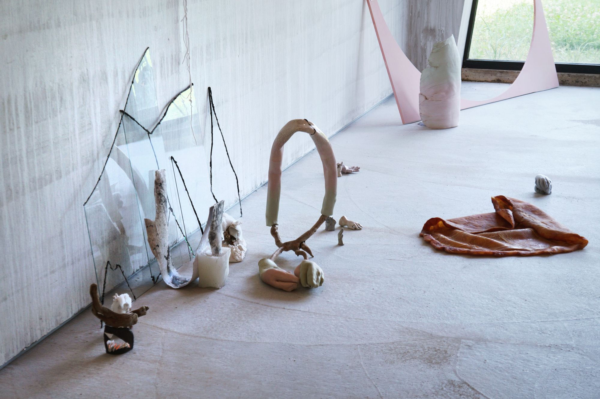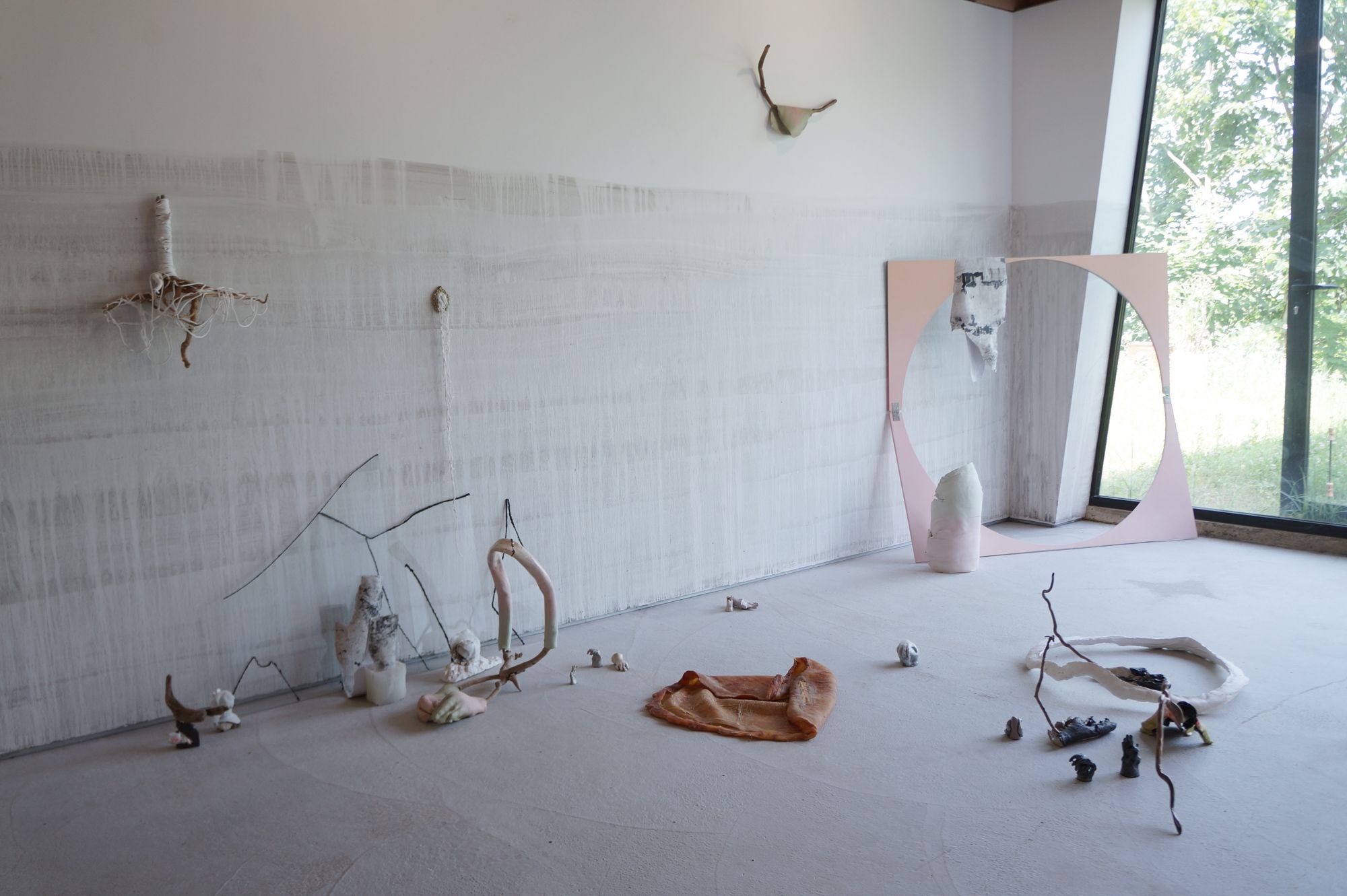 Mon intérêt de toujours pour les phénomènes liés à l’eau comme le sédiment, le limon et les embâcles a infusé la manière dont certaines installations ont été mises en espace. Ici, j'ai choisi d'installer des objets produits pour l’exposition et des pièces réalisées entre 2021 et 2025 comme un ensemble d’éléments apportés par l’eau et laissés sur le rivage, créant ainsi une sorte d’écosystème hasardeux faisant fi de toute notion d’équilibre, d’esthétique.