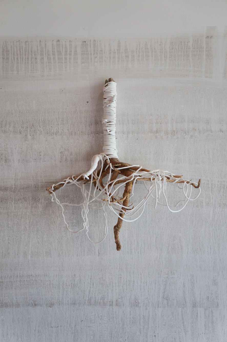 Exposer dans un espace d’atelier a été pour moi l’occasion d’expérimenter un processus de mise en espace en relation au rivage, à l’eau, ses mouvements, ses flux. Partant d’un phénomène naturel, l’embâcle, dont les crues sont instigatrices, j’ai produit des études sculpturales ayant pour principe l’accumulation fortuite de matériaux d’origines différentes, s’amoncelant au gré des flux et dans tout l'espace.