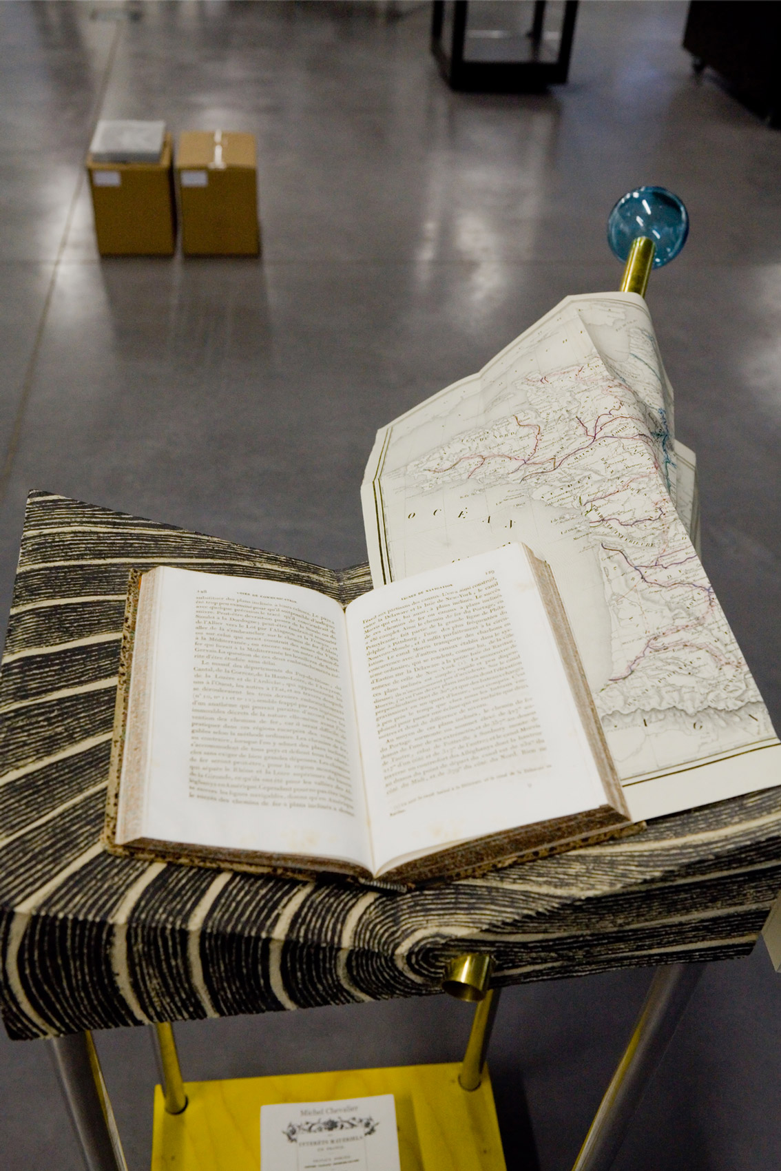 Pour l'exposition au Frac PACA, Niek van de Steeg s'est concentré sur Des Intérêts Matériels en France - Travaux Publics, Routes, Canaux, Chemins de Fer, ouvrage édifiant rédigé par un certain Michel Chevalier, publié en 1838, ainsi que sur sa version nouvellement numérisée par la BNF. La consultation des deux documents est facilitée par un dispositif sculptural, une « machine de lecture » dont les éléments constitutifs (grès, durilanox, verre soufflé) mêlent avec surprise l'esthétique des avant-gardes russes (on songe au mobilier du Club de la Presse de l'Armée Rouge tel qu'il fut conçu par El Lissitzky) et le design post-moderne le plus décoratif.