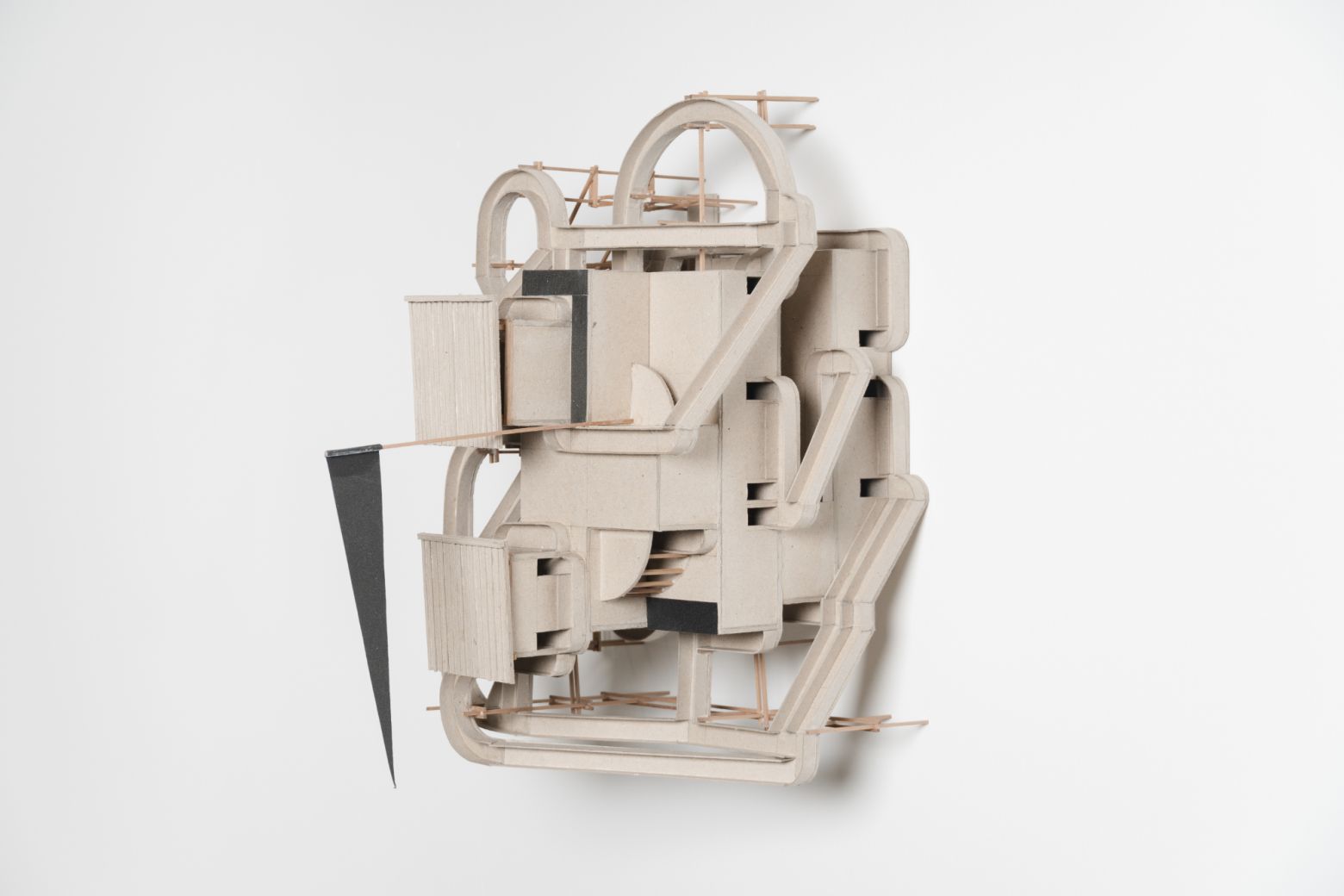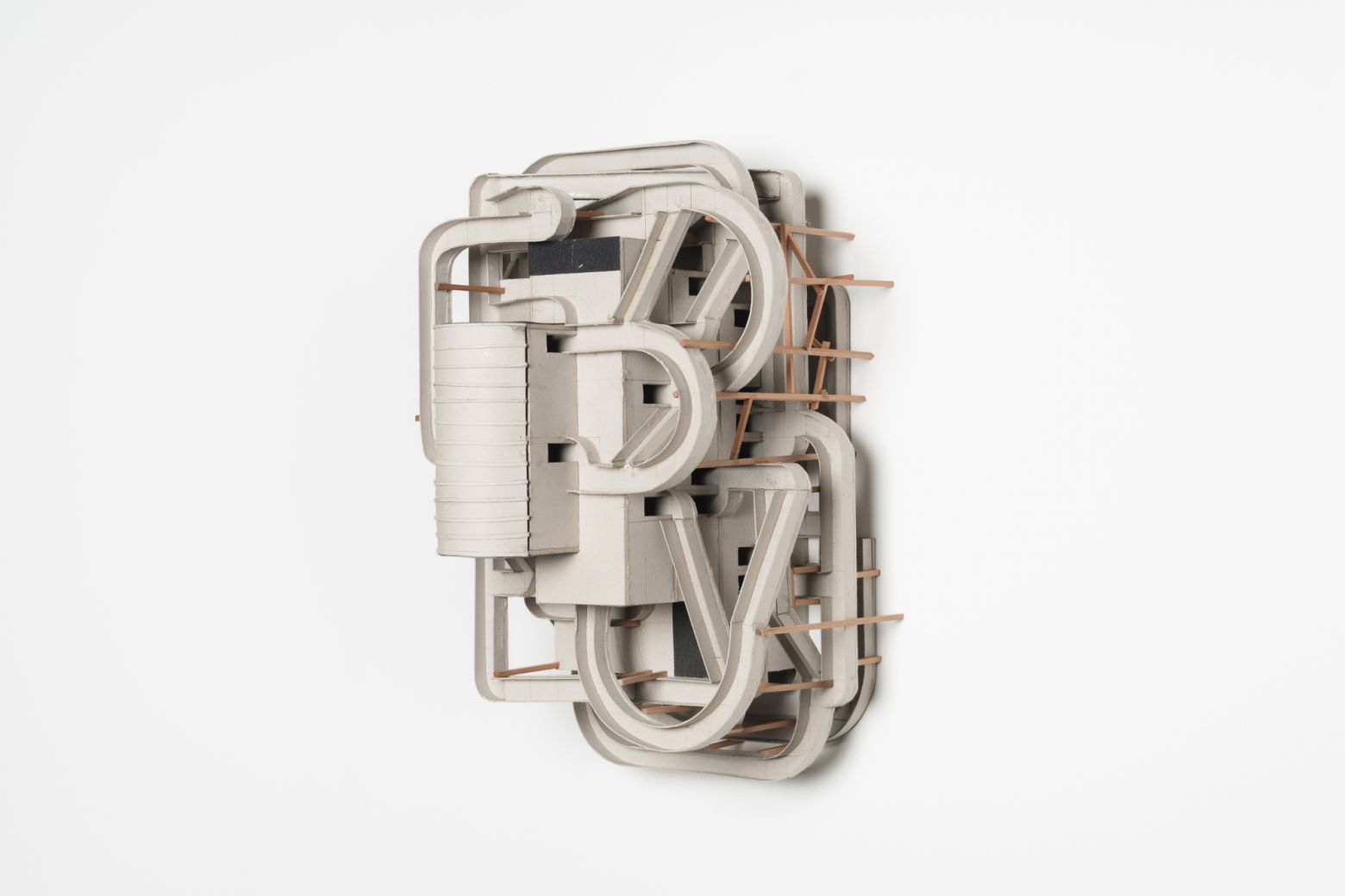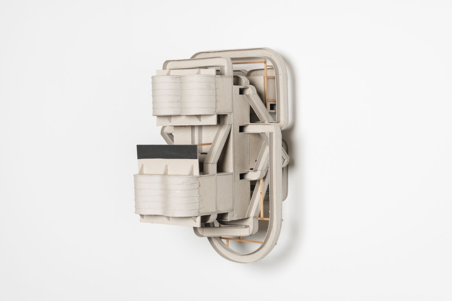 "Les maquettes – à supposer qu’elles soient maquettes – naissent d’un texte mis au jour par un processus d’archéologie inversée en empruntant le chemin du braille. En effet, l’artiste « relit » un texte de Diderot en le soumettant à une variation résumée en quelques lettres B-O-U-C-H-E-R-A-D-I-N-F-G ; ces dernières étant la contraction des noms des artistes, objets du commentaire du philosophe : Boucher, Baudouin et Fragonard. Chaque objet-maquette présente une variation sonore possible mise en volume après un passage par l’écriture en braille. Nous disons bien sonore et non visuel. Car il ne s’agit pas pour l’artiste de voir, mais d’entendre des volumes, comme il exige de nous de regarder des sonorités à la manière d’un synesthète. Et si la maquette au mur fait disparaître le volume, les photographies, au mur elles aussi, creusent le volume à nouveau dans une fiction d’exposition." — Abdelkader Damani