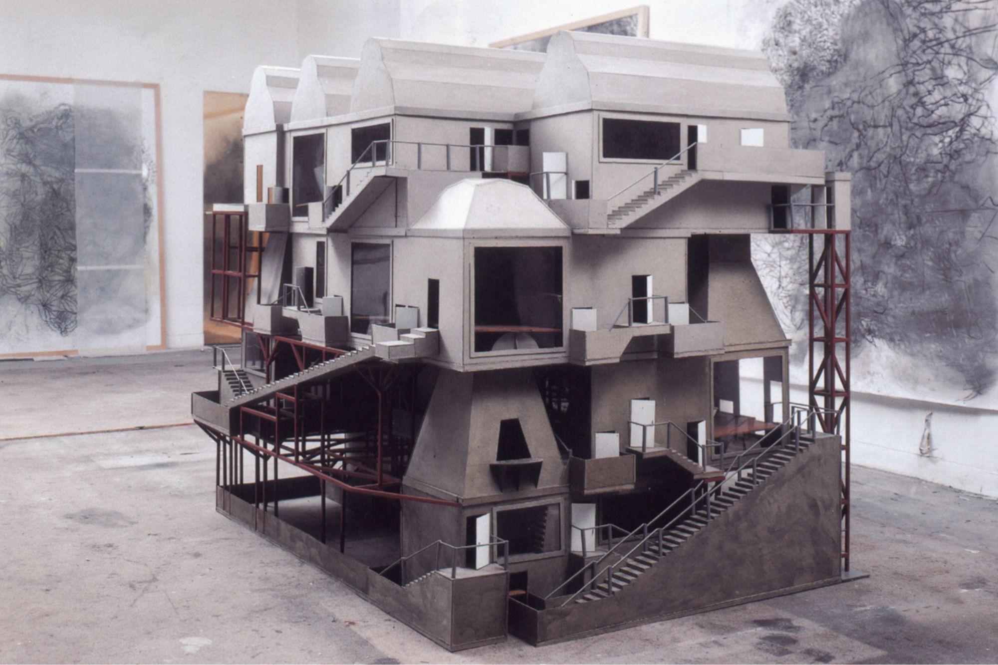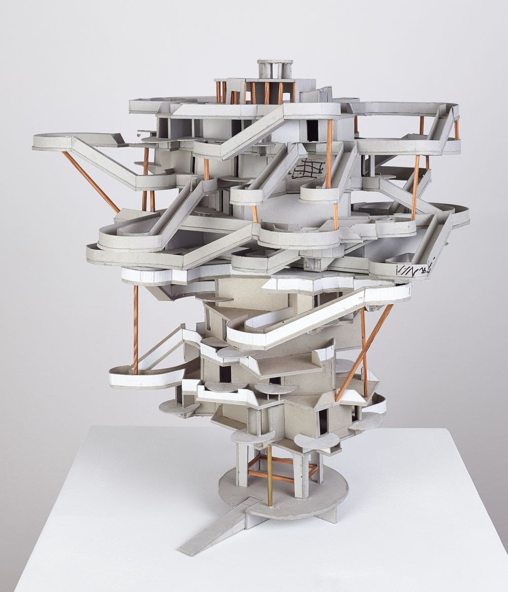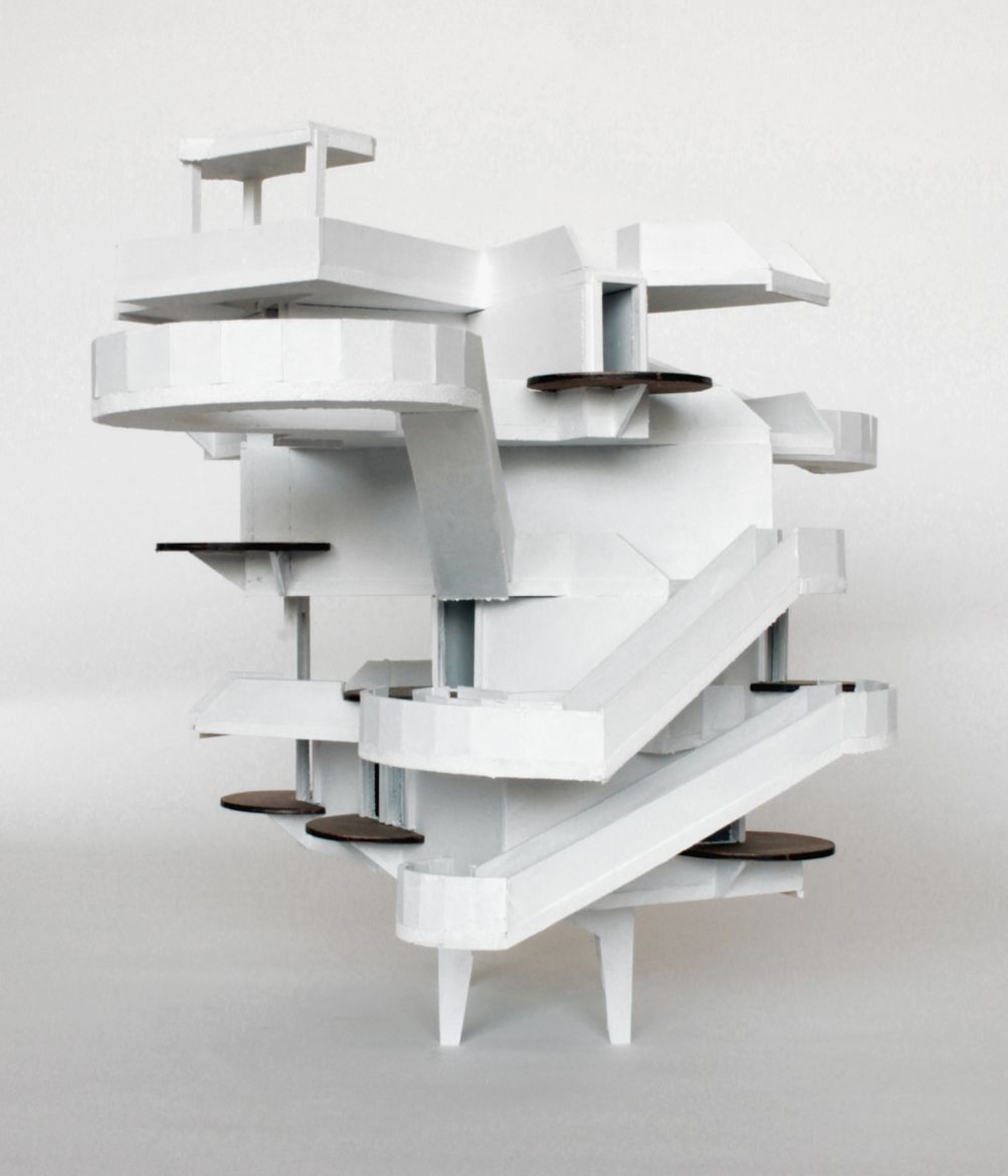 Le point de départ des Pavillon Parker est une petite maquette d'étude que j'avais faite pour la série Cabaret Diderot. Posée à l'envers, elle offrait une configuration inédite. Je décidais donc (moi qui aime bien les contre-pieds) de faire exactement l'inverse de ce qu'il se passait dans les maquettes du Cabaret Diderot : blanches au lieu de noires, aérées au lieu de compactes... À partir de là, le jeu était de faire des variations (au sens musical) en faisant pivoter chacun des niveaux pour créer de nouveaux parcours. Cela à donné trois maquettes différentes. Puis j'ai superposé les plans de chacune de ces trois maquettes pour en faire trois nouvelles. Puis de nouveau superposition des plans... Cela afin de donner de plus en plus d'expansion au volume et atteindre le maximum de complexité jusqu'à perte des repères et des possibilités de suivre les parcours. Il s'agissait ici de faire écho aux variations à partir d'un thème, telles qu'on les retrouve dans la musique jazz et chez Charlie Parker en particulier.