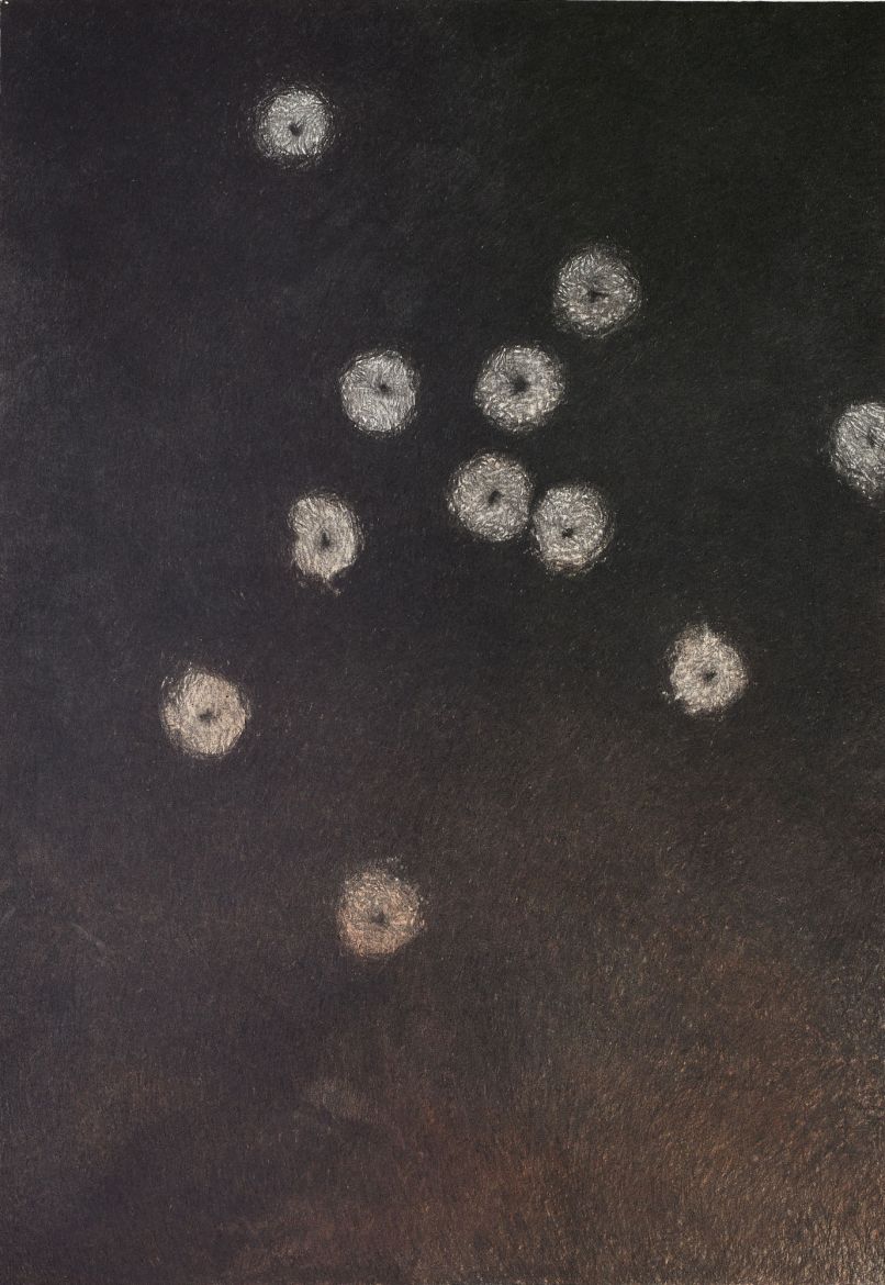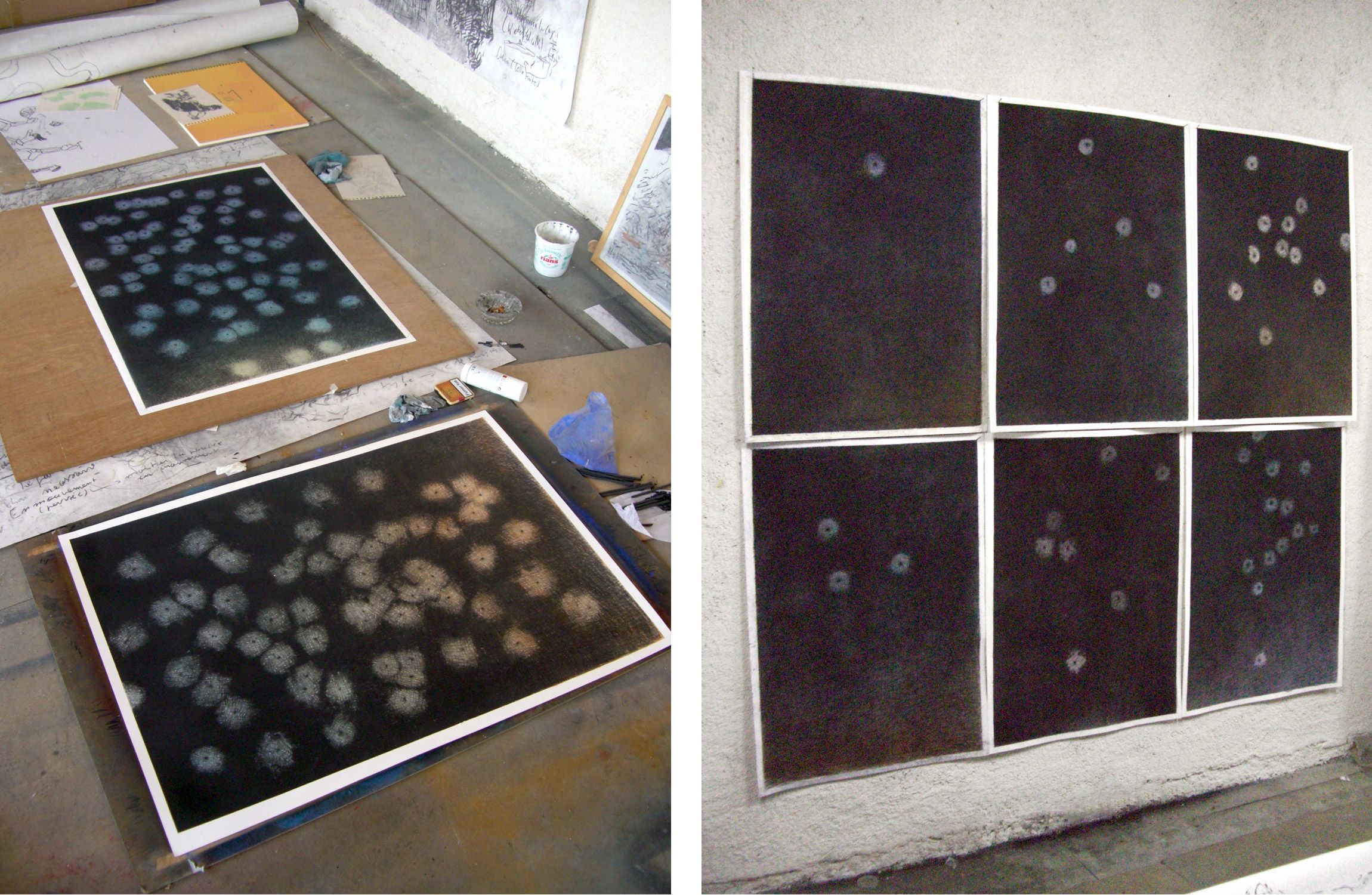 En tout cas, cette image est restée suffisamment ancrée dans ma mémoire pour me revenir lorsque je dessinais. Car finalement, s’isoler (volontairement cette fois) dans un petit espace neutre (la feuille de papier) et passer son temps à y jeter des choses pour voir comment elles reviennent (subjectile et projectile) n’est pas si éloigné de la situation et de la gestuelle du roi du frigo. Ainsi, en 2006, alors que j’étais en résidence pour une exposition dans un fort militaire du XIXe siècle, l’improbable contexte du lieu m’a amené à reprendre cette référence. J’ai passé une bonne partie de mon temps à travailler à partir du rebond d’une balle de tennis. Par dérivation, c’est ce qui a donné lieu à la série de dessins intitulée Phosphènes. J’y vois maintenant plus une connotation musicale (Sports et divertissements de Satie ou La Main heureuse de Schoenberg) que cinématographique.