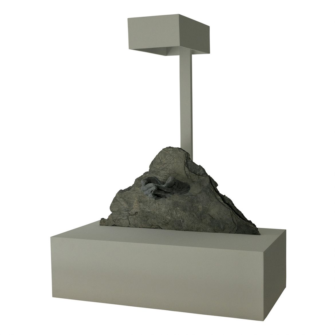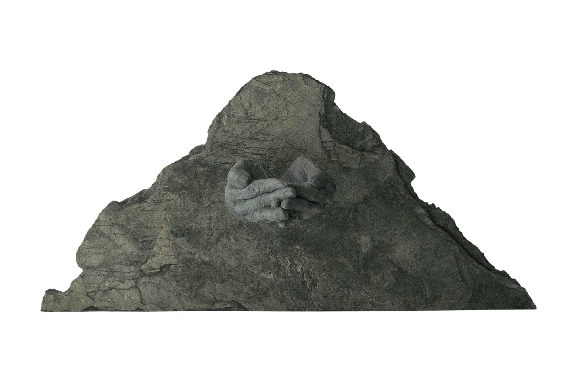 Le moulage des mains d’une personne âgée émerge d’une pierre de lauze en forme de montagne. Au creux des mains jointes est projetée une ondulation battant au rythme d’un cœur humain. L'image en mouvement se déforme, suggérant une profondeur vibrante.
