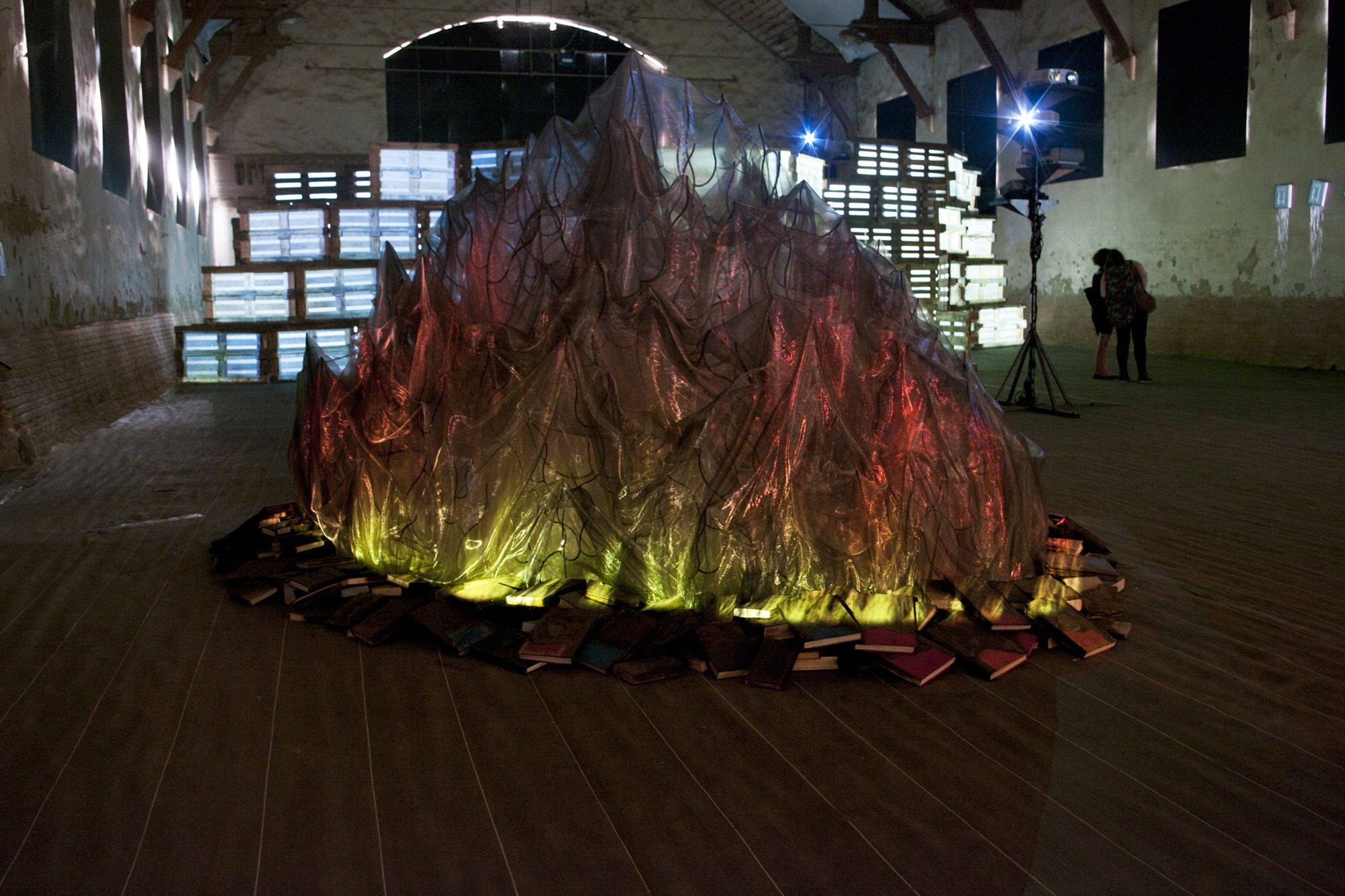 Des dizaines de livres brûlés constituent la base de l’installation, du tulle est disposé sur des supports sculpturaux. Plusieurs vidéoprojecteurs projettent du feu. Ce feu est constitué de lettres de l’alphabet tourbillonnant sur les différentes couches de tulle, donnant ainsi la sensation de profondeur.