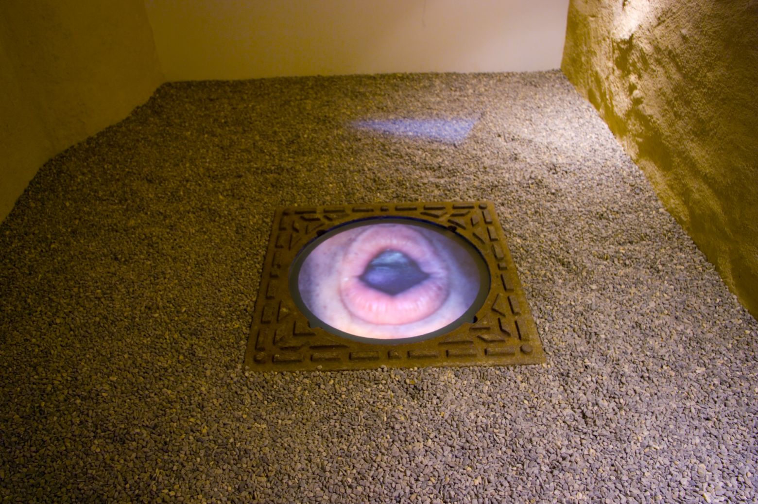 Vidéoprojection sur une dalle de verre, en lieu et place d'un couvercle de bouche d'égout. L'image projetée est celle d'une bouche en plein gargarisme. Le son de l'eau fait vibrer la dalle, créant ainsi un rapport physique à l'image vidéo.