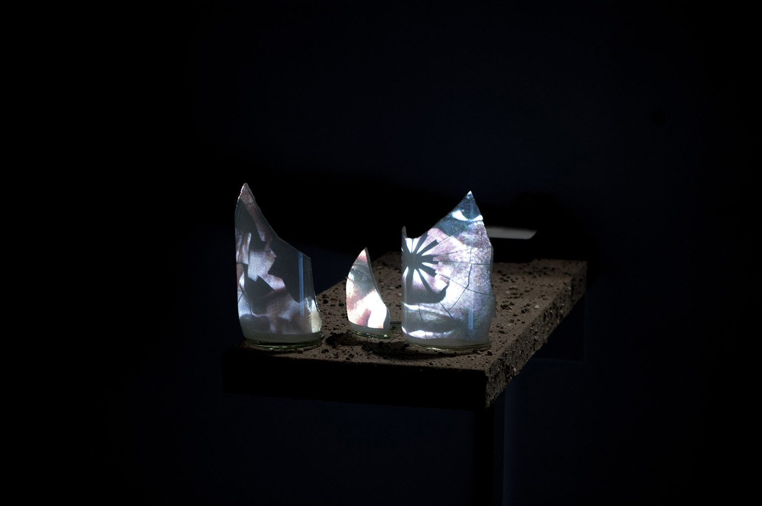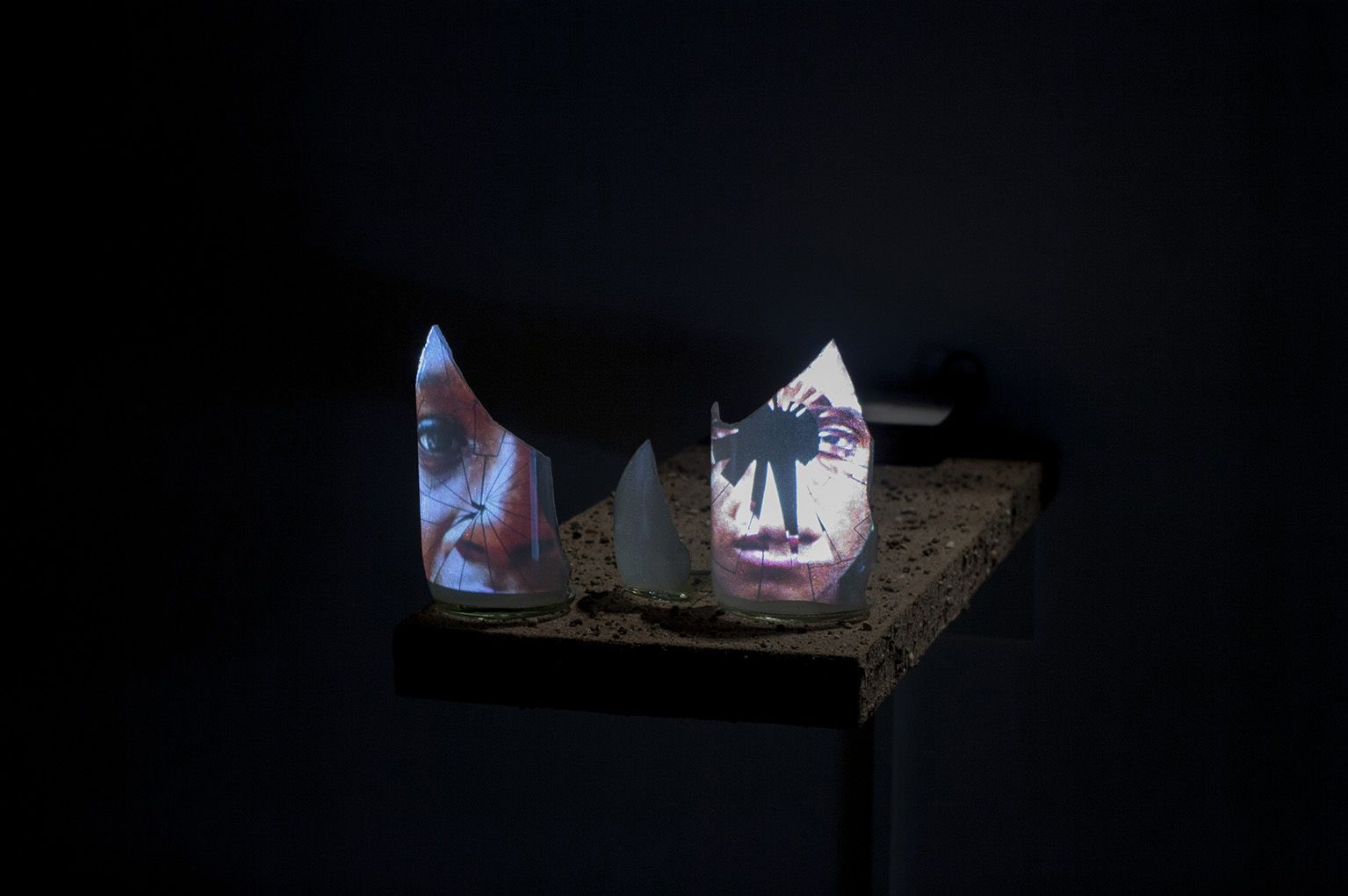 Des tessons de bouteille tranchants sont disposés à l’avant d’une plaque de bois enduite de sable. Des projections sur les tessons de visages de migrants regardent le spectateur dans les yeux. Les visages éclatent, comme si le verre explosait, et sont remplacés par d’autres.