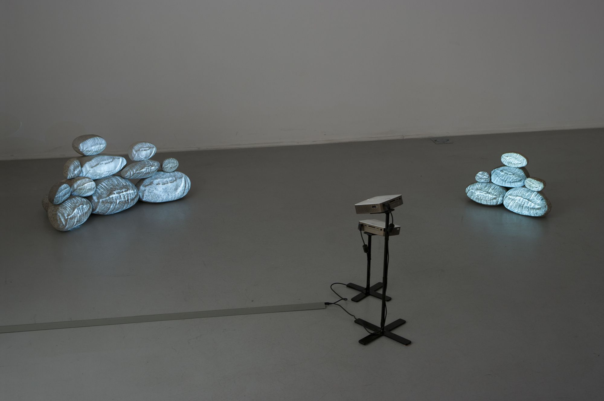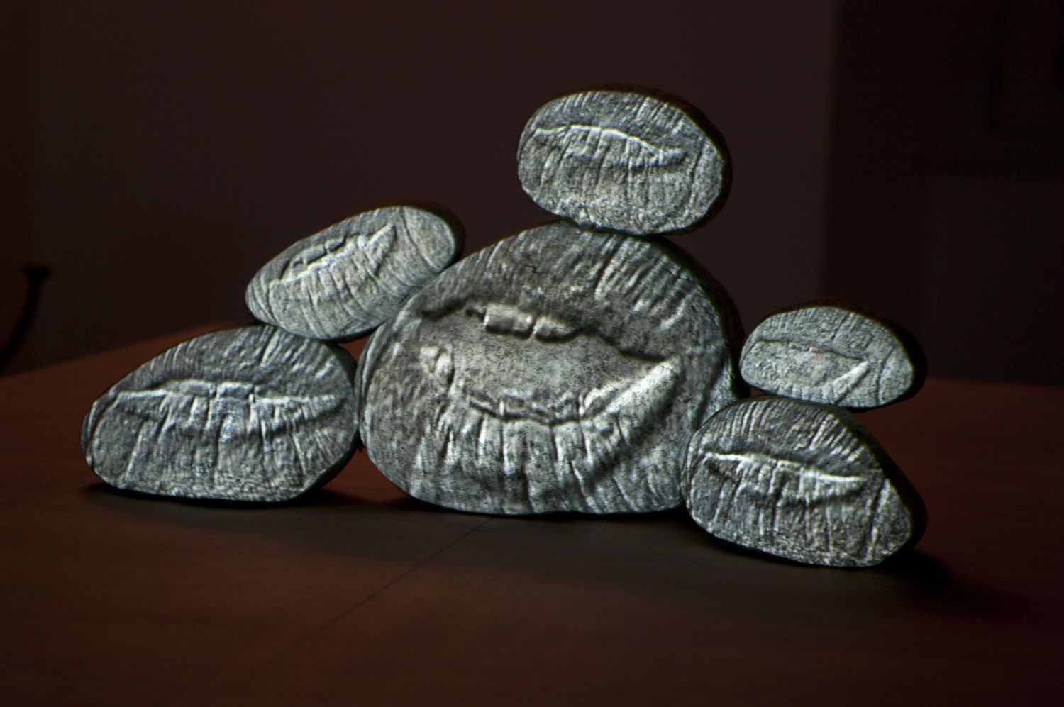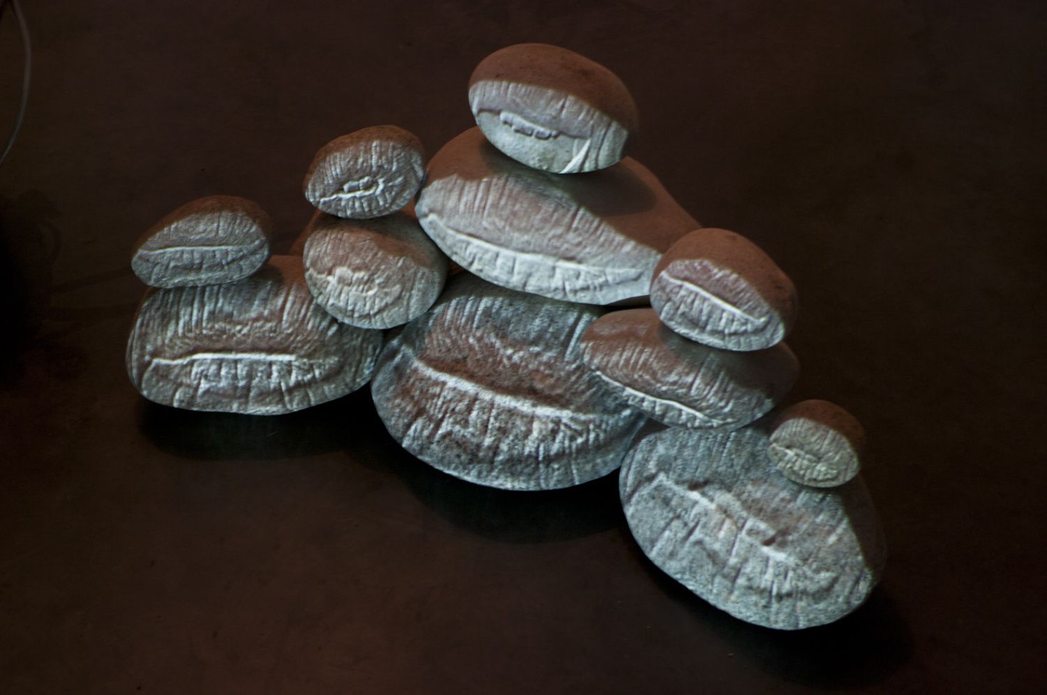 Vidéoprojection de bouches d’une personne âgée sur plusieurs cailloux en granite. Les bouches ronflent comme si elles dormaient depuis des milliers d’années et les rides accentuent cette sensation de vieillesse. C’est une œuvre liée au temps qui s’écoule et qui est une notion relative du vivant dans le cosmos.