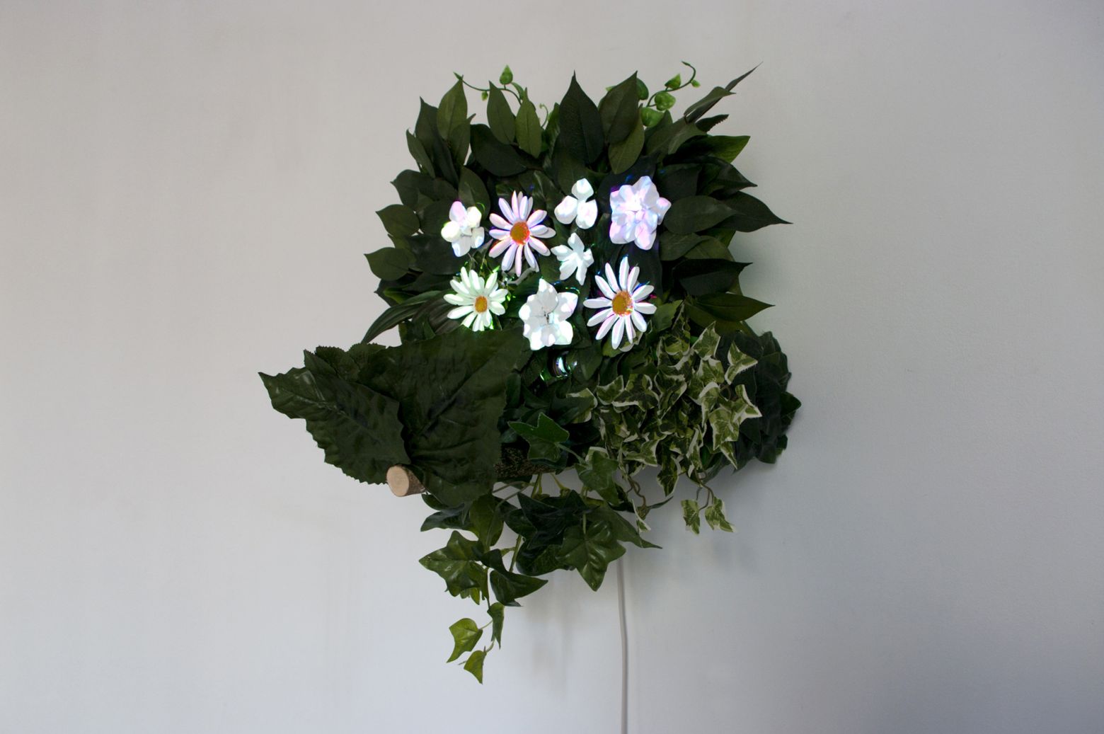 Bois, miroir, fleurs artificielles, vidéoprojecteur, câbles