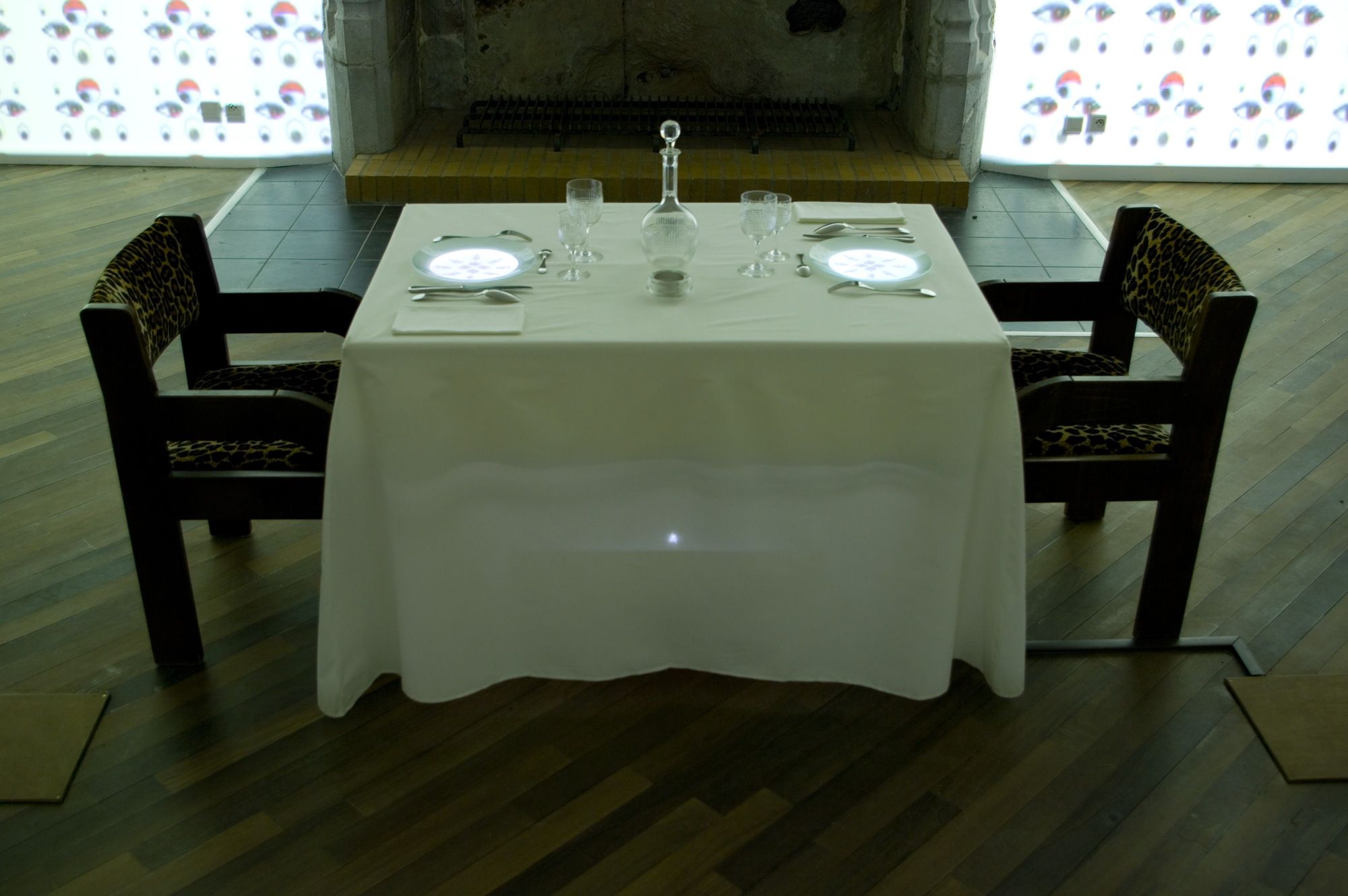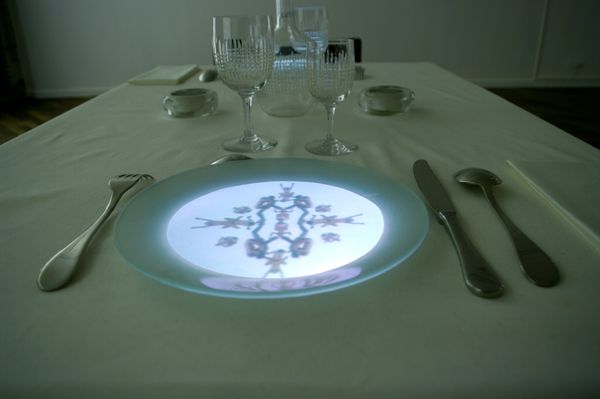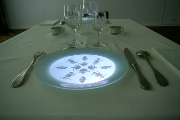 Vidéoprojection en boucle de saynètes pornographiques sur le fond d'assiettes dressées sur une table pour deux personnes. Les motifs changent en fonction des plats proposés. La table est fonctionnelle.
