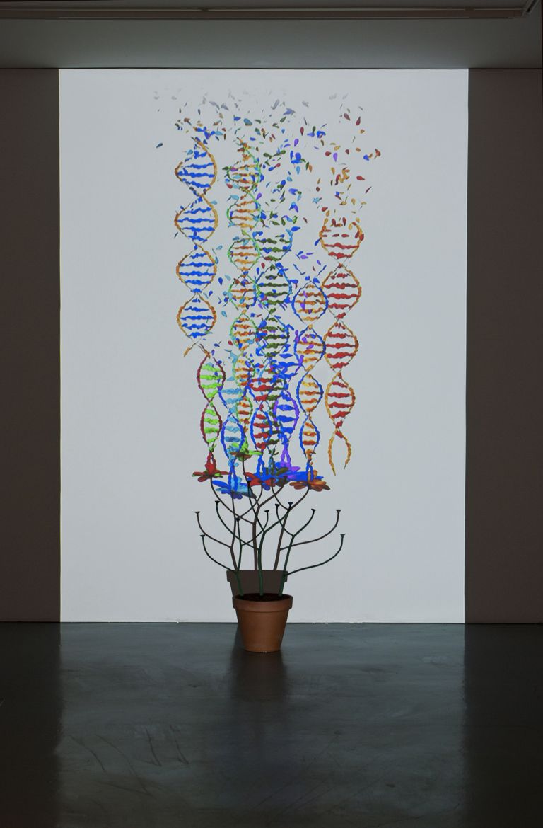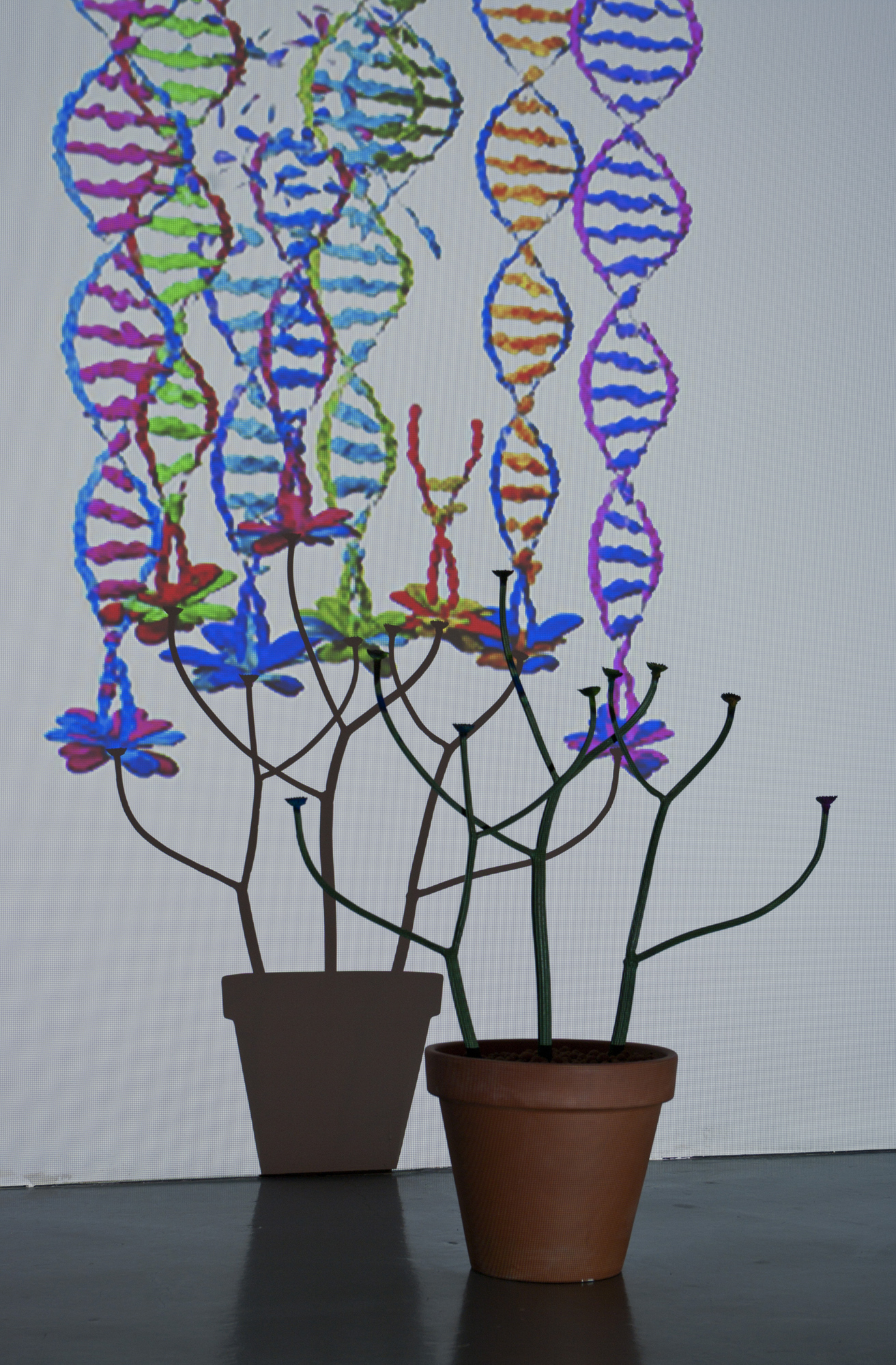 Vidéoprojection en superposition sur l’ombre portée de plantes en bronze d’une animation 3D. Les images sont des ellipses d’ADN constituées de pétales de fleurs multicolores, elles se déploient et se fondent dans la projection pour laisser place à une autre dans une boucle intemporelle.
