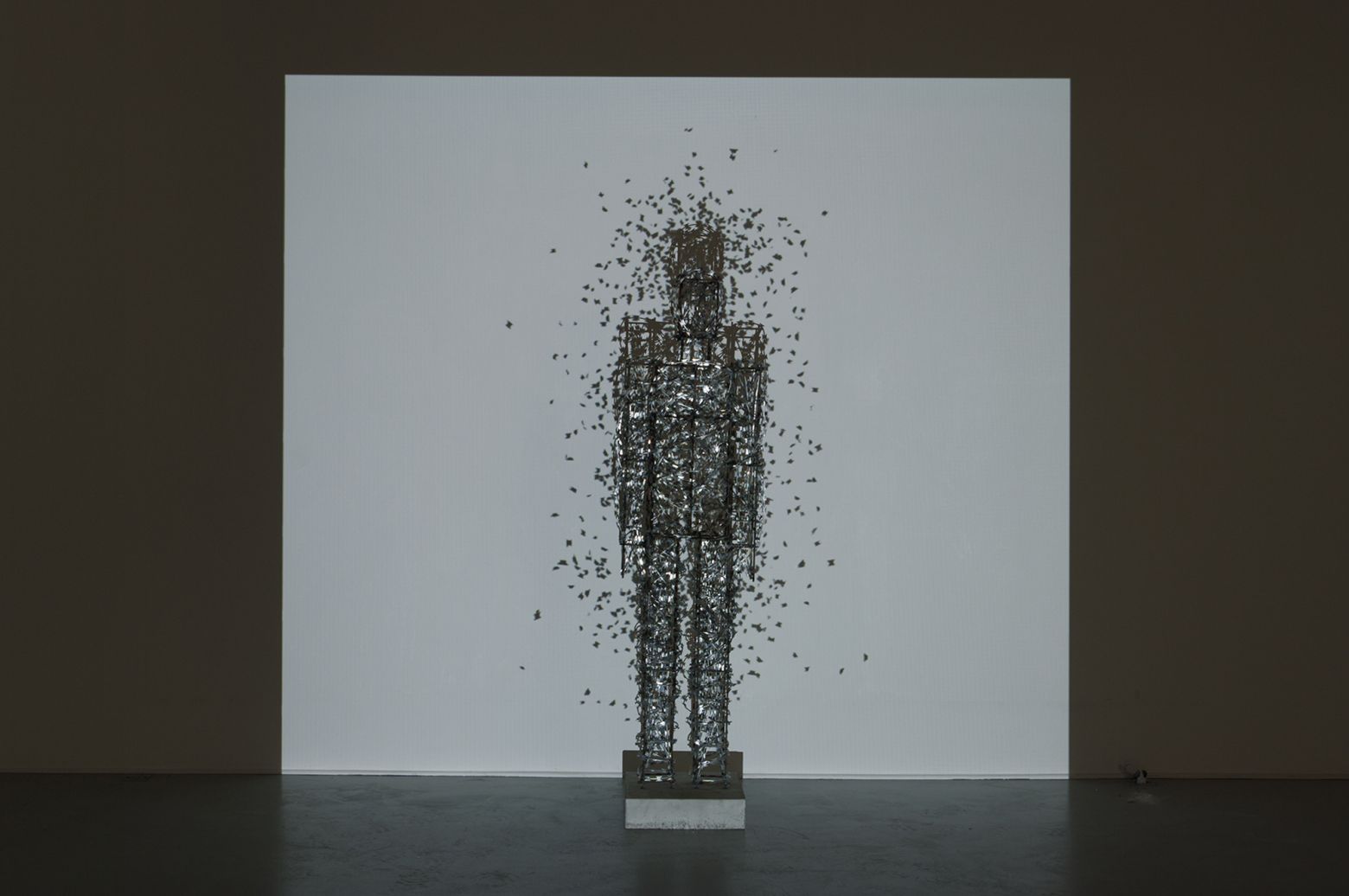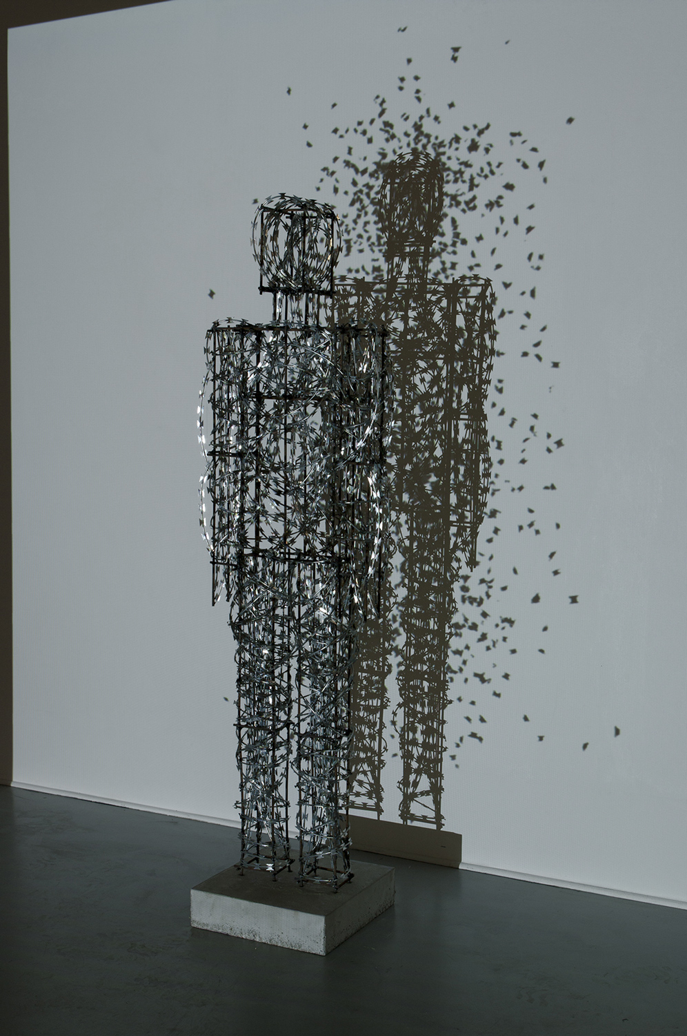 Projection vidéo d’une animation 3D représentant une nuée de papillons formés d’ailettes de barbelé concertina. L’animation se fond avec l’ombre de la sculpture, dans un va-et-vient entre réel et virtuel.