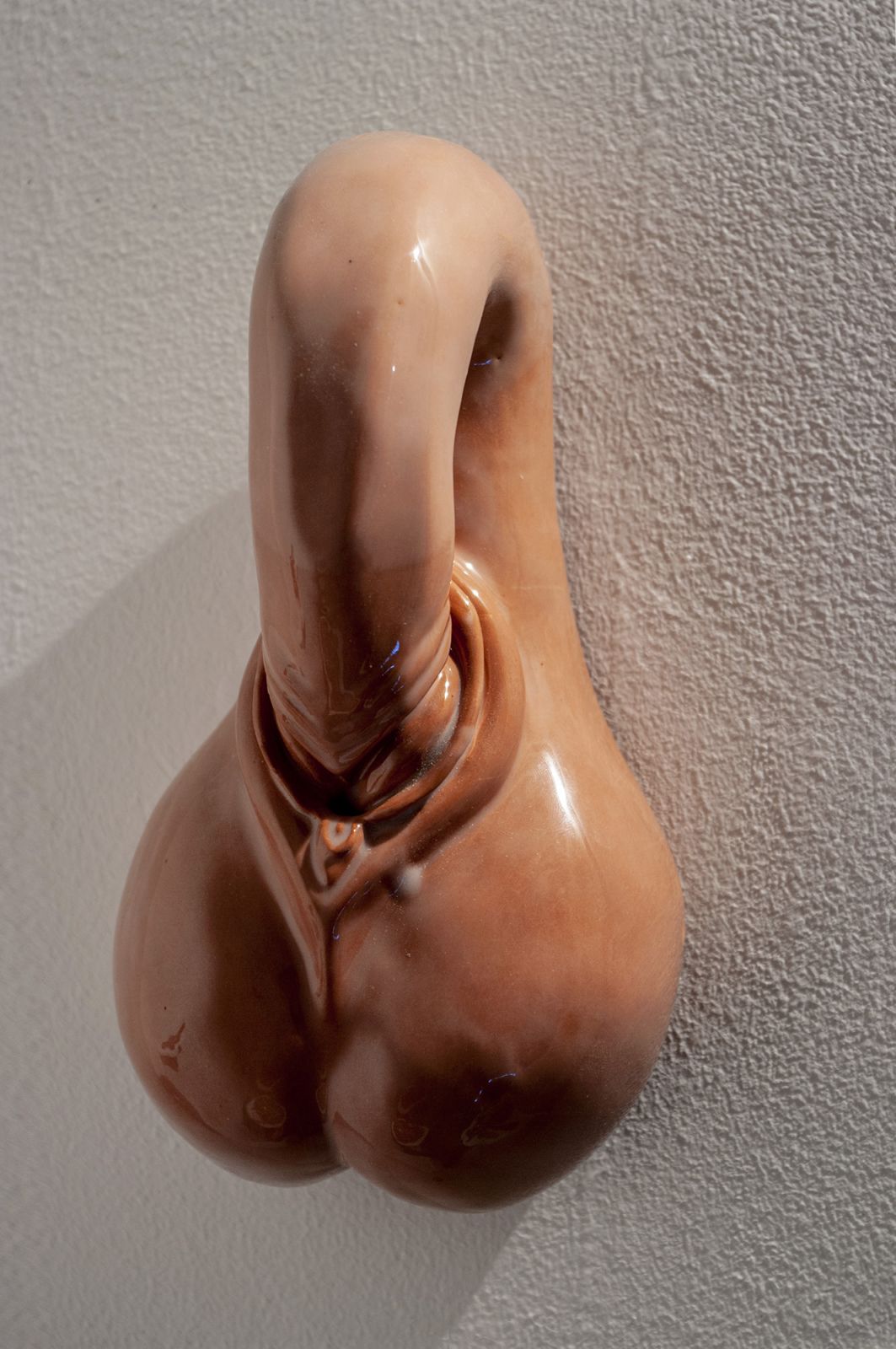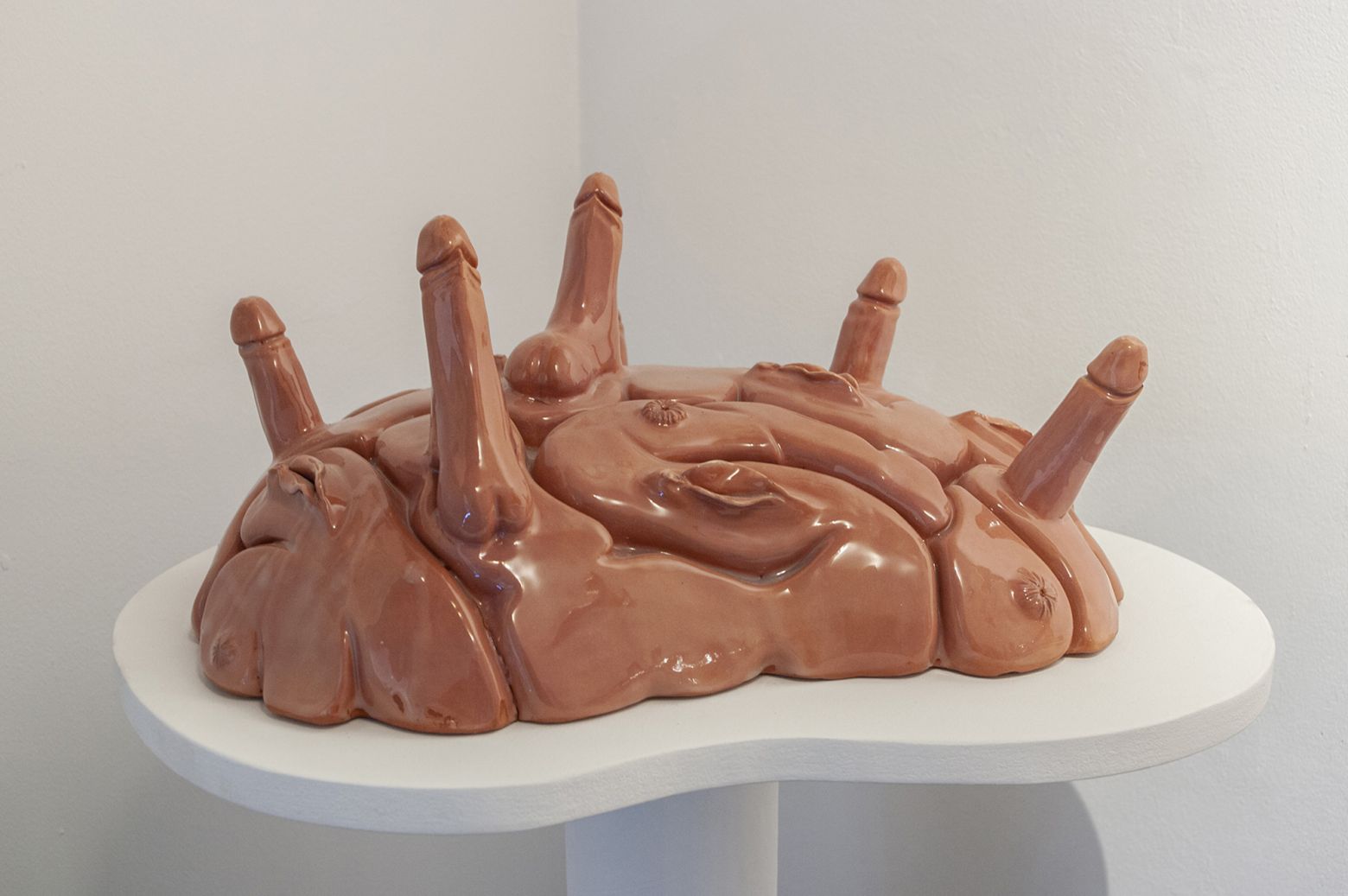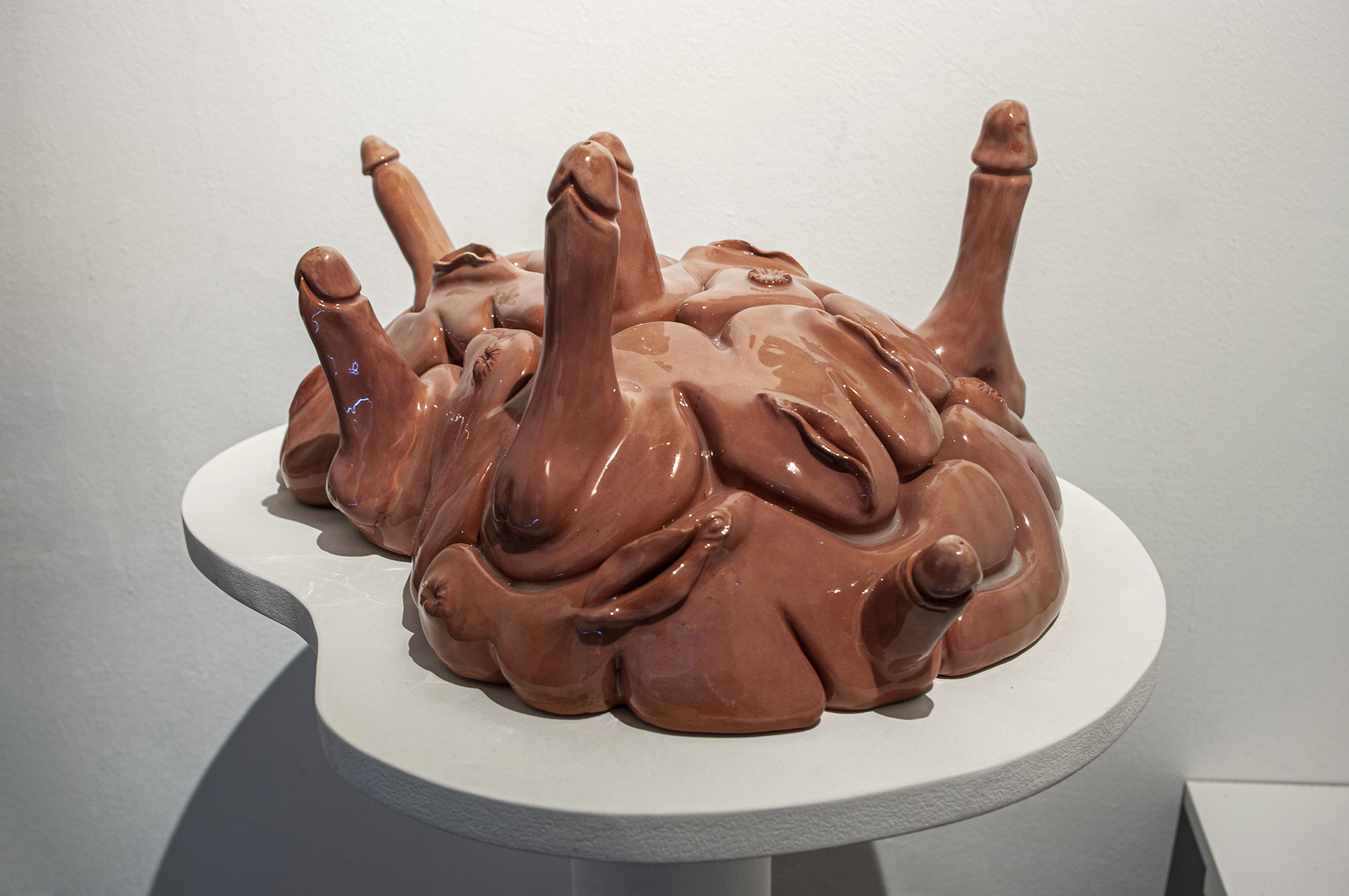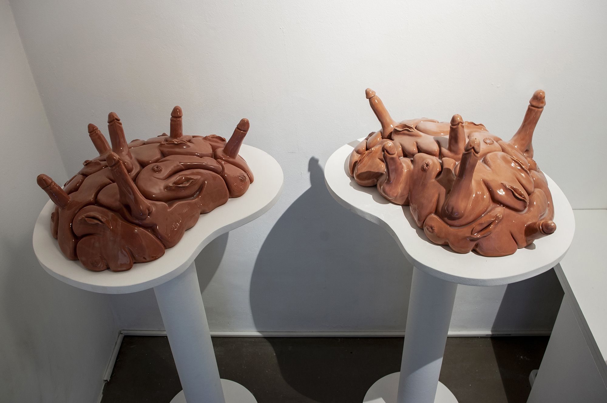 Sculptures de deux hémisphères d’un cerveau humain d’où surgissent différentes parties sexuelles du corps humain. Les organes naissent des circonvolutions du cerveau et sont autant de pensées, le cerveau étant le premier organe sexuel.