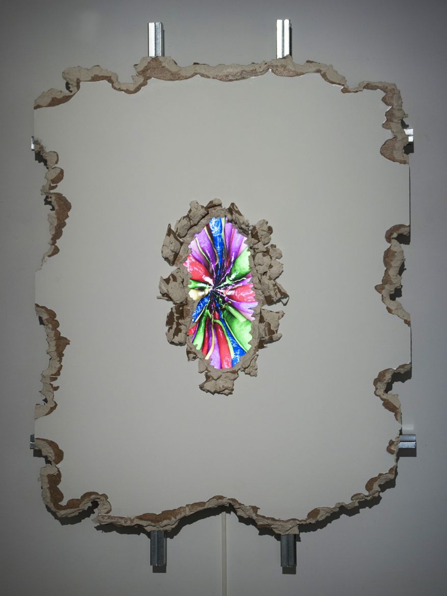 Plaque de plâtre, aluminium, écran vidéo, colle, câble, 3D
