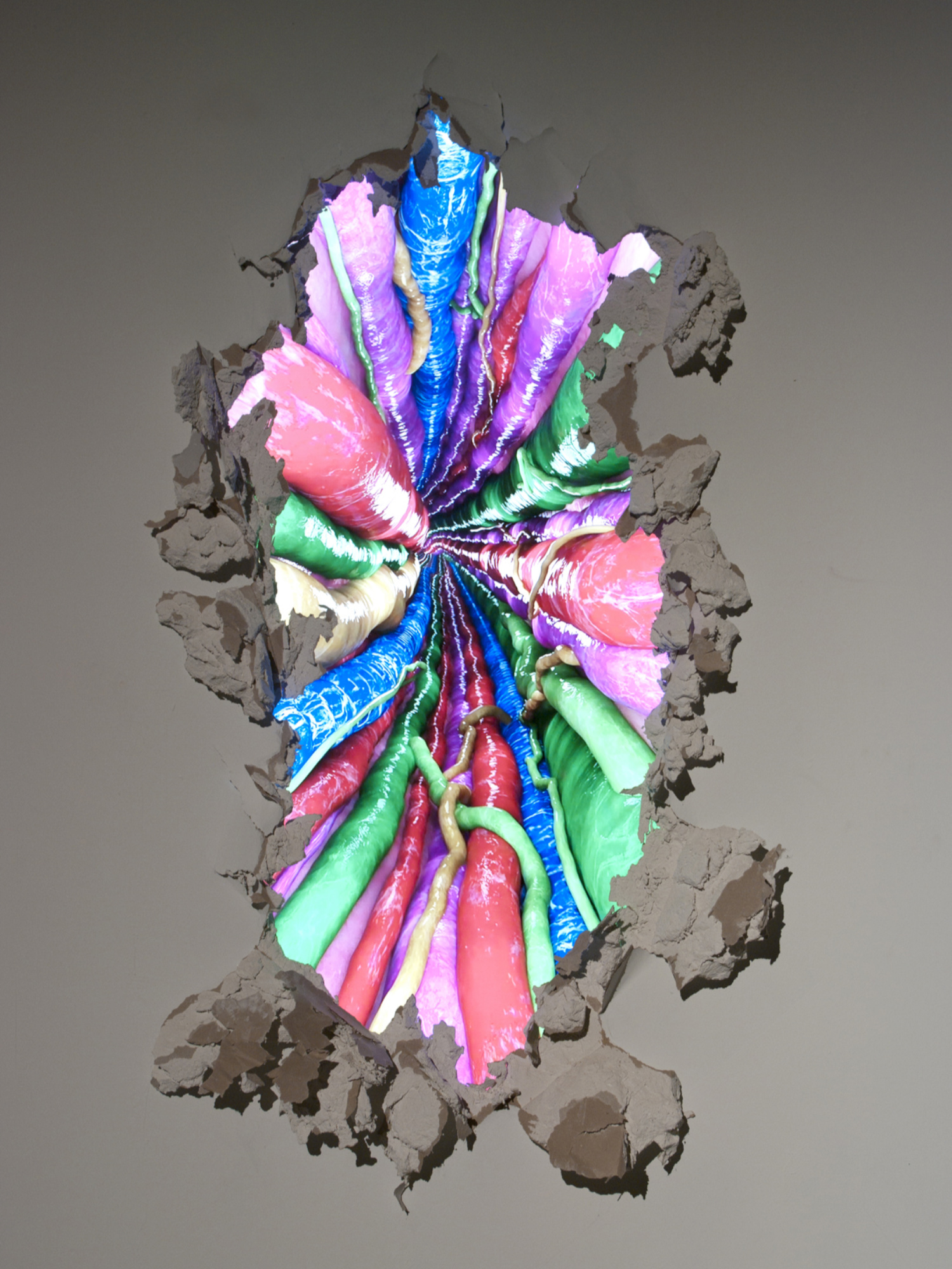 Un trou est réalisé dans un mur de façon brutale et laisse apparaître une image en mouvement. L’animation montre ce que pourrait renfermer l’intérieur de nos habitations où les différents tuyaux et câbles deviendraient vivants.