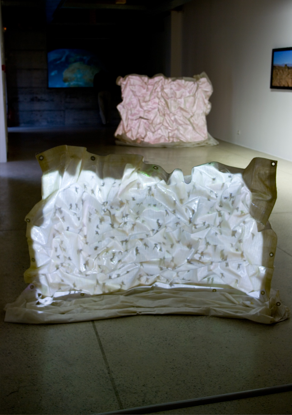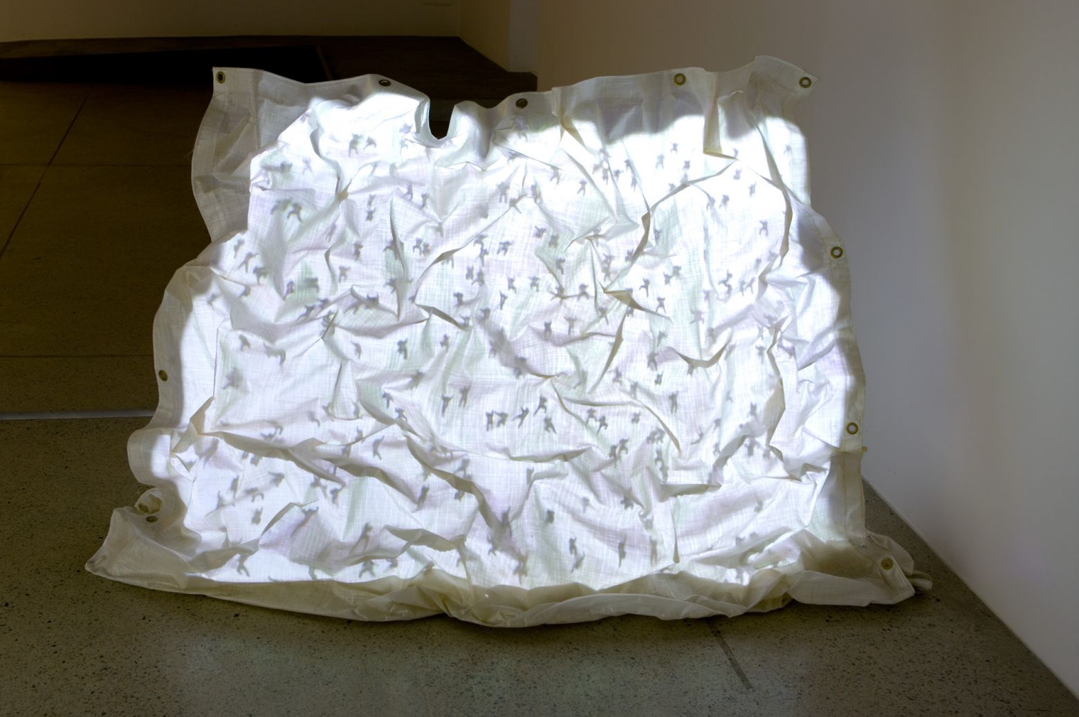 Rétro-vidéoprojection en boucle sur un fragment de bâche froissée et résinée. L'image projetée est celle d'une multitude de personnages qui escaladent la bâche. Ils disparaissent au fur et à mesure de leur progression.
