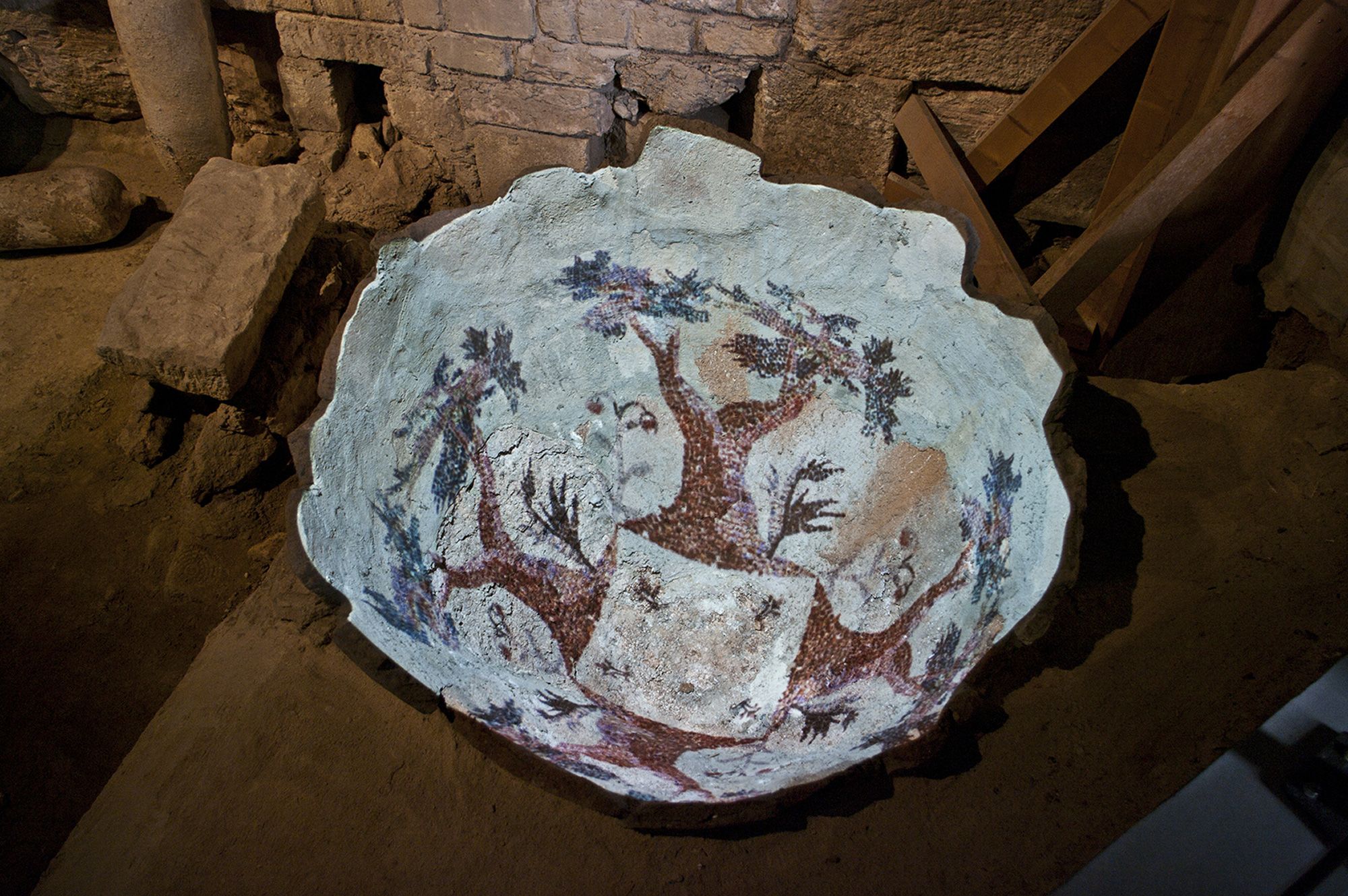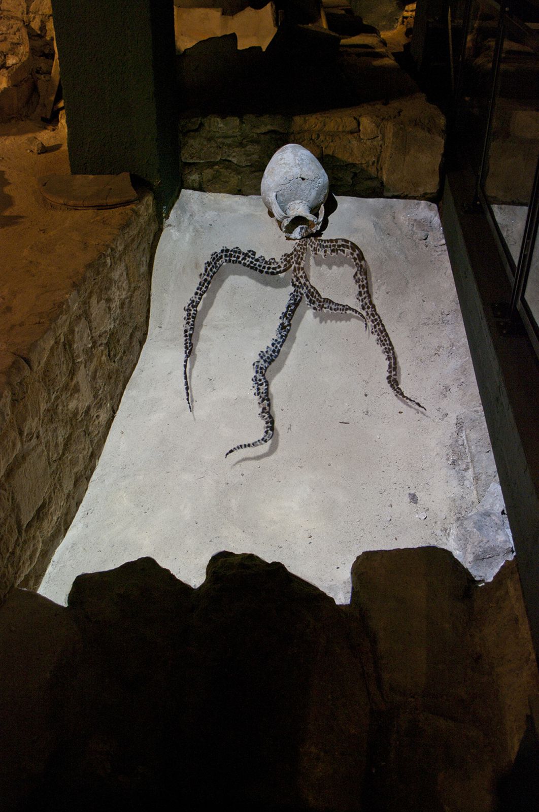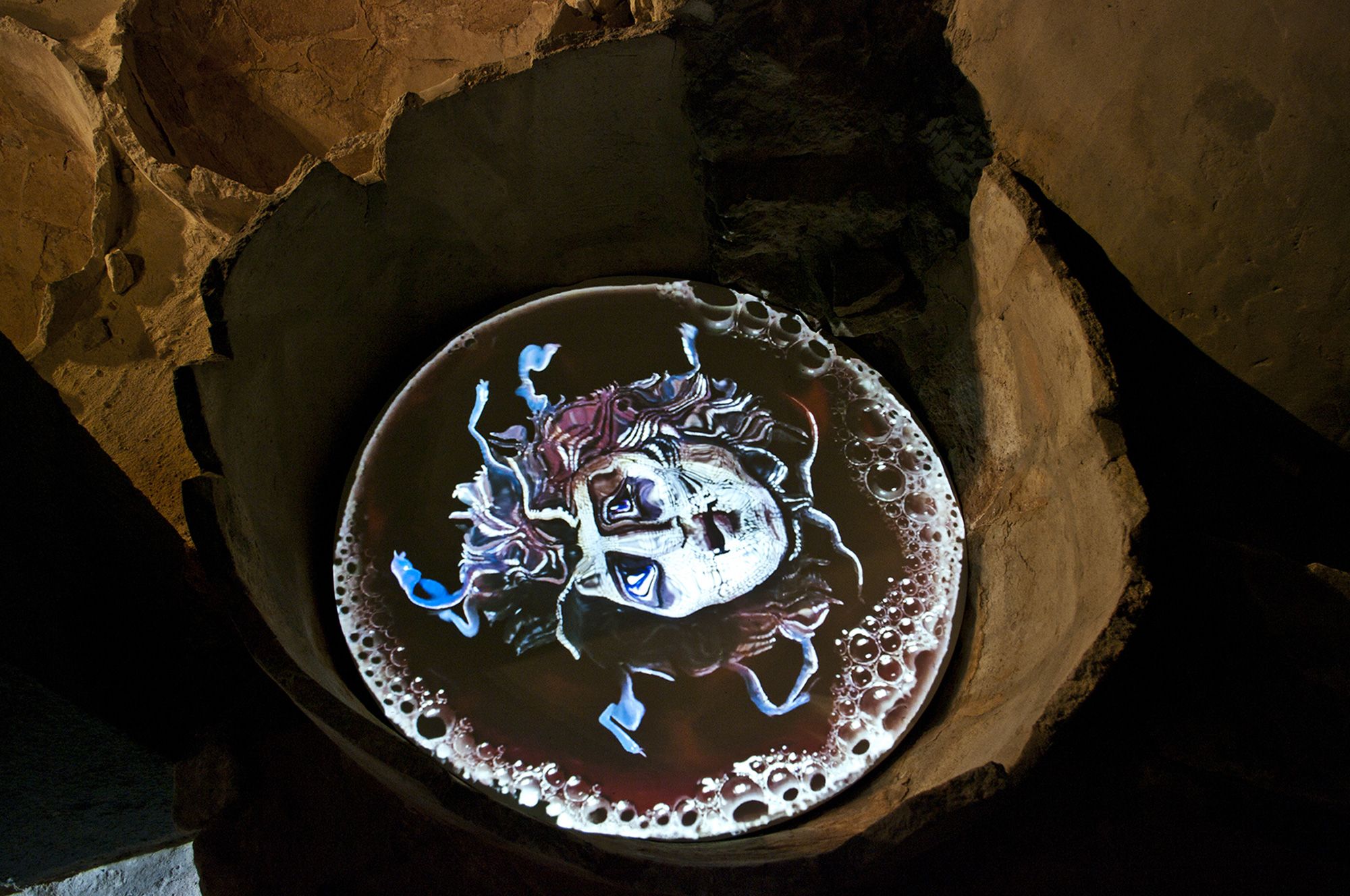 Intervention au Musée des Docks à Marseille. Des vidéoprojecteurs sont disposés au dessus de certains dolia du musée. Au fond de chacun est projetée une animation inspirée de mosaïques romaines. Les sujets habitent ces réservoirs antiques en se fondant en eux dans un jeu de temporalités et de matières.