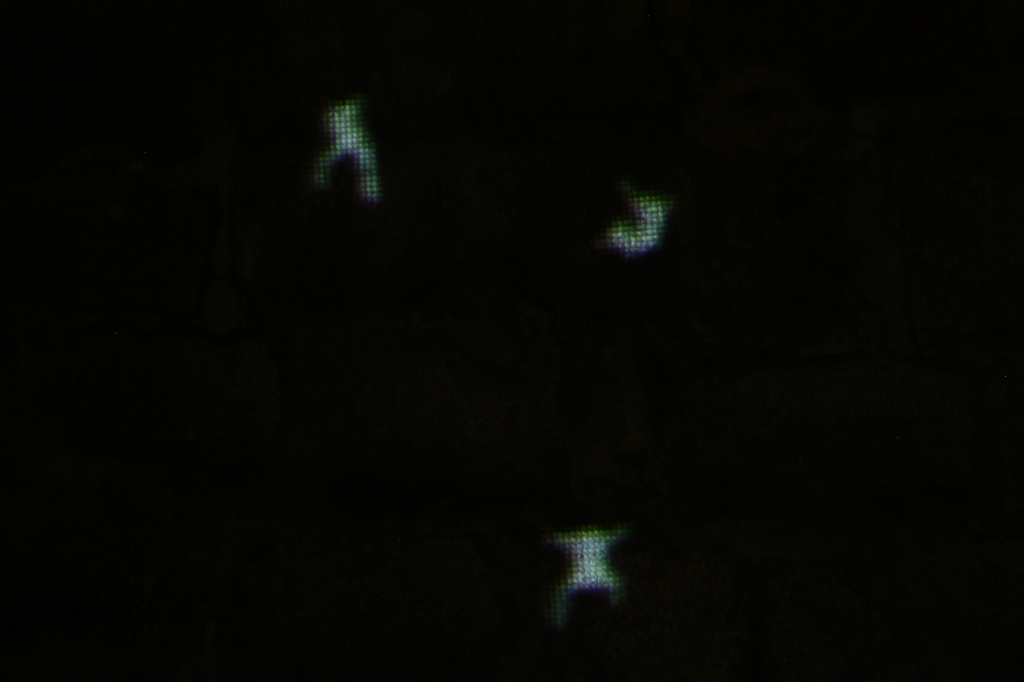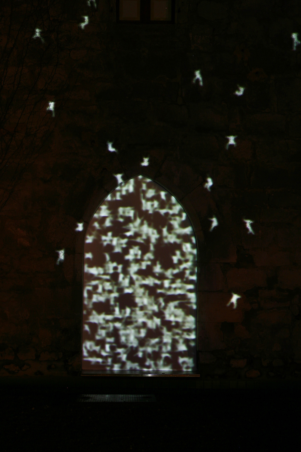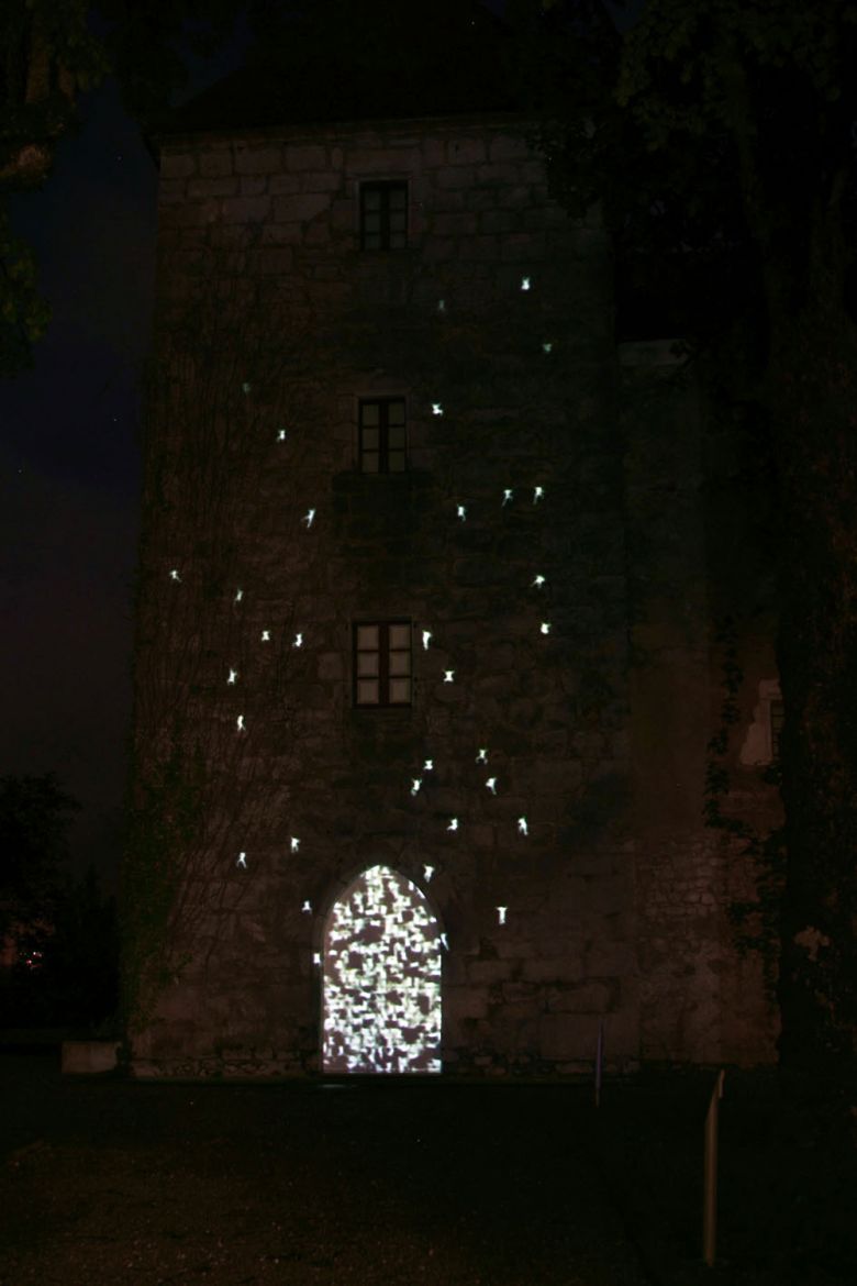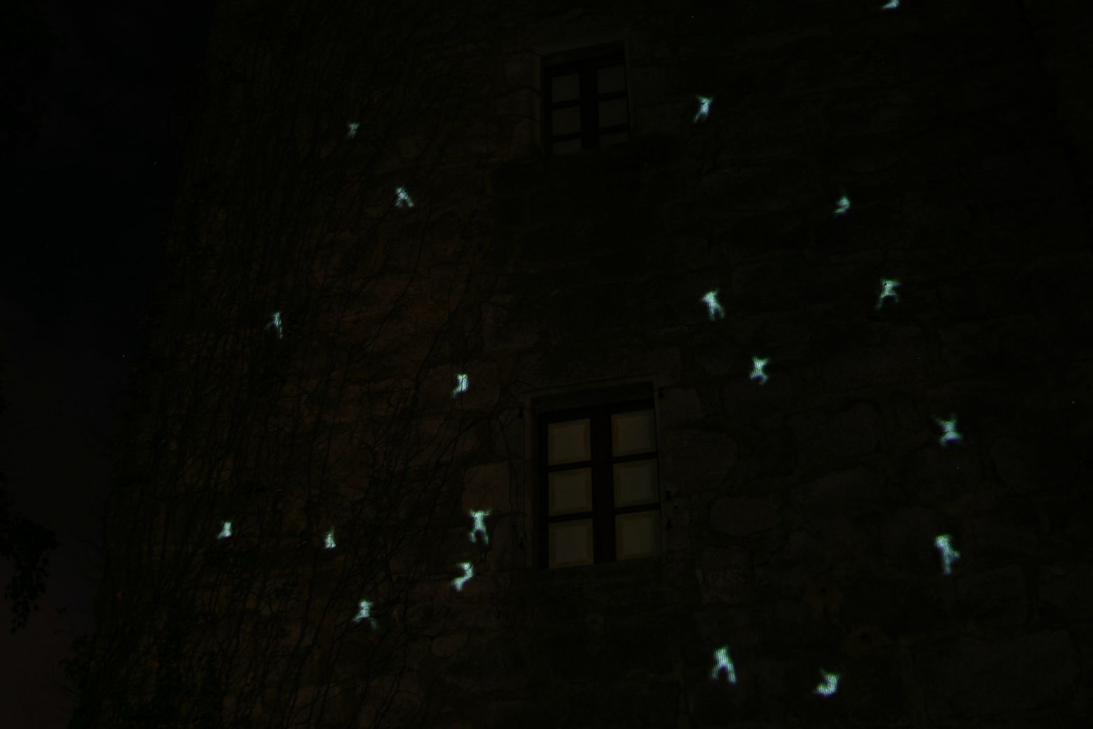 Projection sur la façade de la Fondation Salomon à Alex lors de la nuit des musées, une multitude de personnages grouillent à l’intérieur de la tour et sont visibles par une porte. Certains personnages s’échappent pour partir à l’assaut de la façade, au fur et à mesure de leur efforts les silhouettes disparaissent.