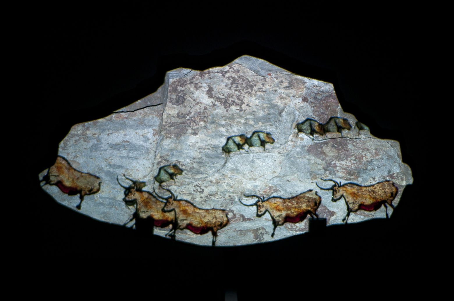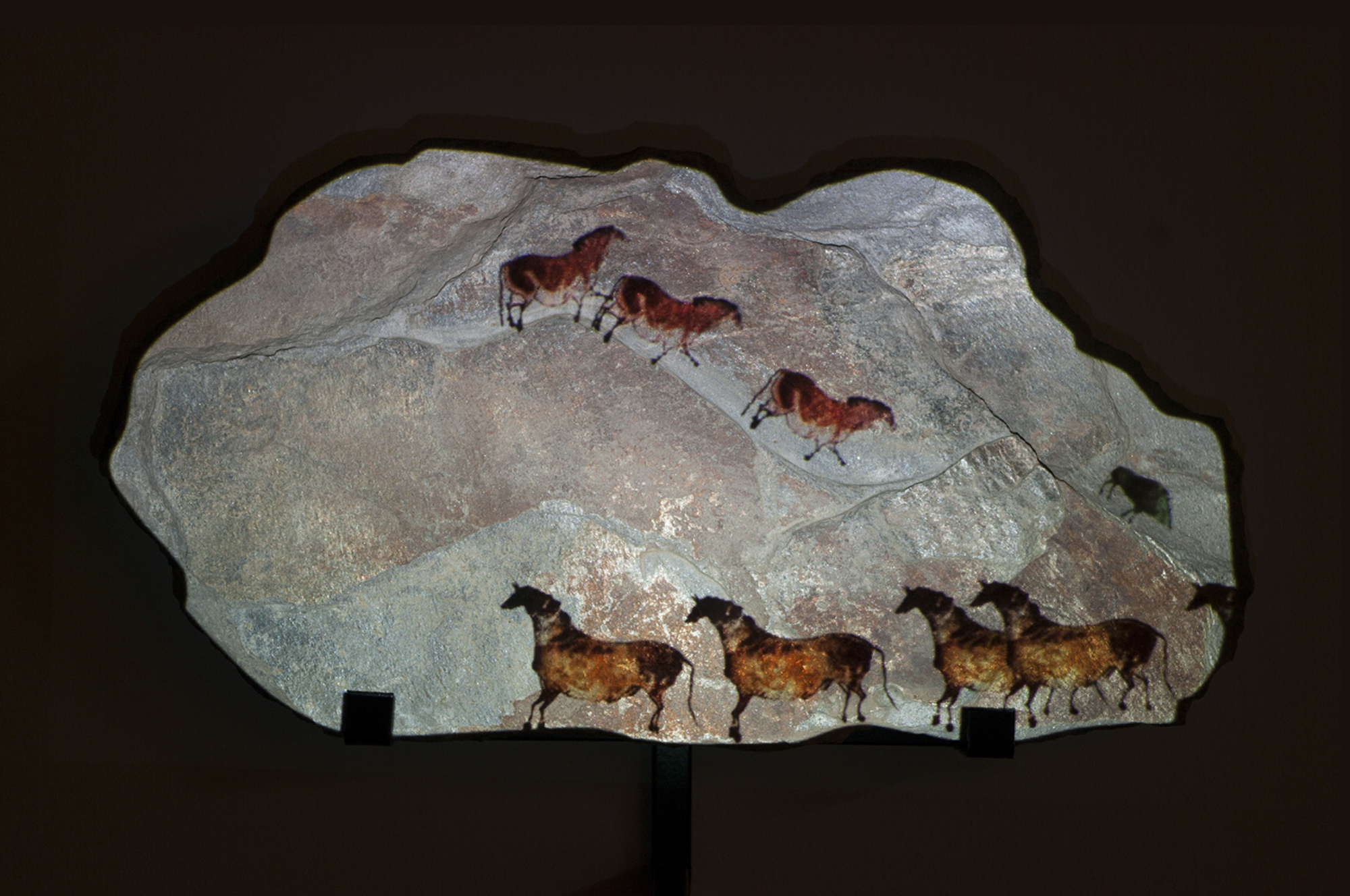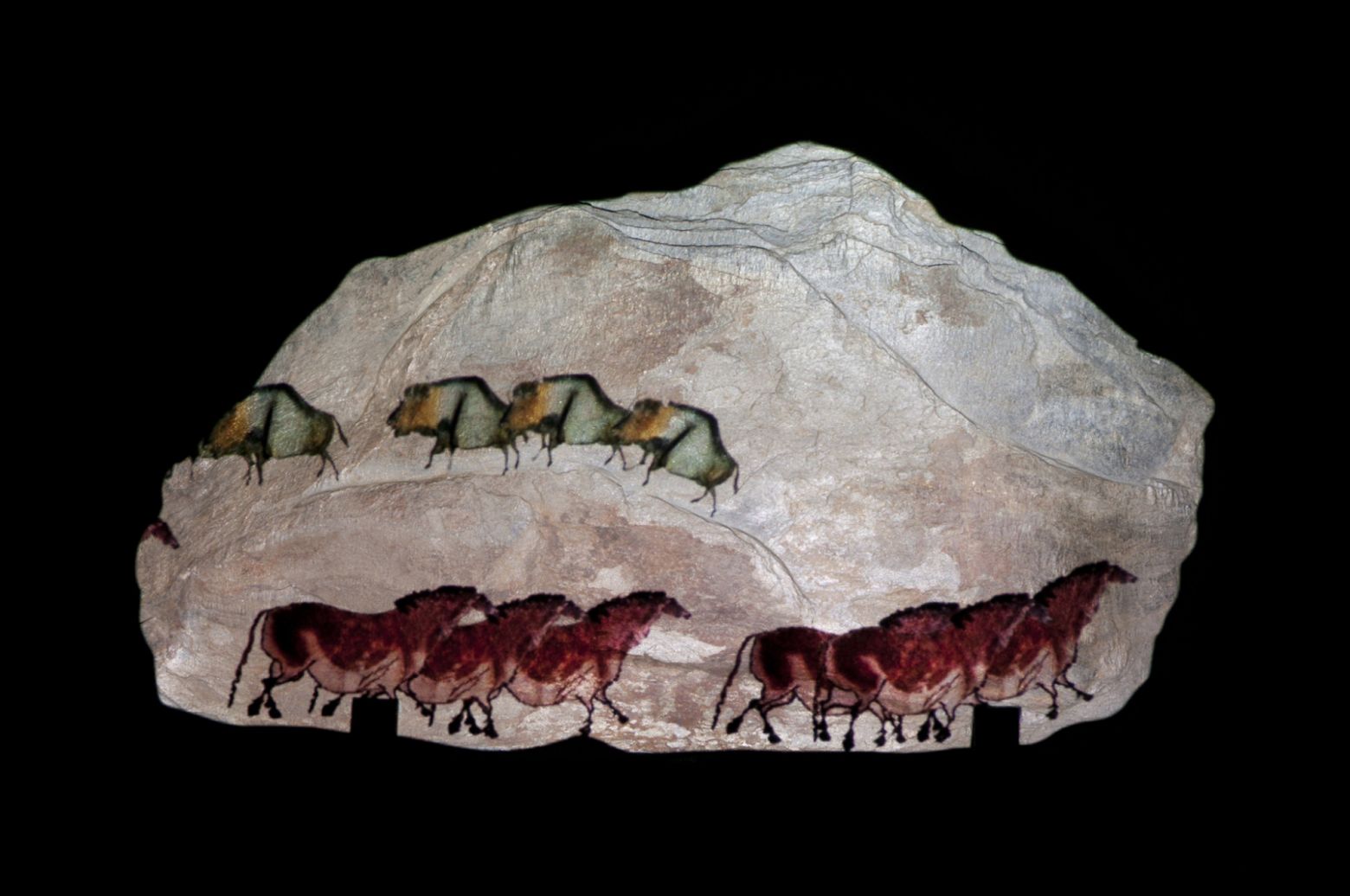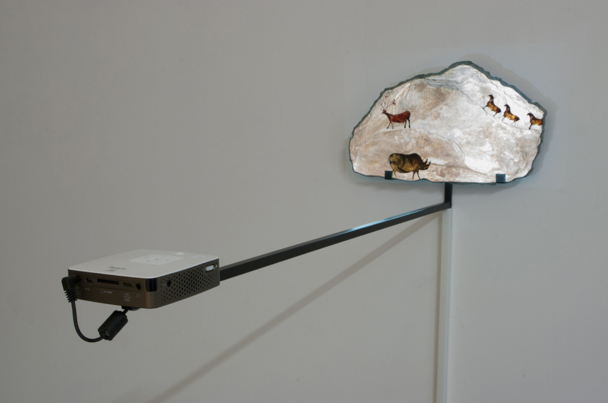 Une animation d’un bestiaire emprunté aux peintures rupestres de la grotte du Pont-d'Arc et de la grotte de Lascaux est projetée sur une lauze. La déambulation des animaux emprunte les anfractuosités de la pierre comme autant de chemins d’un paysage intemporel.