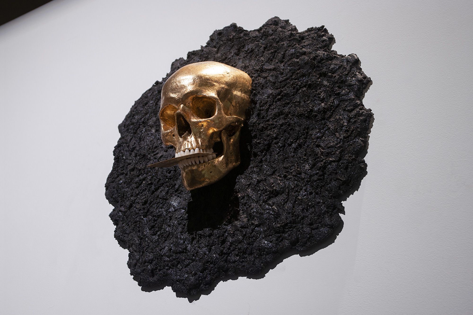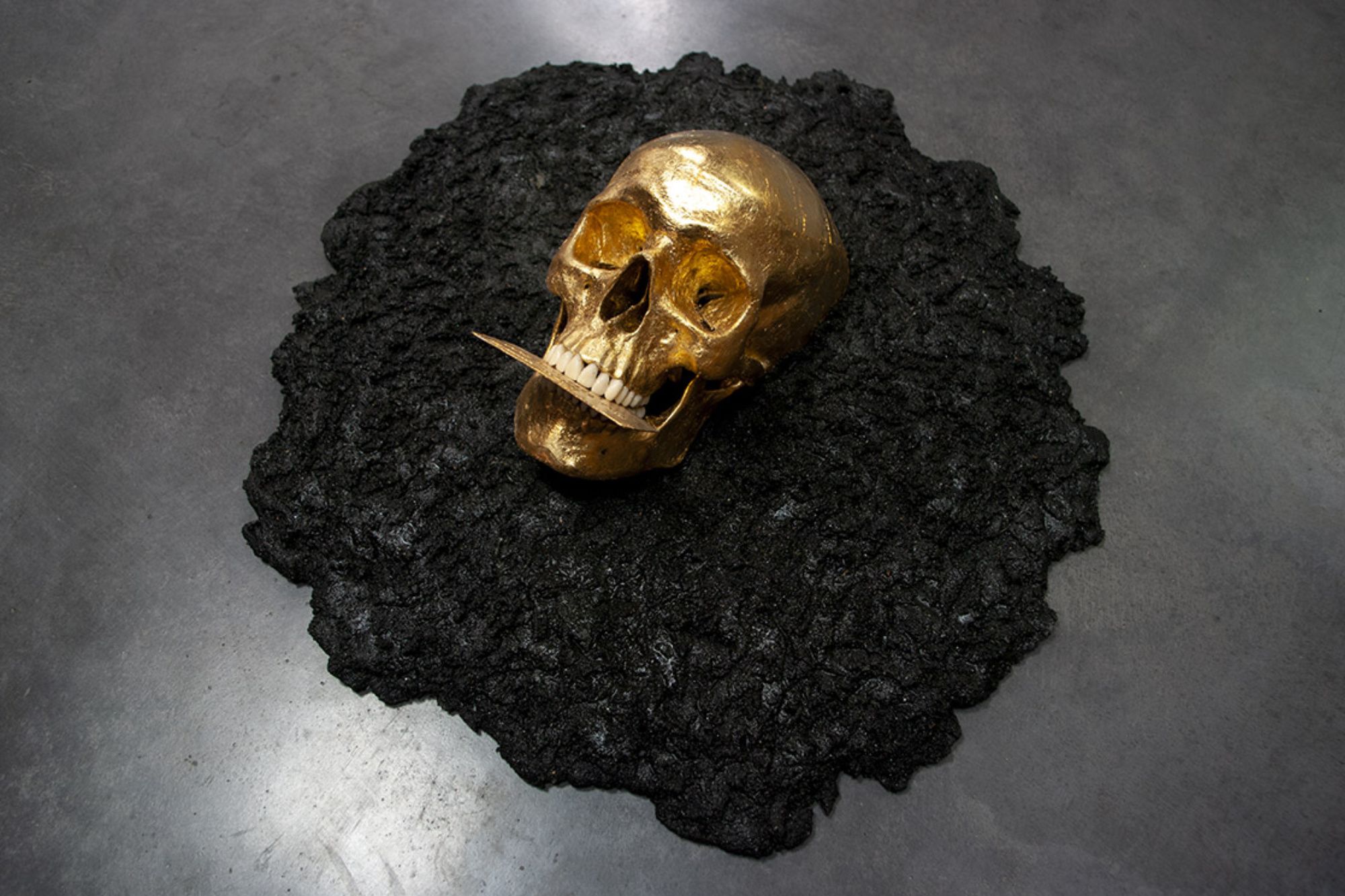 Un crâne recouvert de feuilles d’or gît dans une matière stérile, il tient entre ses dents une carte de crédit.