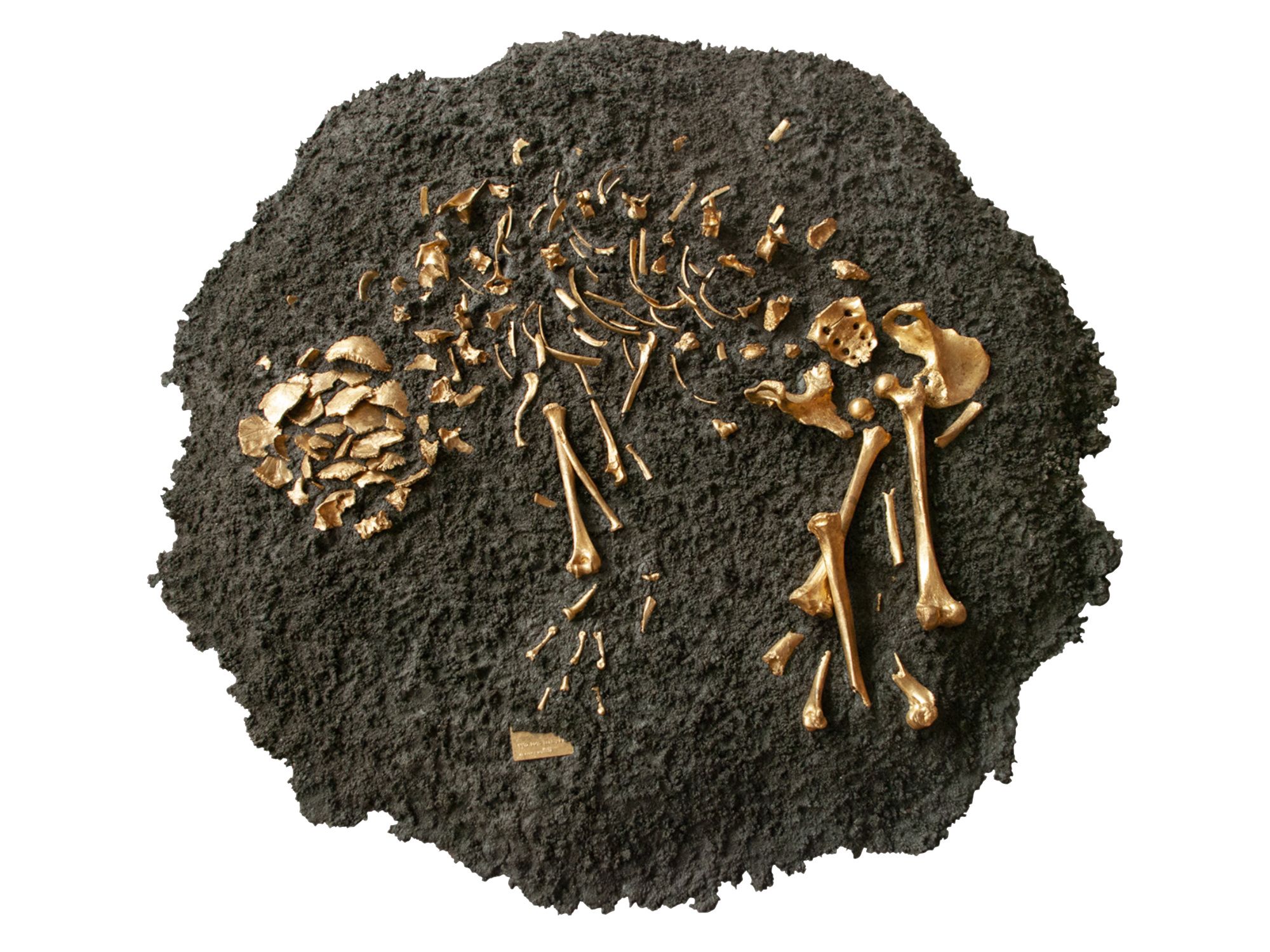 Des os humains, recouverts de métal doré, sont placés dans une matière stérile. Ils symbolisent l’avidité mercantile de l’humanité pour l’or, dans une vision post-apocalyptique.