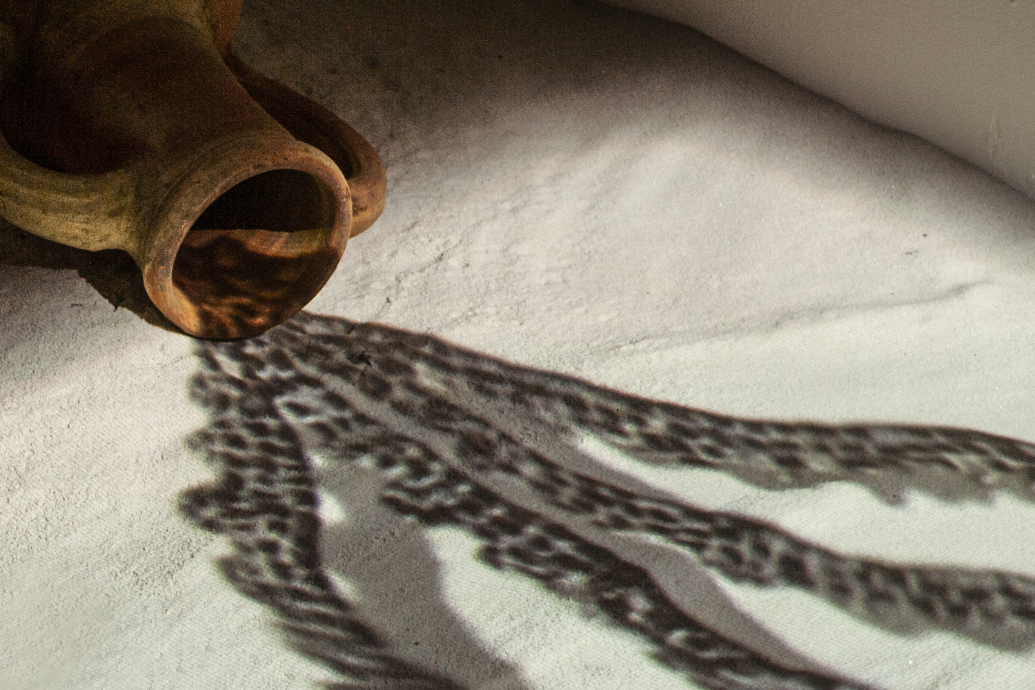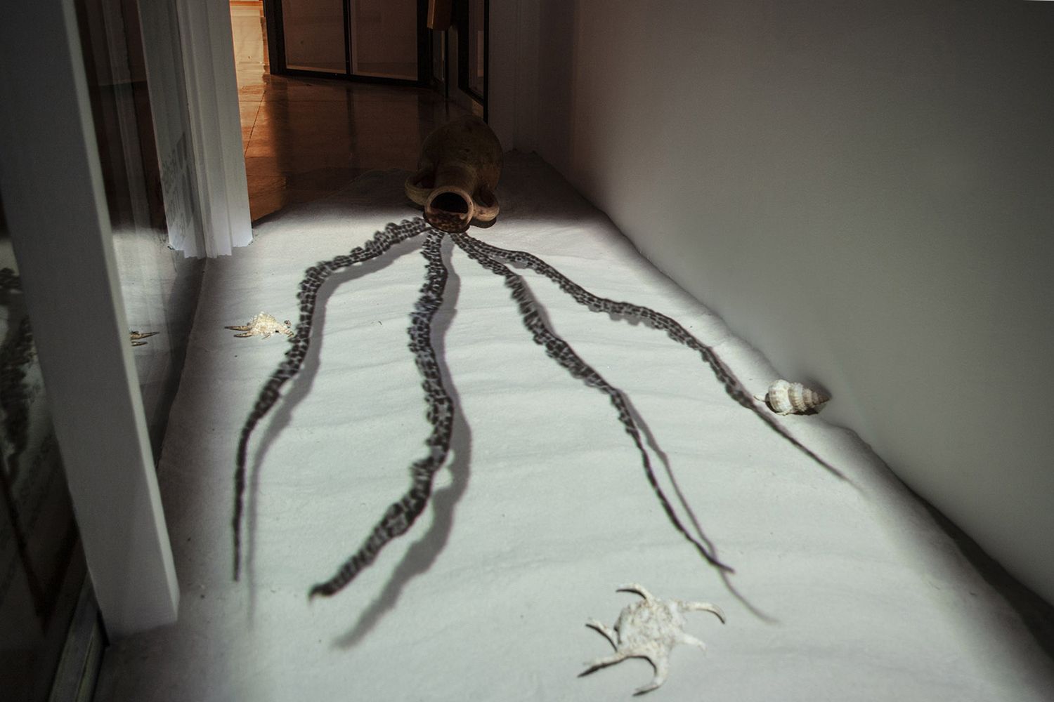 Projection vidéo de l'animation d’une pieuvre réalisée à partir de mosaïques romaines. Elle surgit dans un décor de fond marin, puis se rétracte dans sa cachette.