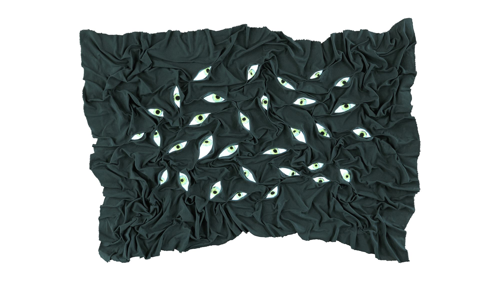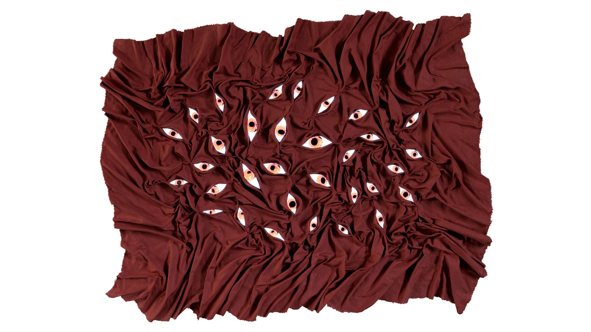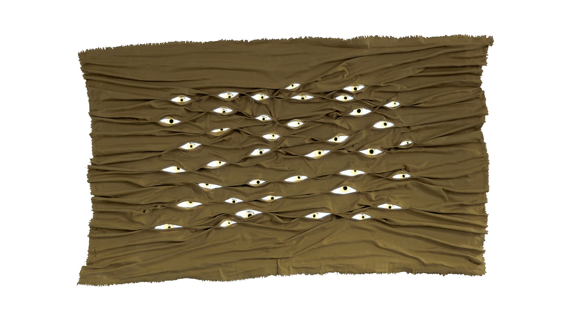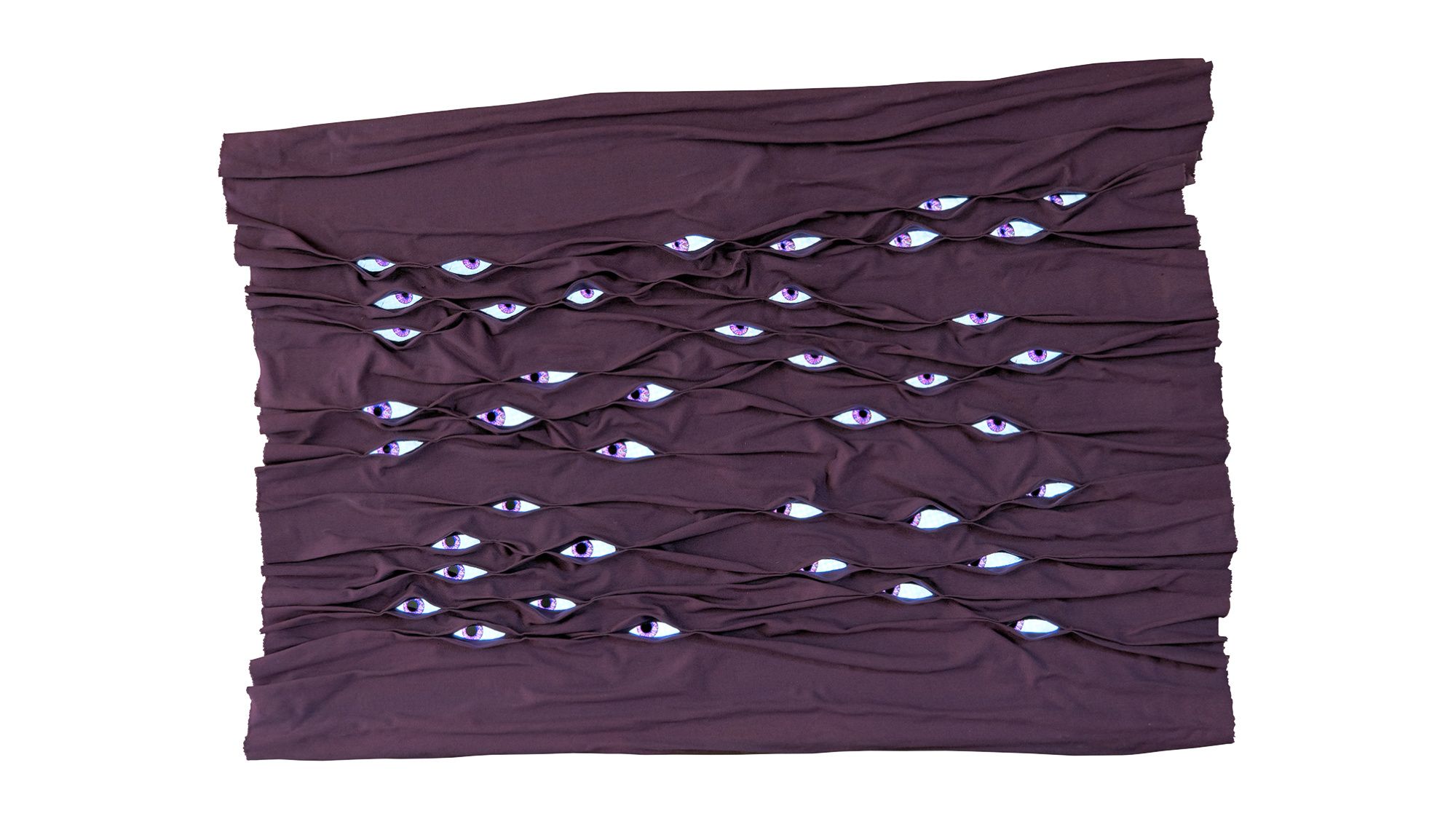 Dans les plis d’un tissu monochrome apparaissent des yeux dessinés par les circonvolutions de l’étoffe. Les pupilles ont la couleur de la toile. Ils évoquent une forme de peinture et se jouent du rapport qu’ils entretiennent avec le spectateur.