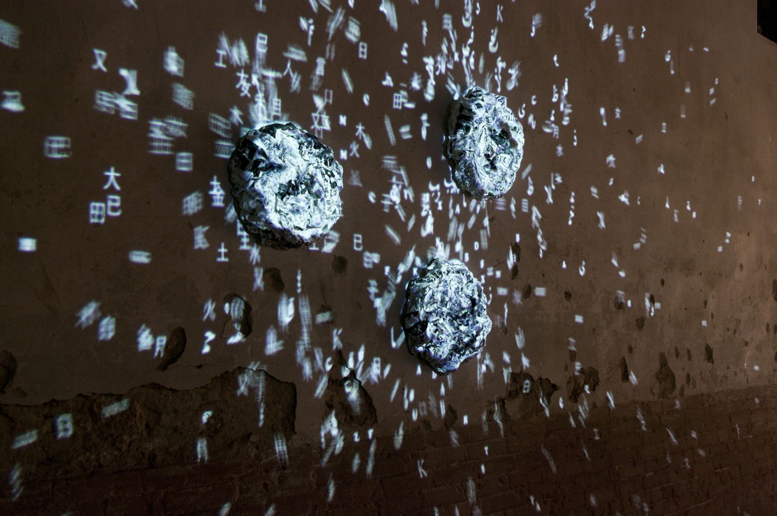 Une projection vidéo est diffusée sur des journaux provenant de plusieurs pays, en différentes langues et façons d’écrire. Les lettres, idéogrammes et calligraphies s’échappent des pages pour se libérer, spatialement et poétiquement, de leurs conditions d’informations liées aux catastrophes du monde.