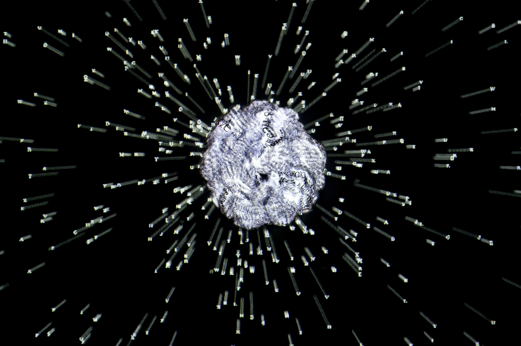 Papier journal froissé, colle, acier, vidéoprojecteur