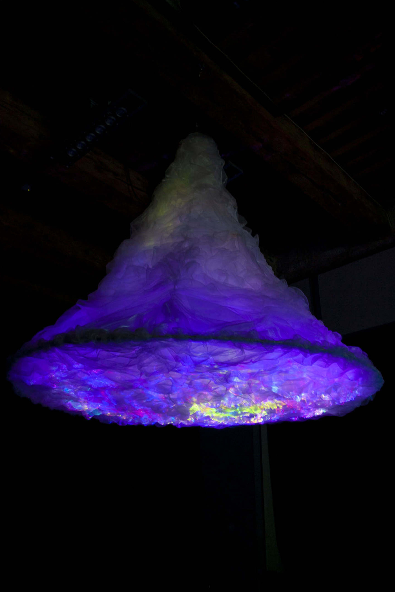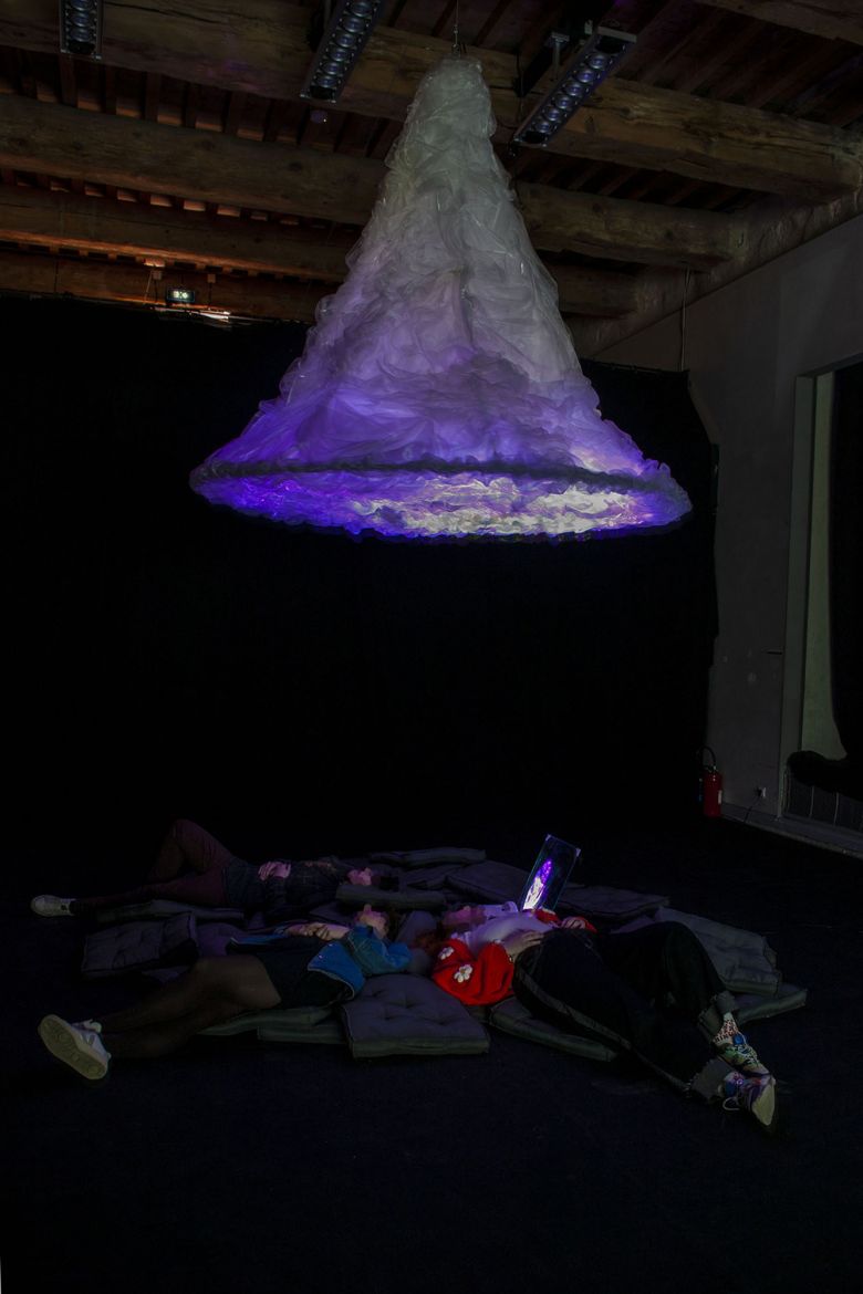 Une sculpture réalisée en organza, composée d'une multitude de couches superposées, est suspendue au plafond dans un vaste espace. Les visiteurs sont invités à s’installer sur des coussins disposés sous la sculpture, où est projetée une animation de la Voie lactée tourbillonnante et traversée par des événements cosmiques. La projection sur l’organza translucide crée un effet de relief de la vidéo et invite le regard à plonger dans l'œuvre.