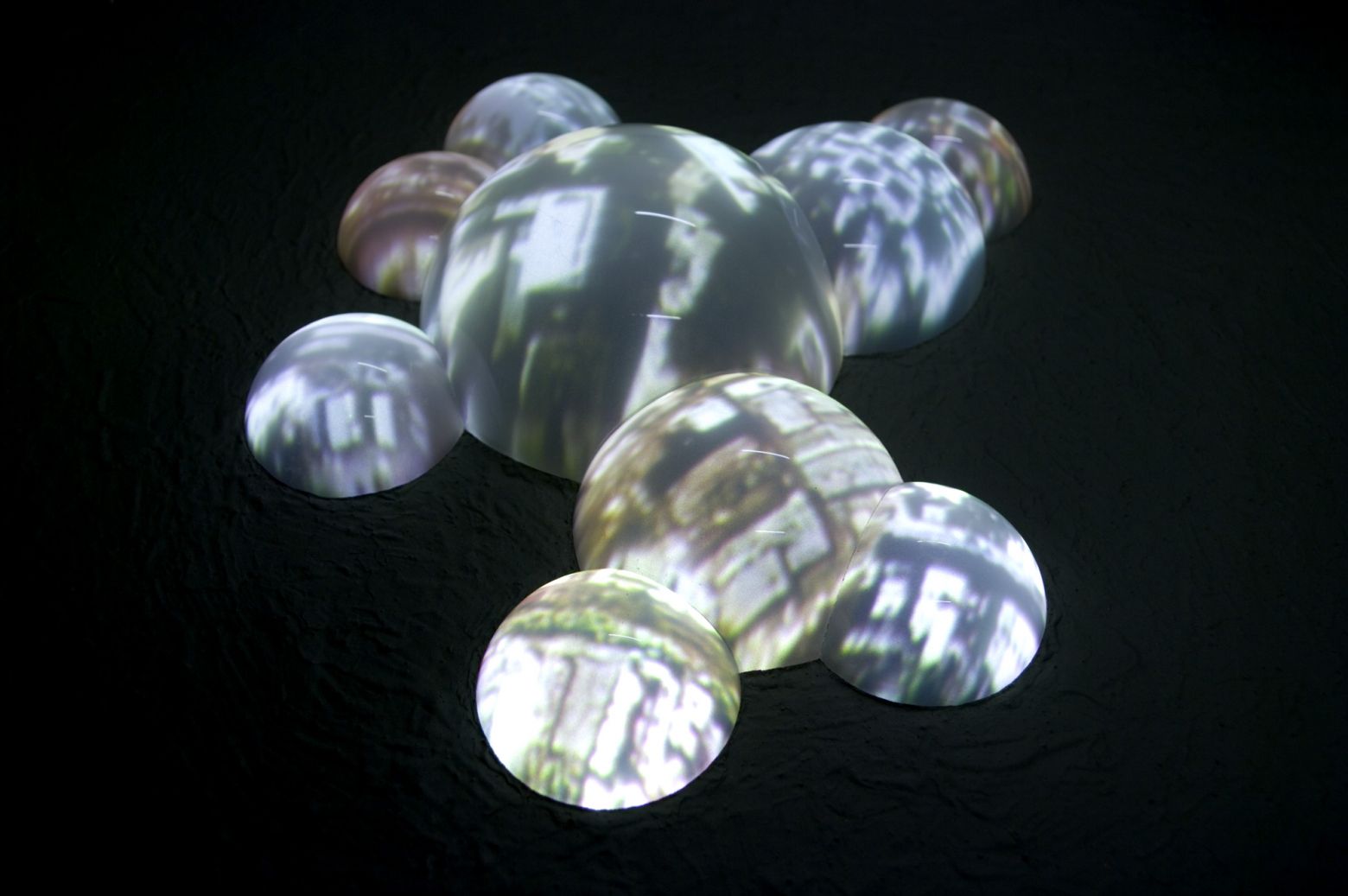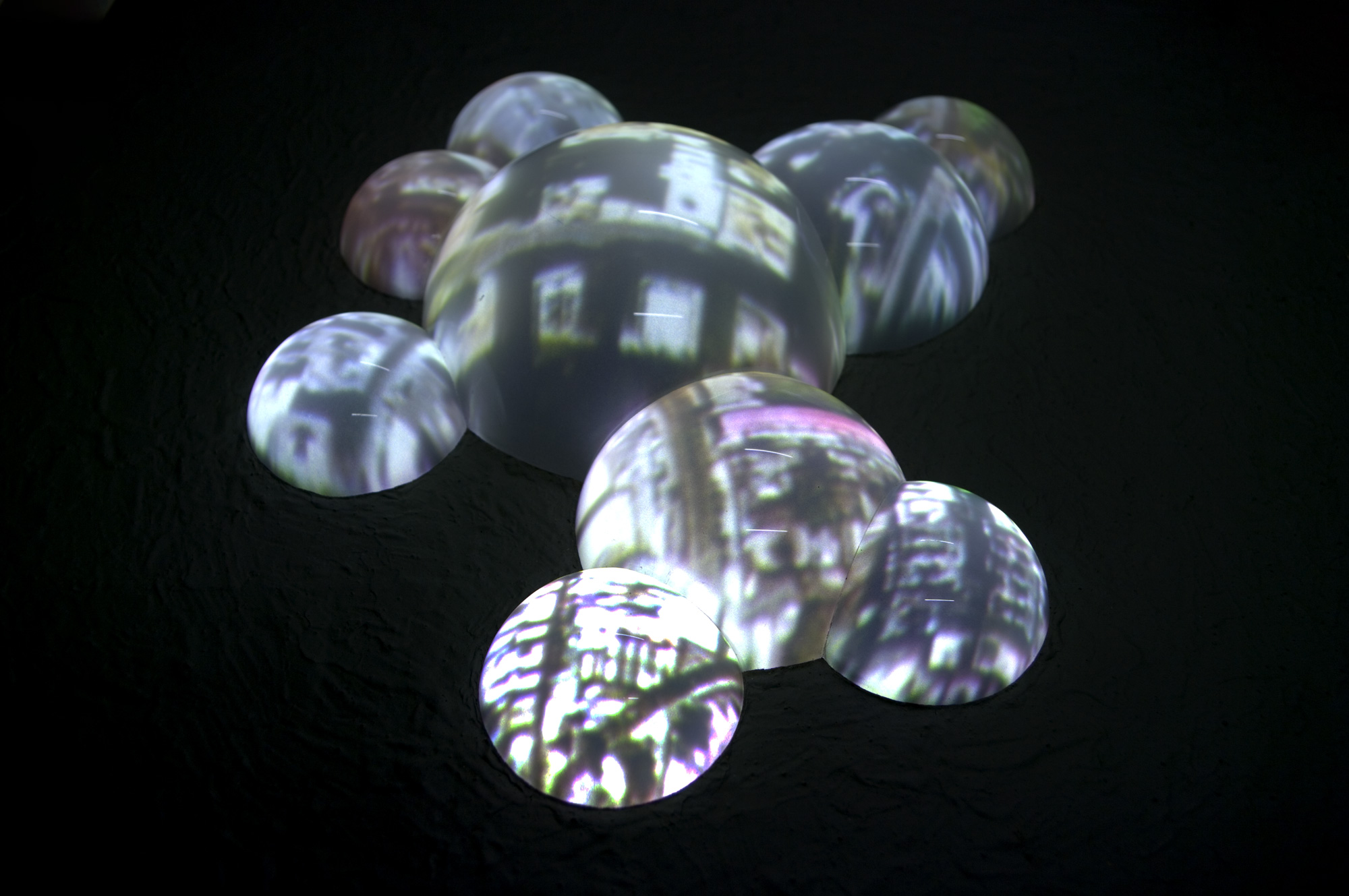 Rétro-vidéoprojection en boucle à l'intérieur d'hémisphères en Plexiglass de différentes tailles, agglomérés les uns aux autres sur le plat d'un socle en bois. Les images projetées sont celles de villes très animées. Elles créent l'illusion que les villes tournent sur elles-mêmes. Les images ayant servi à la réalisation de cette pièce sont extraites de Google Earth.