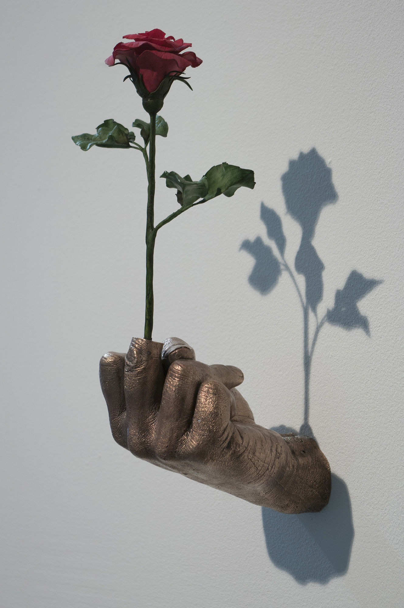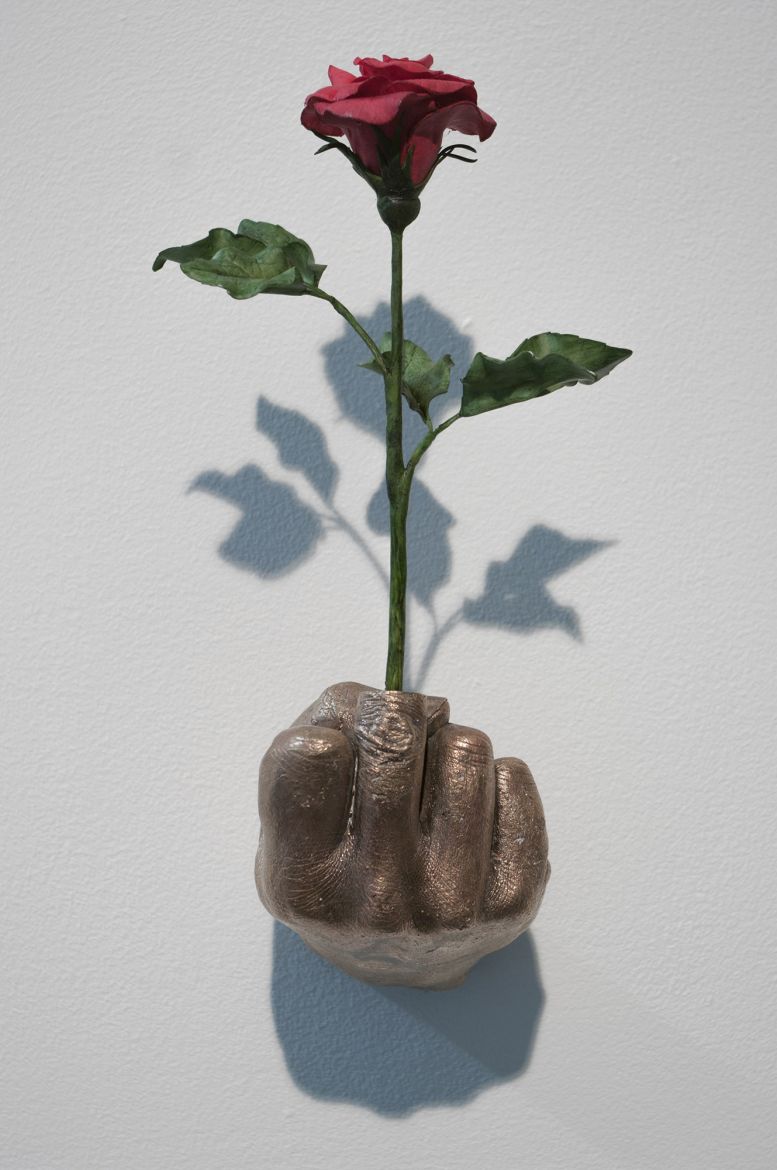 Sculpture en bronze "éternel" d’un "fuck off" où le doigt est remplacé par une rose en fragile porcelaine.