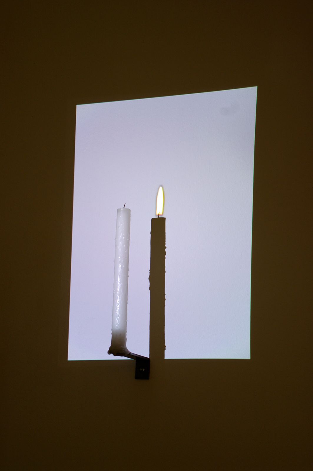L'image projetée est une flamme qui vacille et qui vient se superposer à l'ombre réelle de la chandelle placée contre le mur.